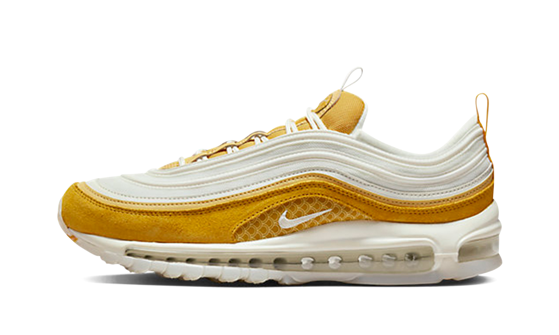 The Nike Air Max 97 “Koi Fishâ€?is a colorway of the classic running shoe that celebrates the Koi fish. also known as the Nishikigoi. The Air Max 97 debuted in 1997 and has since become one of the most popular lifestyle shoes in footwear. On the “Koi Fishâ€?colorway. Nike gives the shoe a makeover dedicated to fish known as Nishikigoi in Japan. The design features a white mesh base with tonal wavy leather overlays. A wheat-colored suede mudguard contrasts the appearance of the shoe. Special scale details are found around the white Swoosh branding on the sides above the white foam midsole. A koi fish print appears on the insole. Release date: August 20. 2022