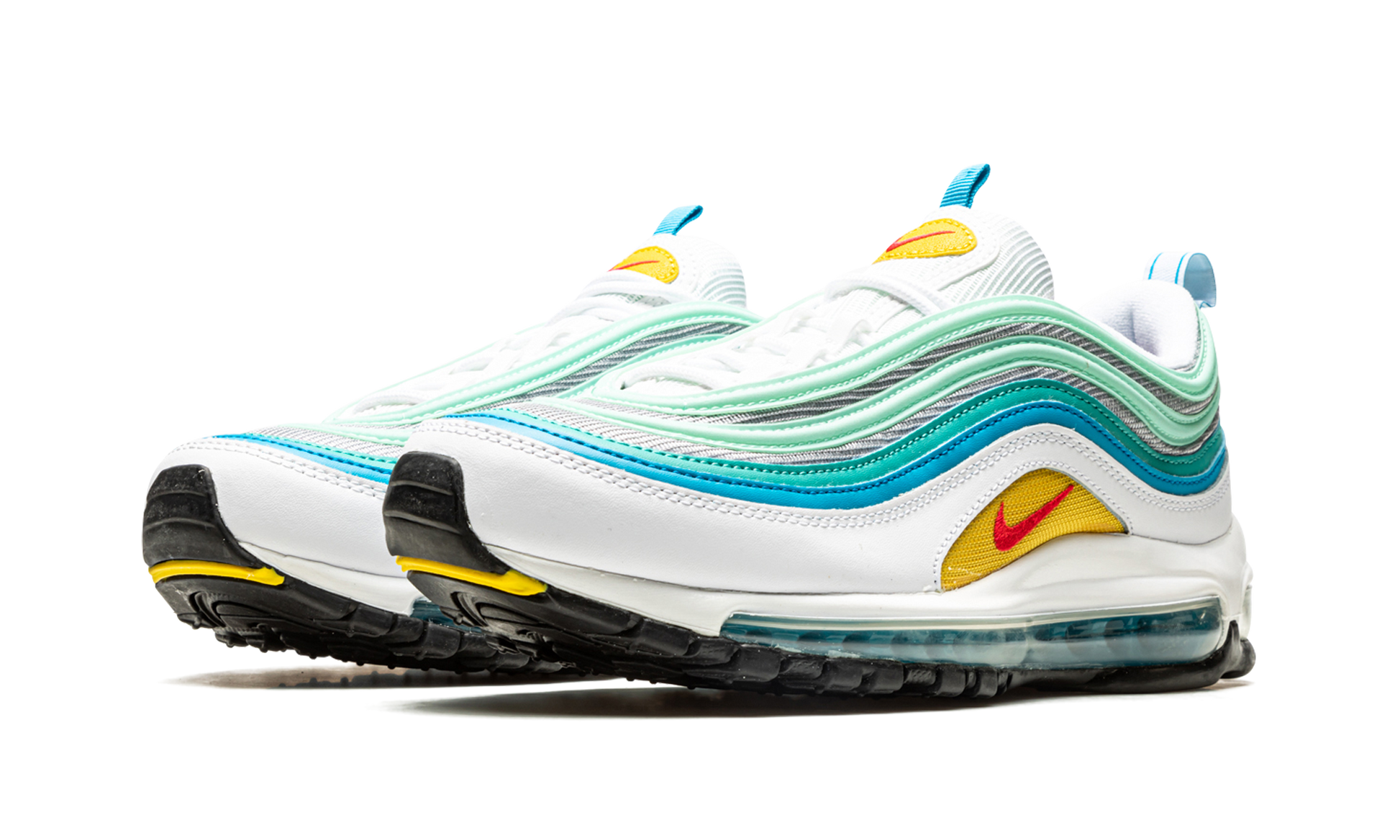 The Nike Air Max 97 “Spring Floralâ€?is an April 2022 release that updates the retro performance running shoe with a spring-inspired color block. The “Spring Floralâ€?is complete with a grey mesh base that allows for the mint green and blue wavy leather panels along the upper to attract attention. A white leather mudguard appears above the full-length visible Max Air cushioned midsole. Inside of the mudguard. a fiery red embroidered Swoosh logo is affixed to the yellow textile overlay. The same red and yellow Swoosh and overlay color scheme appears on the tongue. Release date: April 1. 2022