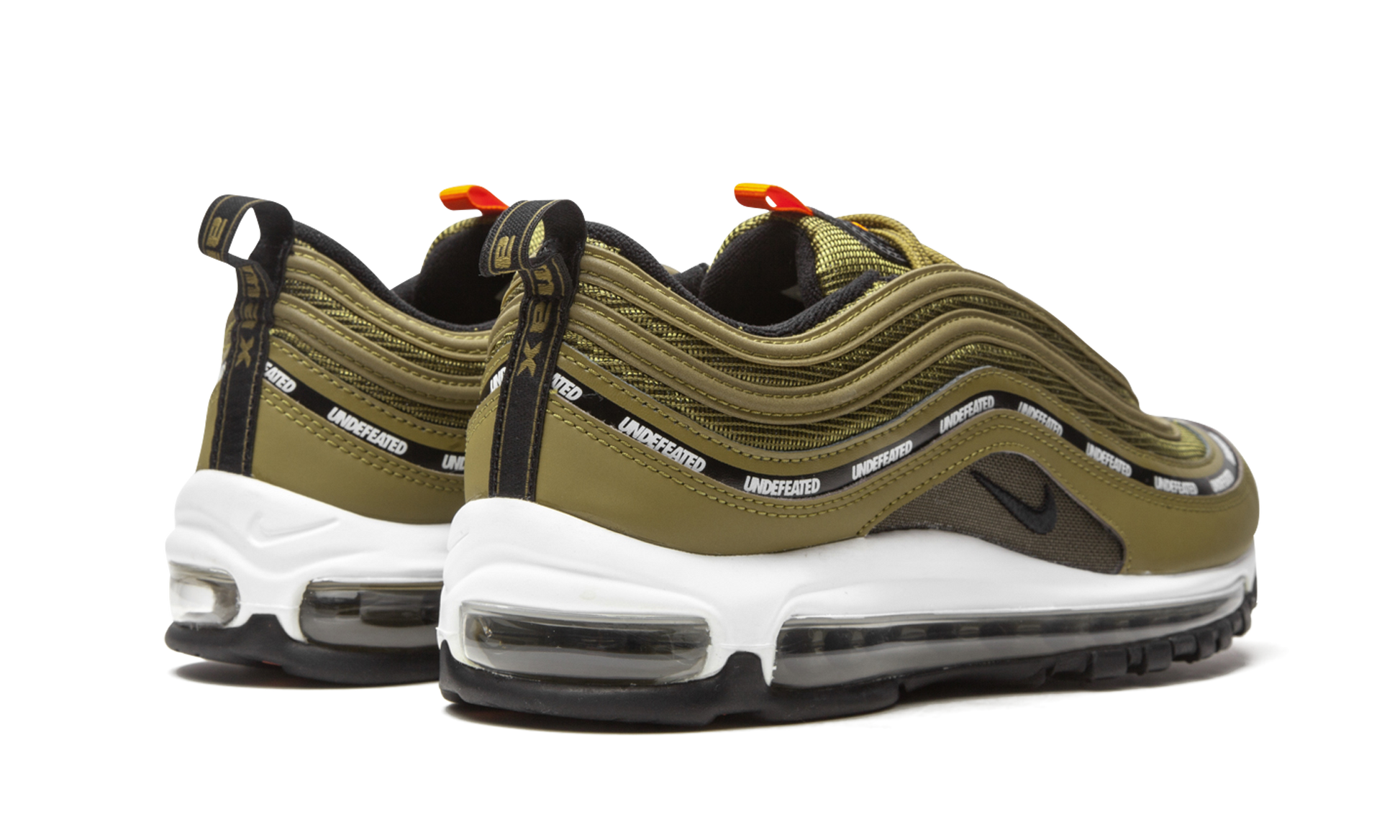 The Undefeated x Nike Air Max 97 “Militia Greenâ€?is a Holiday 2020 collaboration between the Los Angeles based streetwear and sneaker retailer and Nike on the performance runner. In 2017. Undefeated and Nike teamed up for a collection of Air Max 97s for the ages. and the “Militia Greenâ€?is unapologetically based on the beloved “Oliveâ€?colorway that originated from that collaboration. The upper features a similar military inspired look with Militia Green wavy side panel stripes and underlying mesh. Undefeated branding in white text is located on the stripe above the premium olive green leather mudguard. An Orange Blaze embroidered Swoosh can be found on the circular black synthetic nubuck overlay on the green mesh tongue and mini black Swoosh detailing appears in the center of the mudguard between the bottom wavy panel and white midsole. Reflective material is applied to the aforementioned wavy panels for a classic look.