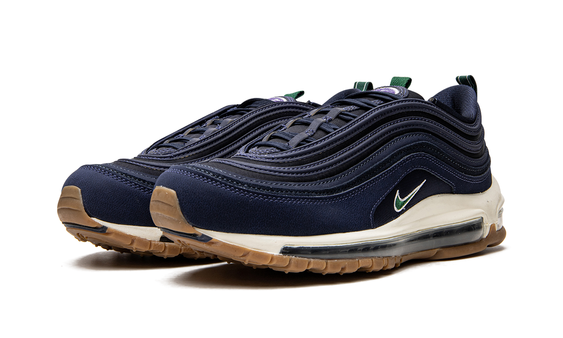 The Nike Air Max 97 “Letterman Packâ€?is a colorway of the vintage running shoe inspired by classic letterman varsity jackets. The Air Max 97 turns 25 years old in 2022. and part of Nike's celebrations for the model included releasing this colorway. the “Letterman Pack.â€?Design wise. the shoe features wavy navy blue leather overlays against a tonal mesh base. A small green Swoosh is embroidered on either side of the shoe above the white foam midsole. Additional “Nikeâ€?and Swoosh detailing comes into play on the tongue patch and on the nylon heel overlay. Full-length visible Max Air cushioning technology in the midsole provides a responsive ride.