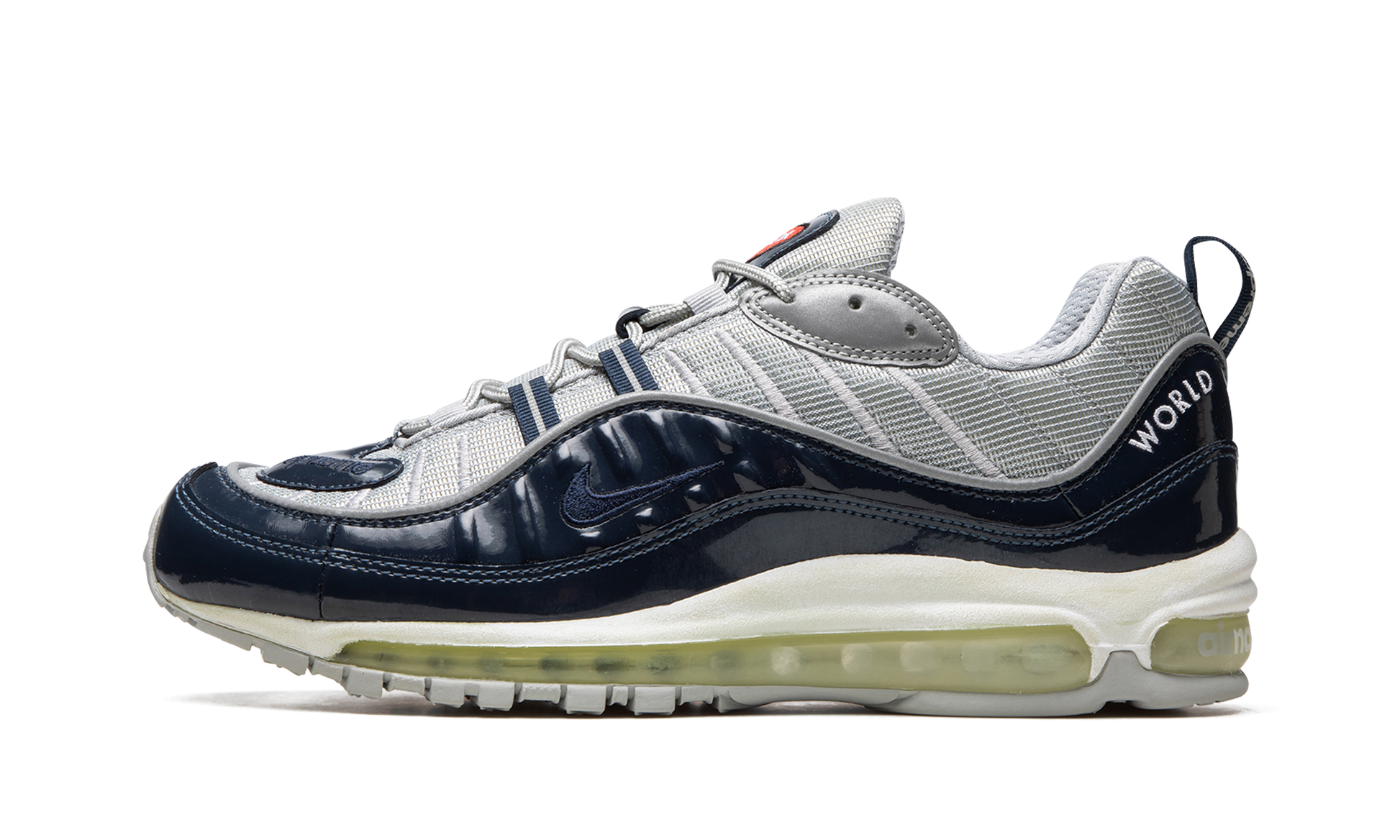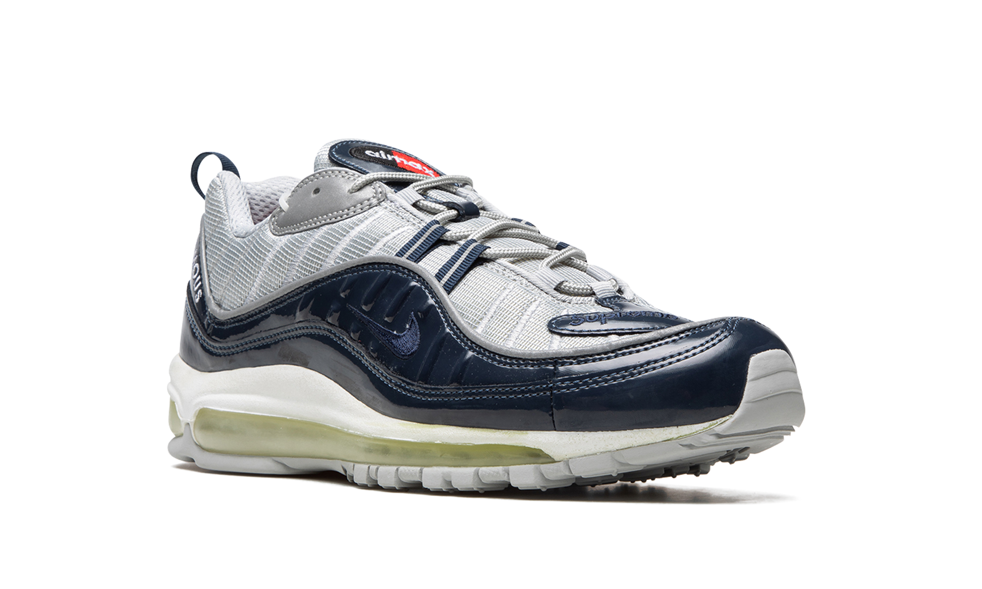 In 2016 Supreme teamed up with Nike for a collaboration on an unexpected model. the Air Max 98. With a total of four colorways. this version features an Obsidian blue patent leather upper with reflective silver accents.
