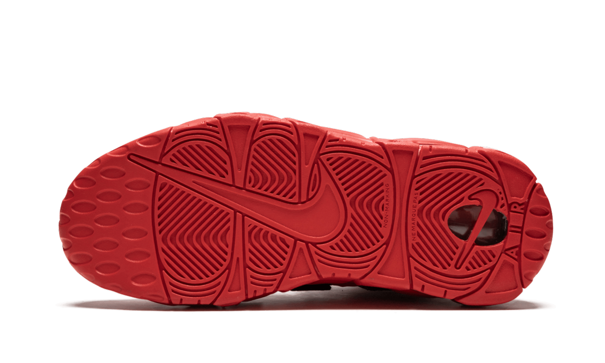 The Nike Air More Uptempo "Hoop Pack" is a remix of the classic Chicago Bulls colors in exclusive kids sizing. The grade-school-sized sneaker has a bold appearance with a gigantic "AIR" design that drapes over the entire upper. Set against a red background. the oversized letters come in white with black outlining. Reflective details on the Nike Air More Uptempo allow the shoe to really pop. A tongue and heel loop and Air bubble complete the design.