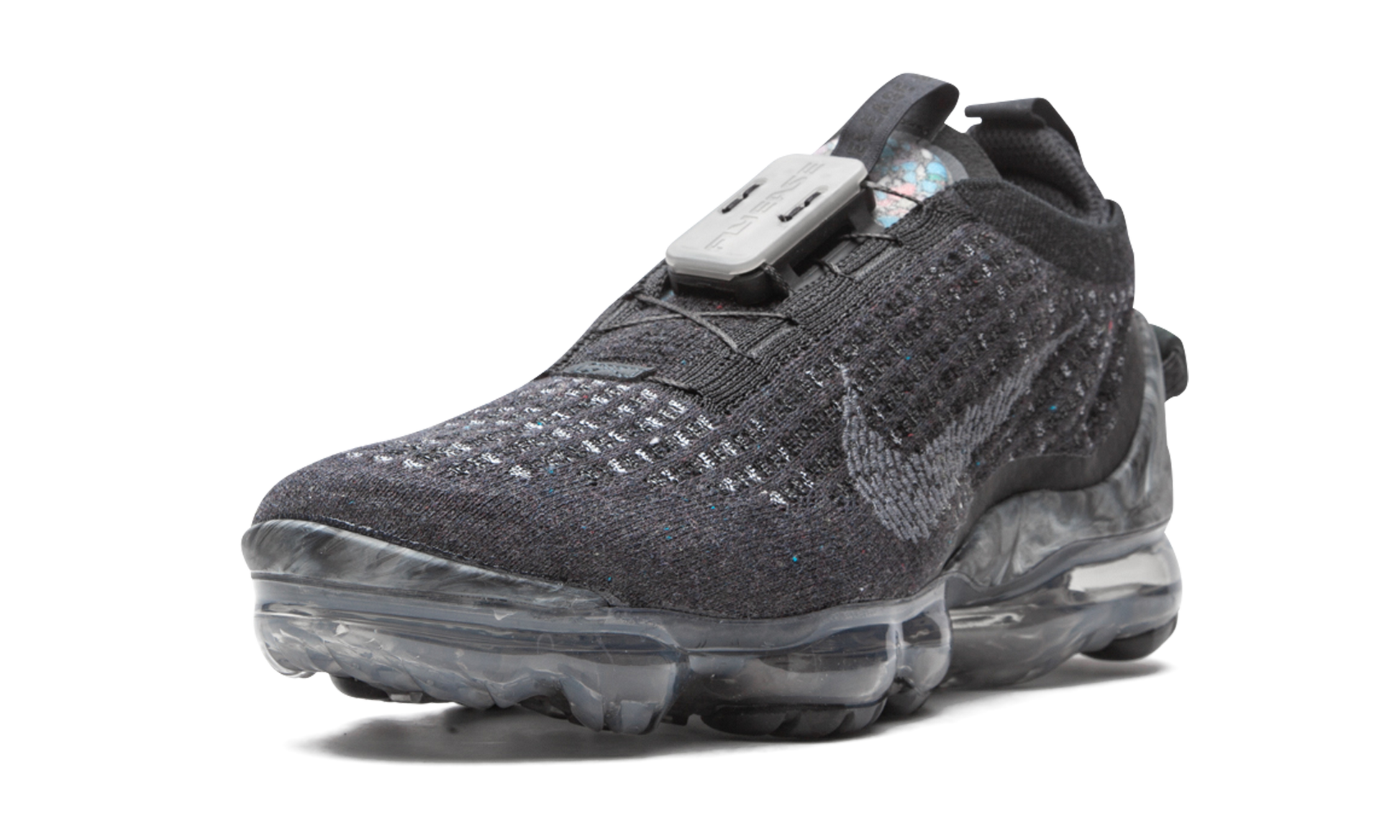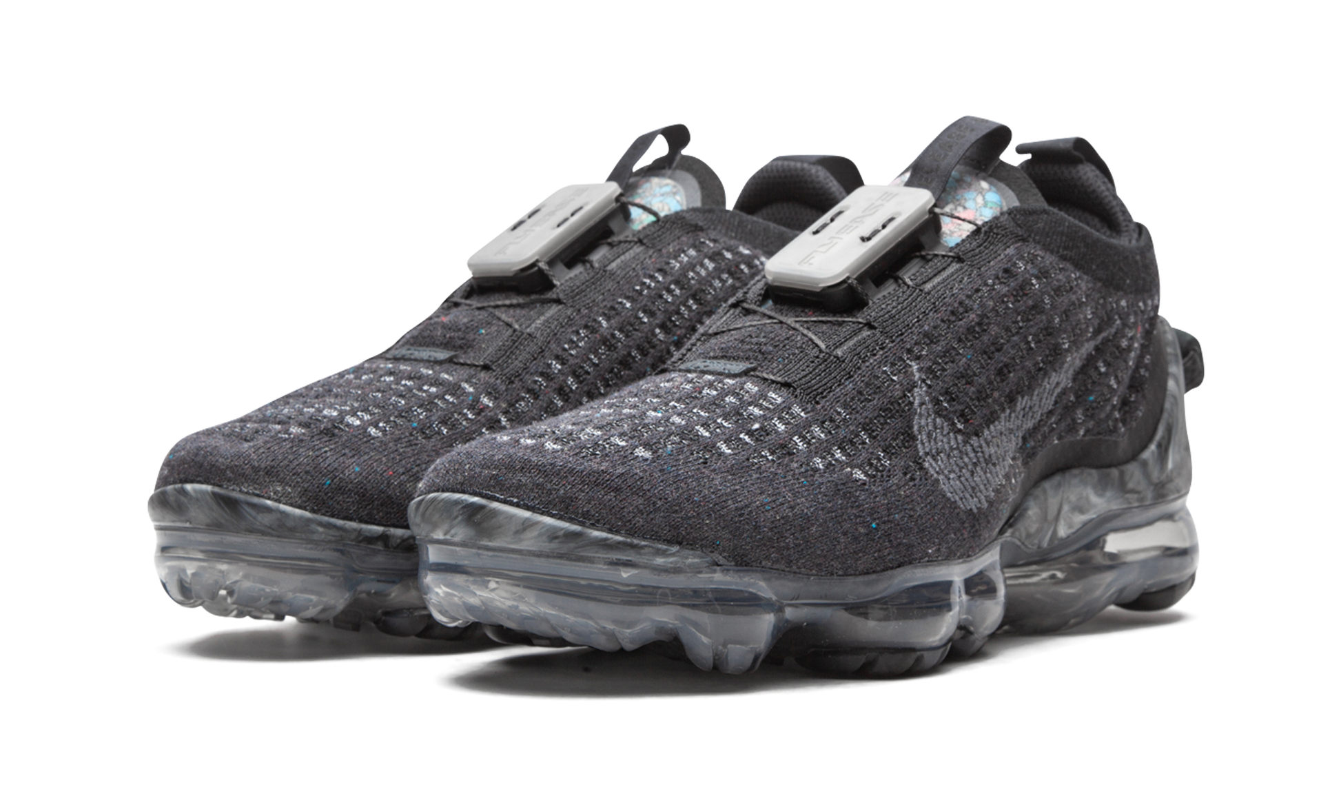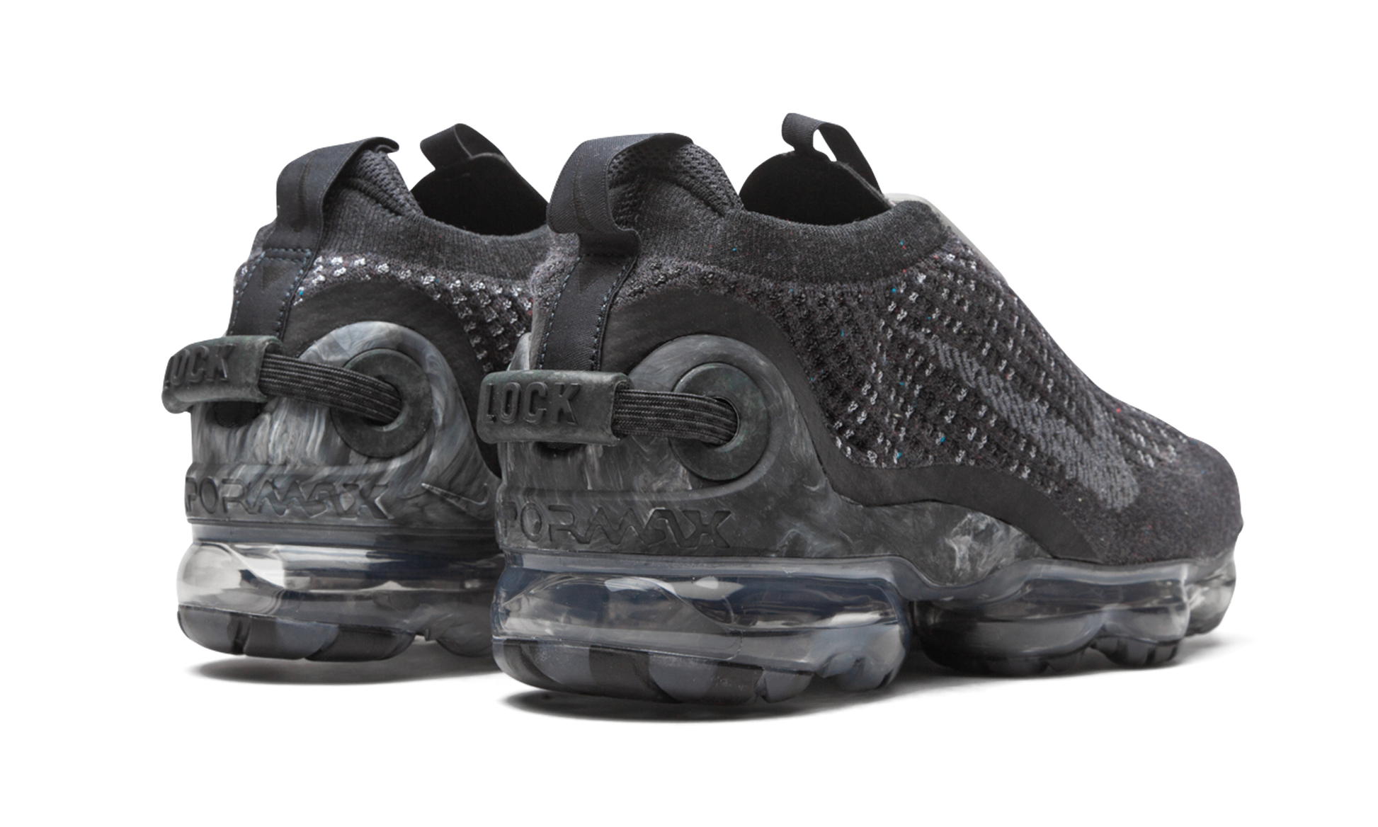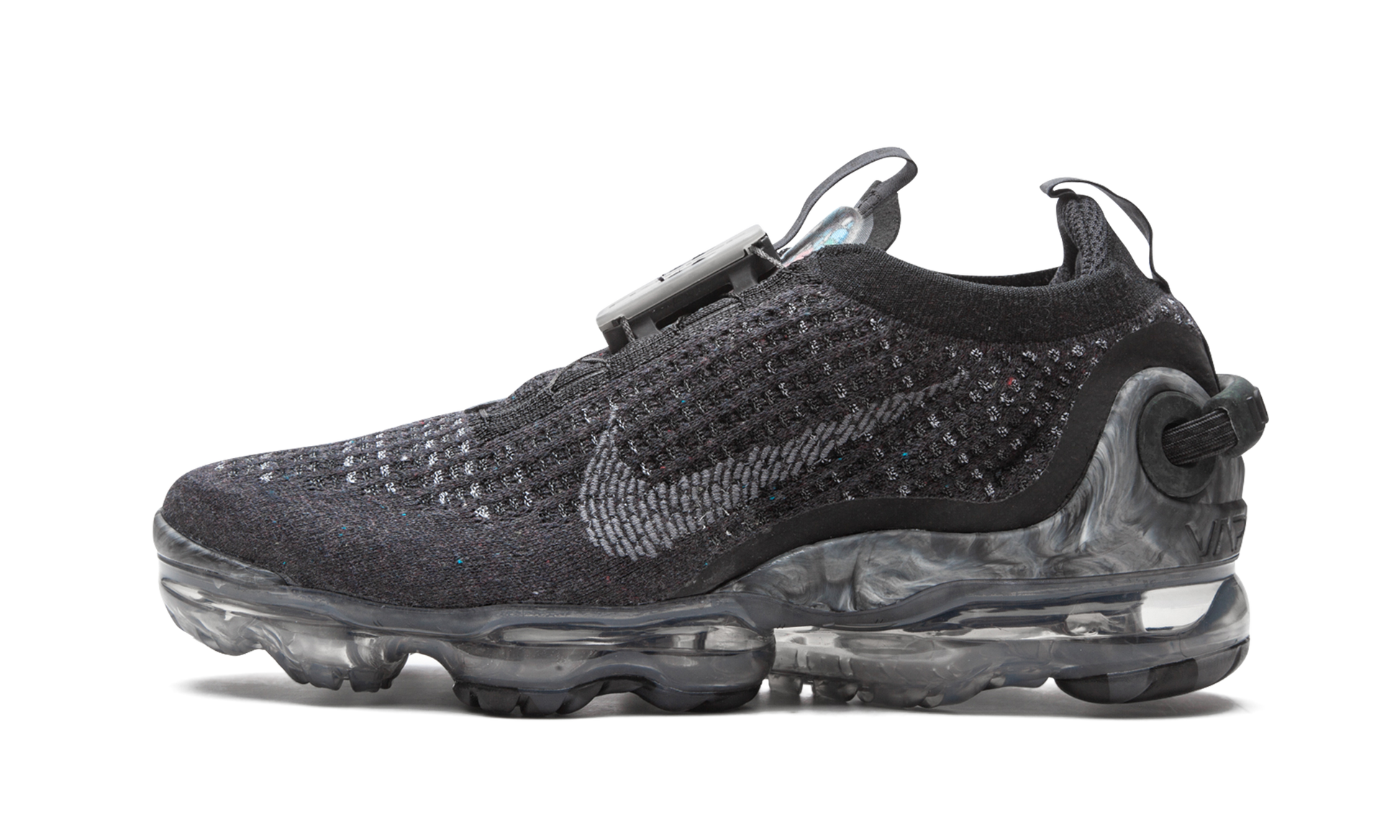 The Nike Air VaporMax 2020 Flyknit helps you wear sustainably with over 50-percent of this shoe made from recycled materials. The women's lifestyle sneaker comes with a black and grey multi-colored pattern across most of the Flyknit upper. while a recycled yarn weave bearing the same colors is intertwined beneath at the toe and midfoot area. A marbled heel counter is strategically placed along the midfoot and heel to protect and cradle the foot. and the transparent VaporMax cushioning unit is made from 75% recycled TPU.