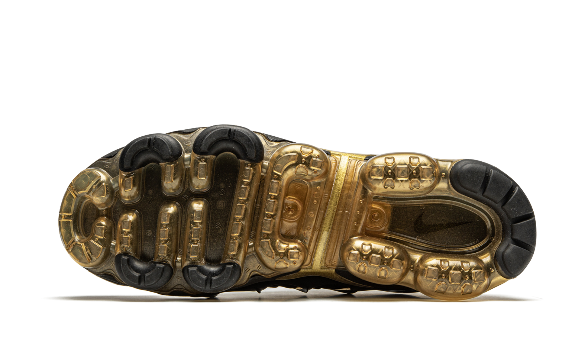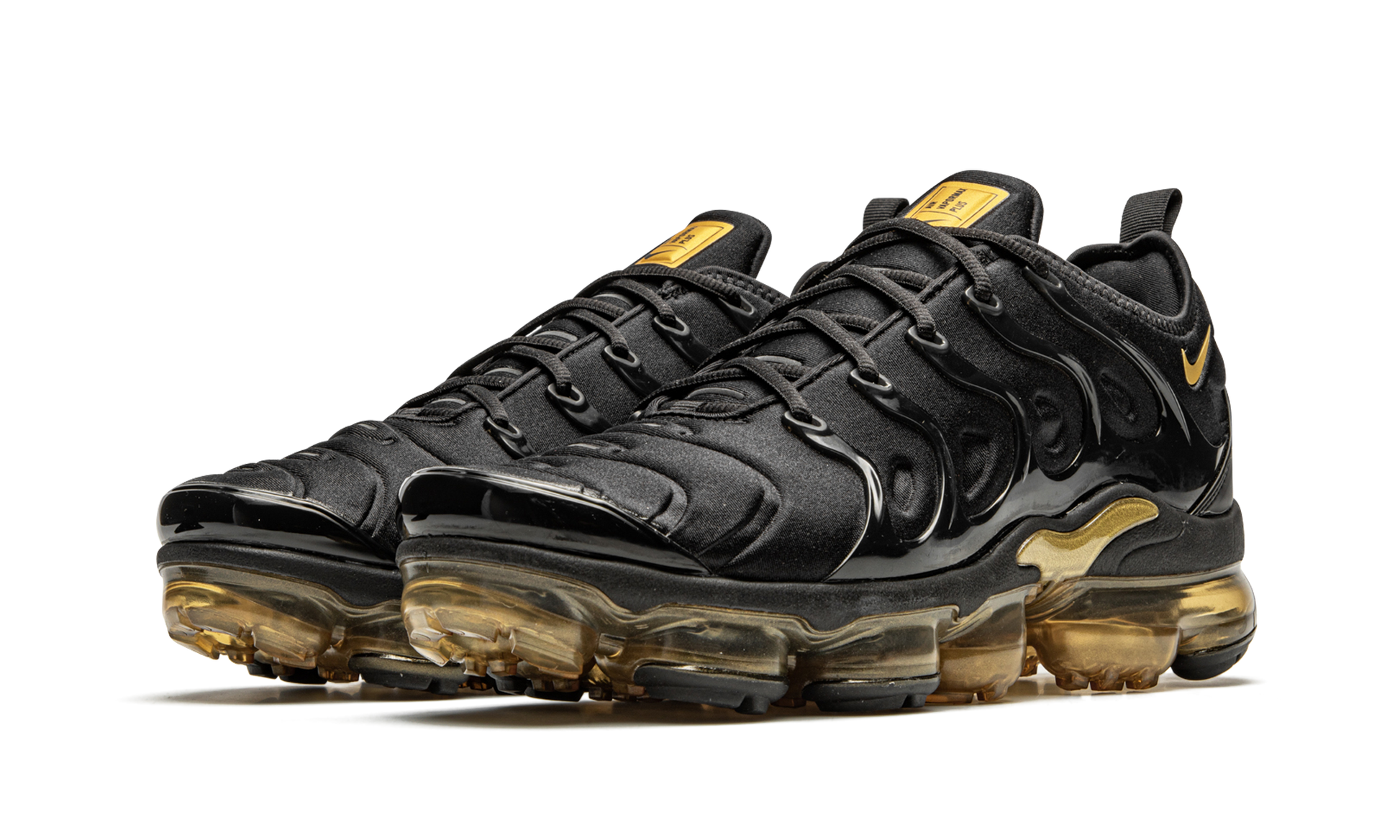 The Nike Air VaporMax Plus “Black/Goldâ€?is a two-tone. black-and-gold colorway of the lifestyle sneaker with a unique design. The Air VaporMax Plus in the “Black/Goldâ€?style features a black textile upper with a tonal TPU overlay cage that assists in supporting the lacing system. A metallic gold Swoosh appears on the collar and a gold “VaporMaxâ€?branded patch is found on the tongue. Underfoot. the shoe is mounted on a foam midsole with Nike's VaporMax bubbles. Release date: June 25. 2020