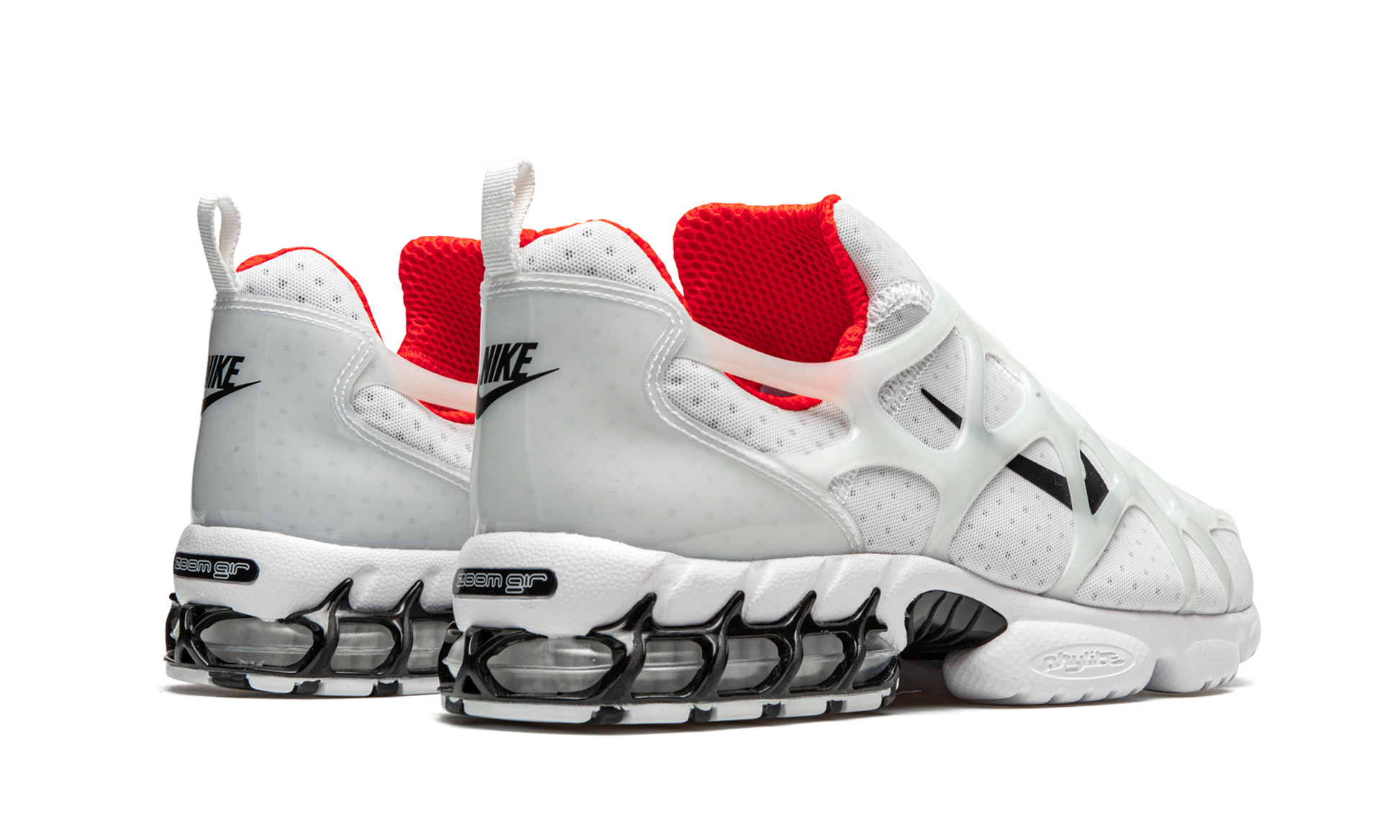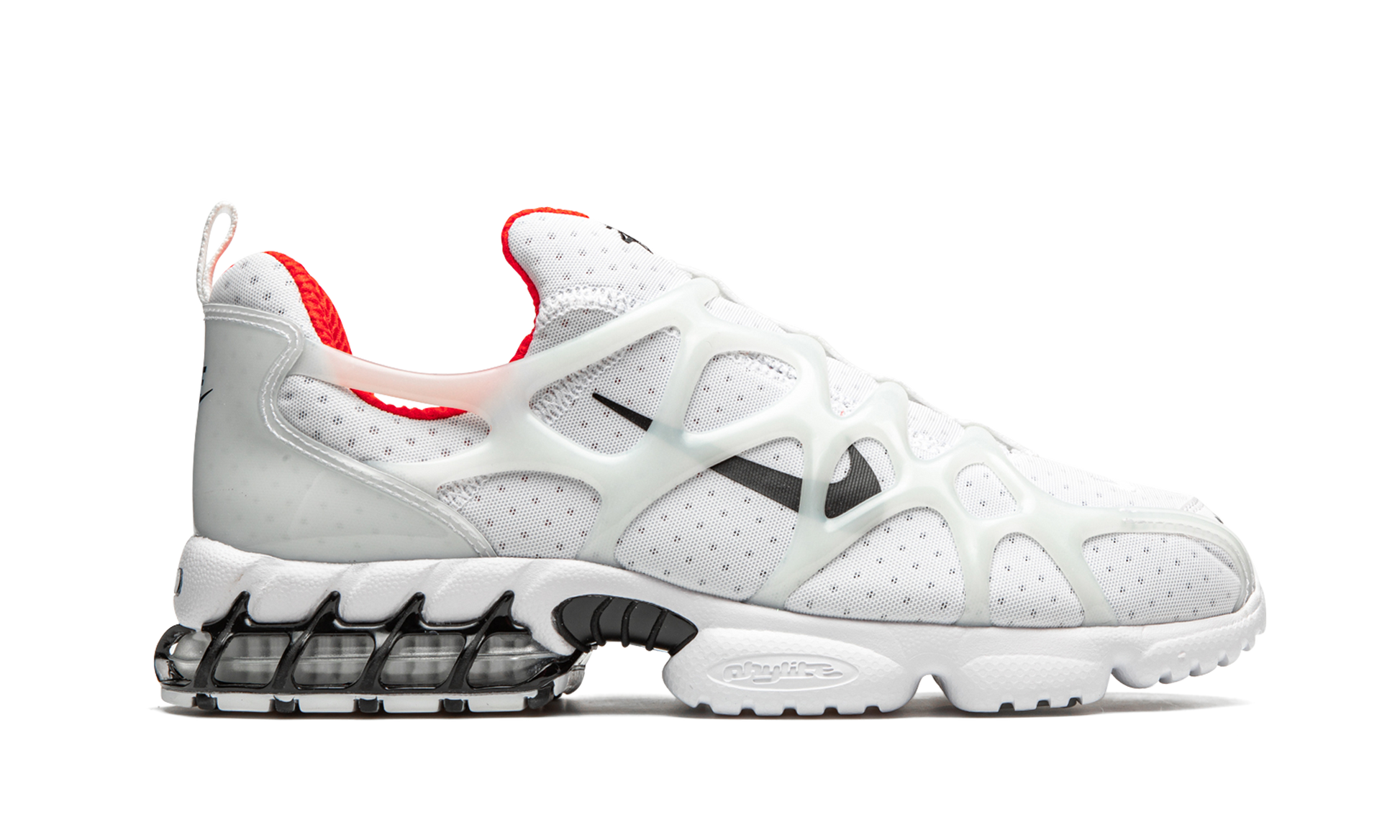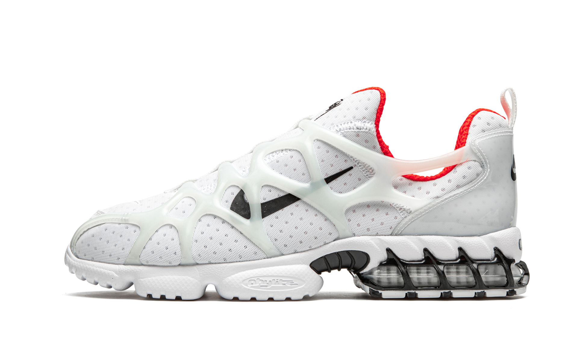 The Stussy x Nike Air Zoom Spiridon Kukini “Habanero Redâ€?is a high-profile collaboration between the California streetwear brand and Nike on the hybrid performance shoe. The Air Zoom Spiridon Kukini mends elements of the Air Zoom Spiridon and Air Kukini models. namely the laceless. sock-like. slip-on build of the Kukini silhouette. The upper displays a dotted white mesh construction with an overlaid translucent cage for support. A black Swoosh appears on either side and black Stussy insignia dots the white mesh tongue. Habanero Red accenting can be found on the liner and classic “Nike Airâ€?detailing covers the heel. The clear Zoom Air cushioning in the heel is derived from the Air Zoom Spiridon Caged. Release date: July 30. 2020.
