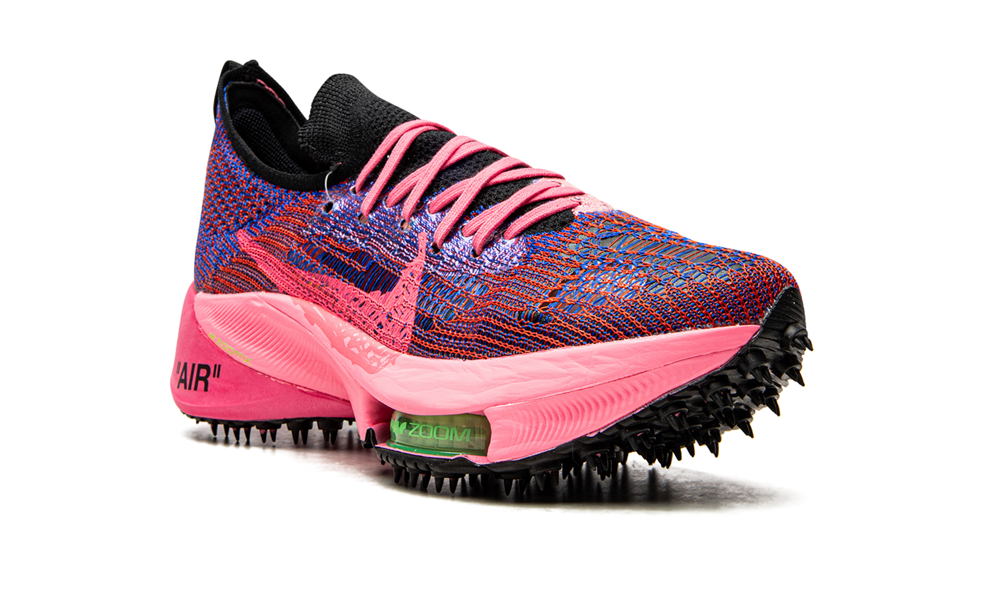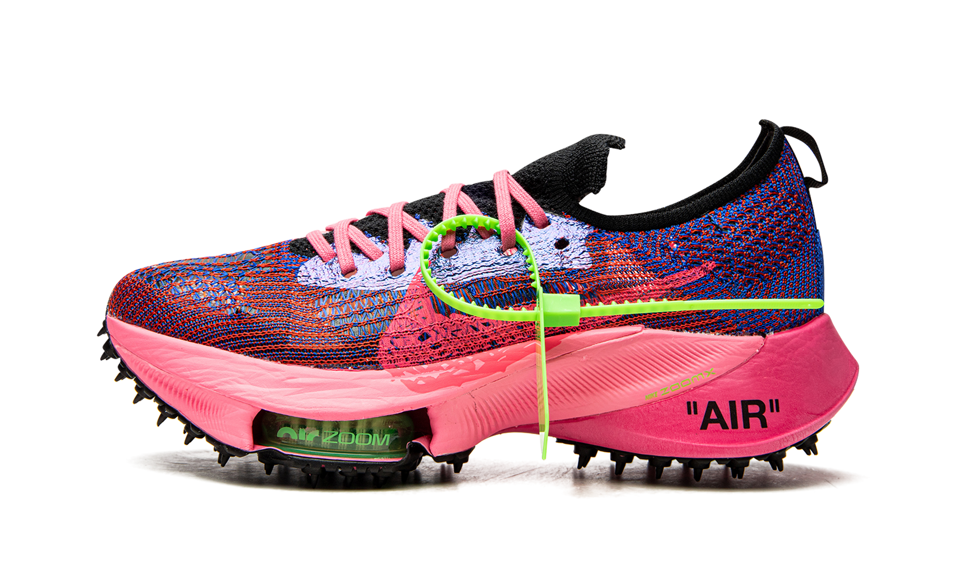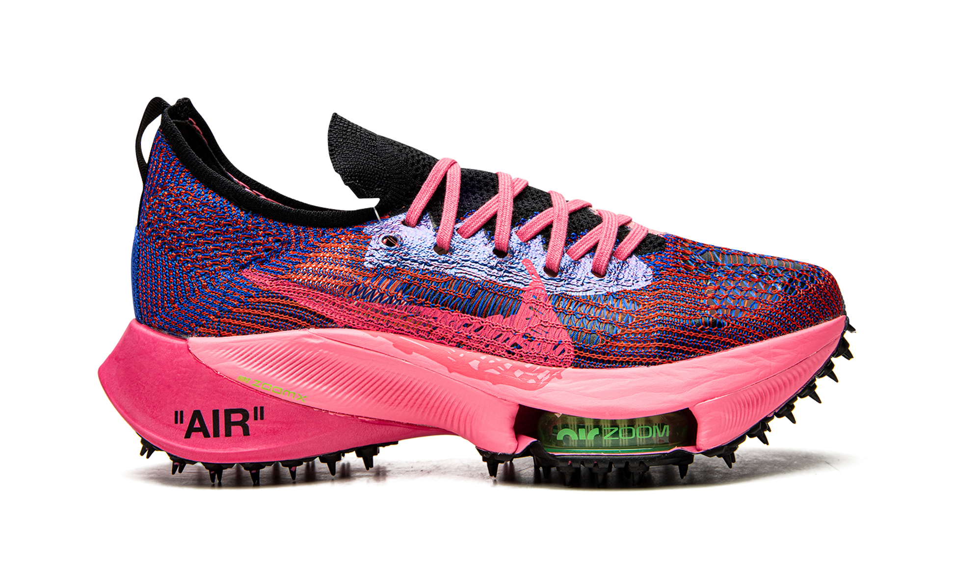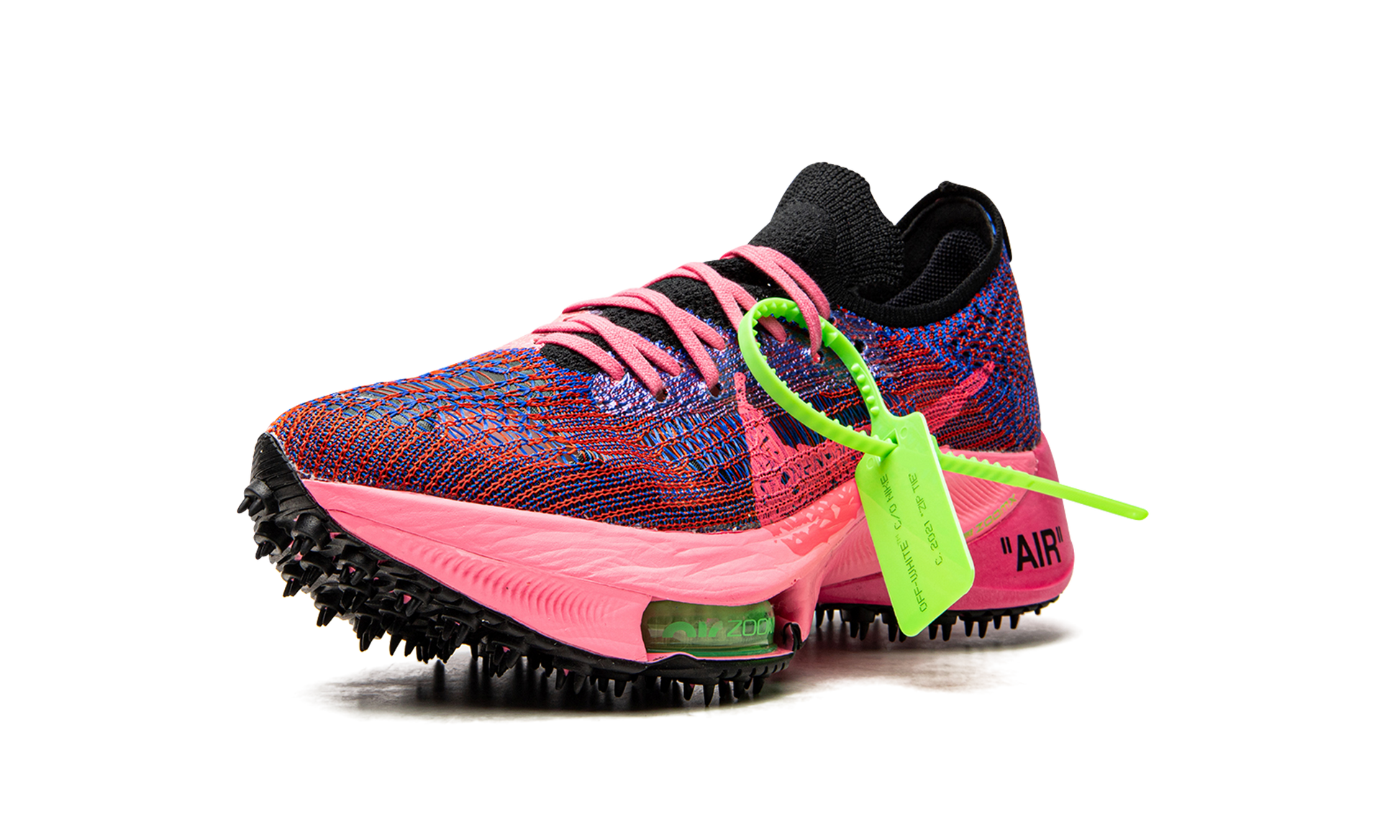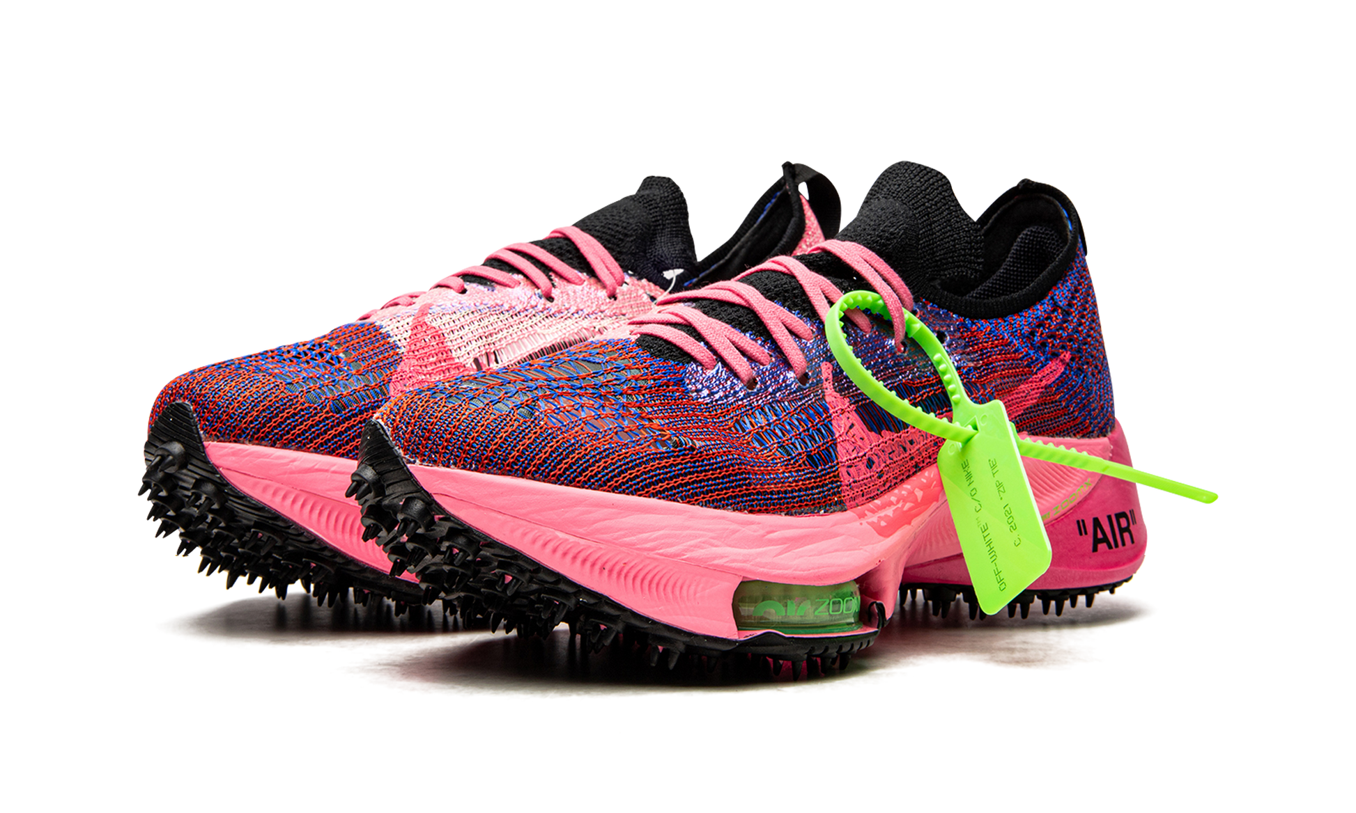 The Off-White x Nike Air Zoom NEXT% “Pink Glowâ€?is one of several colorways of the contemporary-looking running shoe designed in collaboration with Virgil Abloh's high fashion outfit. The Air Zoom NEXT% progresses one of the most popular and successful sneaker partnerships in history. As for the design. Virgil and Nike construct the model's sock-like upper in a lightweight and breathable pink and Racer Blue knit material. Off-White's now-signature industrial-style branding is printed on the medial side of the shoe. An oversized Pink Glow Swoosh appears as if it were painted onto the lateral side. The pink laces layered over the knit tongue display Off-White's “SHOELACESâ€?motif. The word “AIRâ€?is printed in black text on the lateral side of the heel of the pink foam midsole. Black “spikesâ€?can be found on the rubber outsole. The look has been used on Off-White and Nike's collaboration on the Waffle Racer silhouette from 2020. A clear neon green Zoom Air bubble can be found in the forefoot of the pink midsole. Release date: July 23. 2021