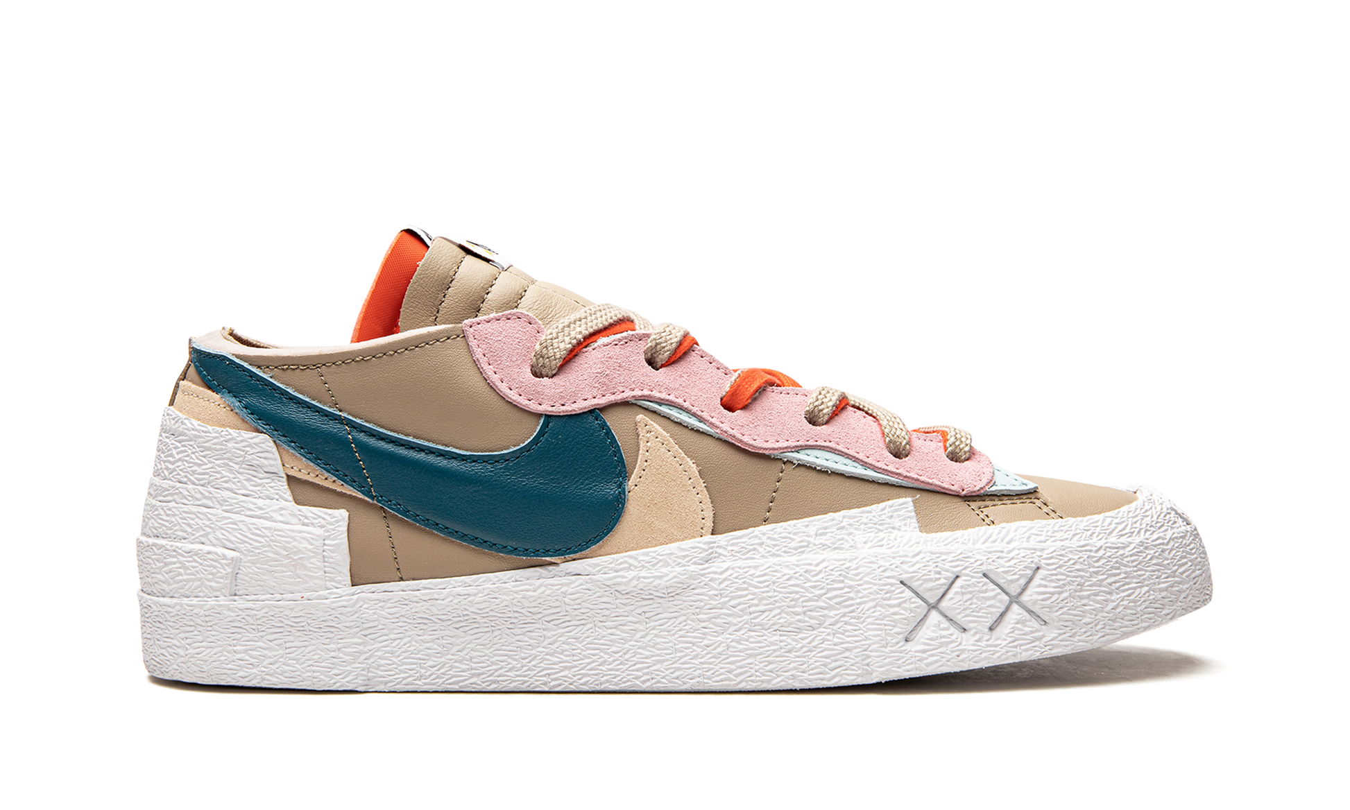 The Kaws x Sacai x Nike Blazer Low “Reedâ€?is one of multiple colorways of the vintage basketball shoe designed by the trio of the legendary graffiti artist. the high fashion brand. and Nike. The “Reedâ€?version of the classic Blazer Low was released in December 2021 and was the fourth colorway released of the design by Kaws. Sacai. and Nike of the shoe that year. Features include a tan leather base with a tan suede Swoosh layered underneath a dark green leather Swoosh on the sides. A light blue leather panel is placed below a pink suede panel on the eyelets and orange and tan laces are layered over the tan and orange leather layered tongues with dual “Sacaiâ€?and “Nikeâ€?branding. Four stacked white rubber panels extend from the midsole to cover the lower portion of the heel. Kaw's signature “XXâ€?motif is lasered onto the midsole. The Kaws x Sacai x Nike Blazer Low “Reedâ€?was released exclusively on Kaws and Sacai's websites. Release date: December 9. 2021