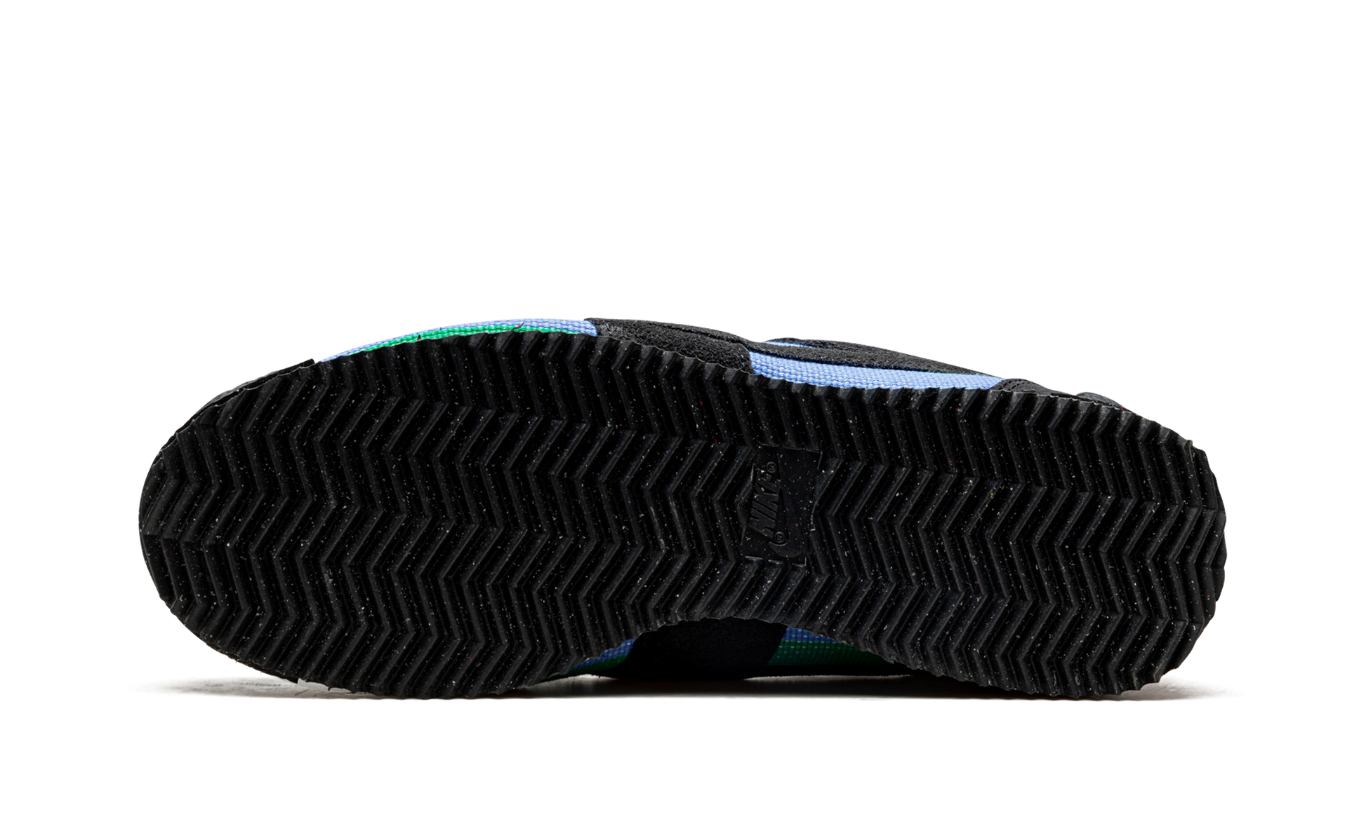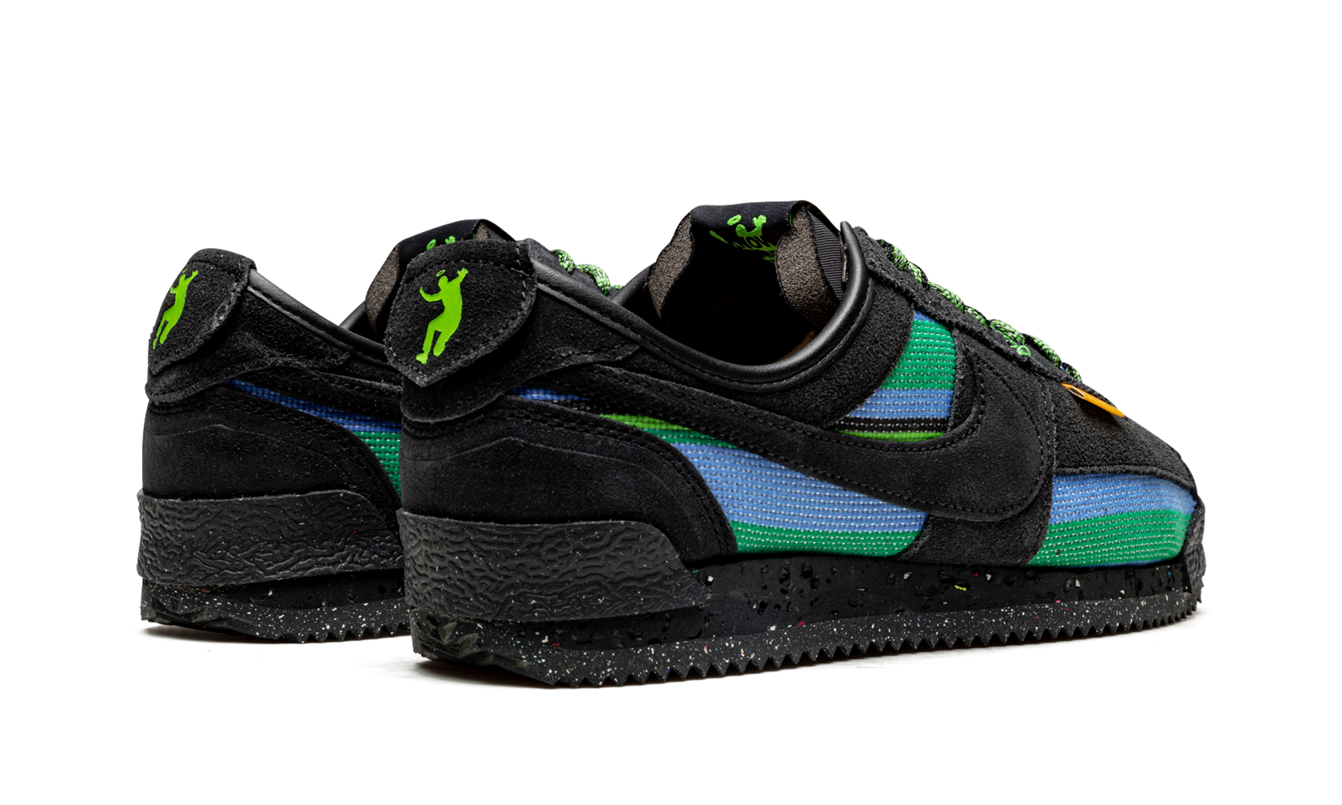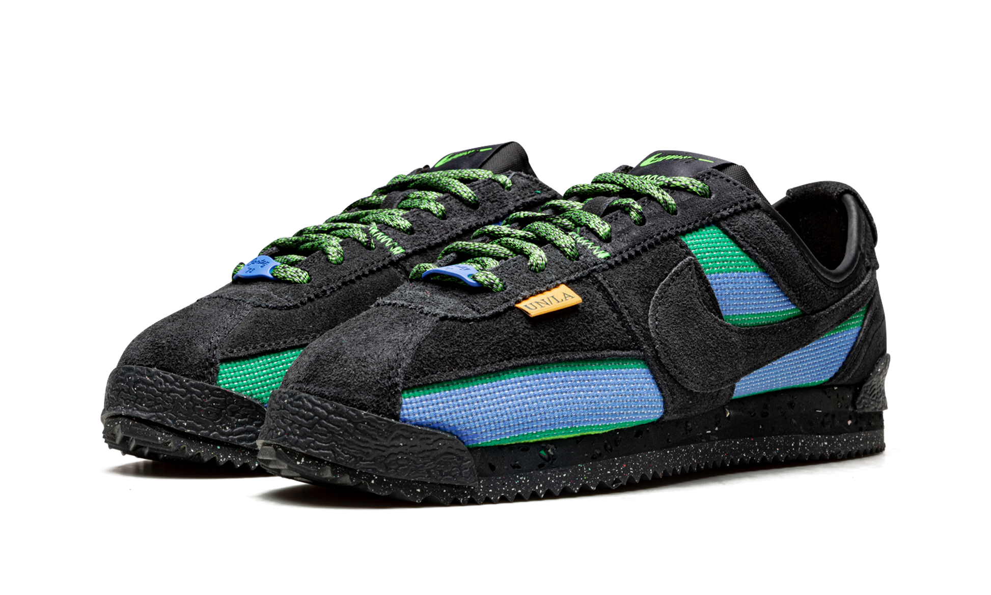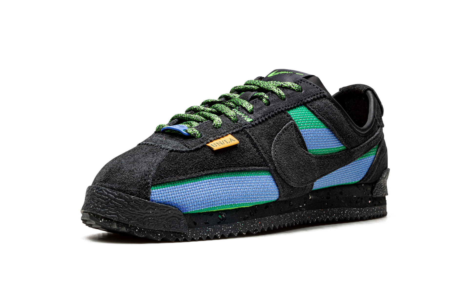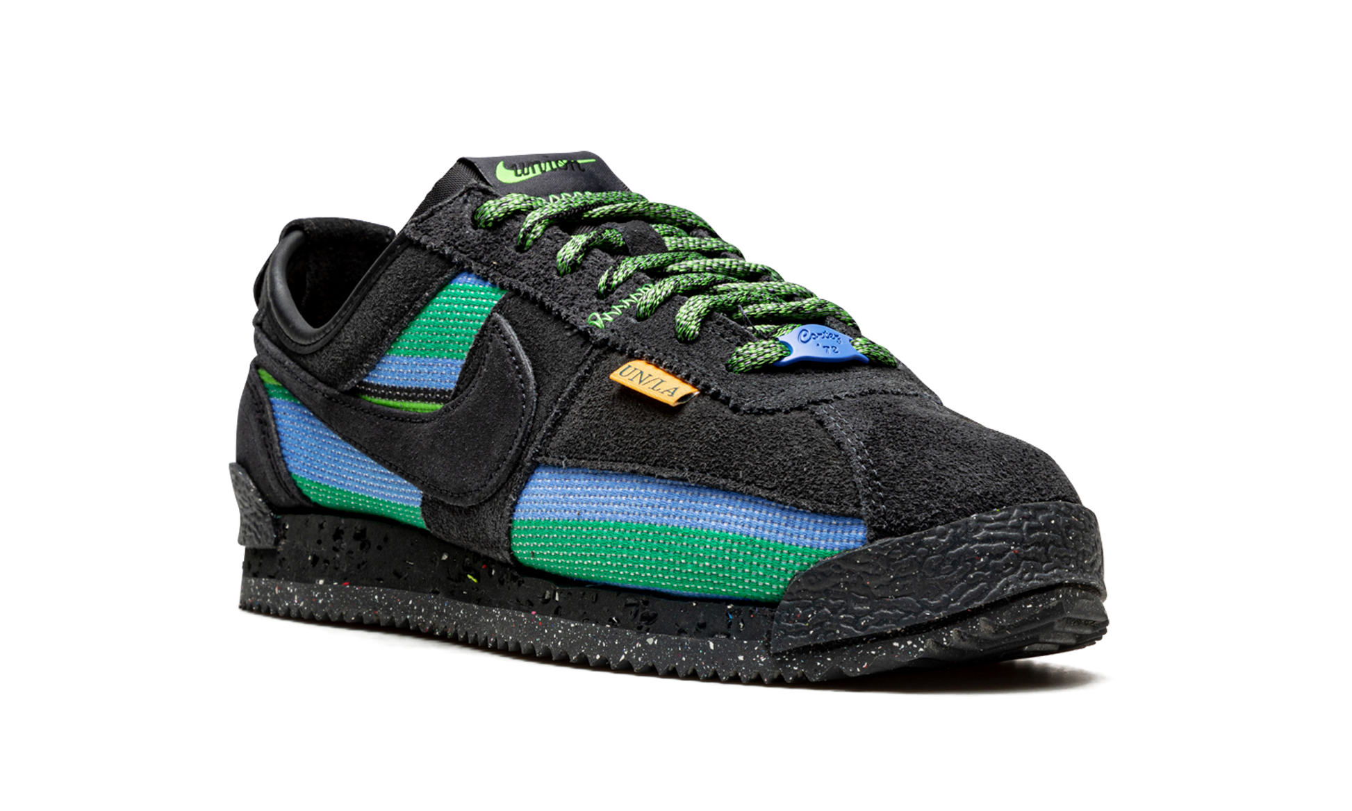 The Union x Nike Cortez “Black/Blueâ€?is a collaboration between the Los Angeles based clothing and sneaker boutique and Nike on the retro running shoe that honors both the model's legacy. as well as its caché in the greater Los Angeles area. Also celebrating the Nike Cortez's 50th anniversary in 2022. the Union co-designed “Black/Blueâ€?updates the silhouette with its signature colors and textures for a look unlike anything ever seen before as it pertains to the classic shoe. Black suede overlays contrast the striped knit base. Bright green accenting appears on the heel overlay with Union's “Frontmanâ€?logo. Additional green detailing comes into play on the tongue tag and on the suede overlay on the base of the vamp. The lower portion of the shoe is made from sustainable materials as Nike's recycled Crater Foam and Grind textiles comprise the midsole and outsole. respectively. Release date: June 21. 2022