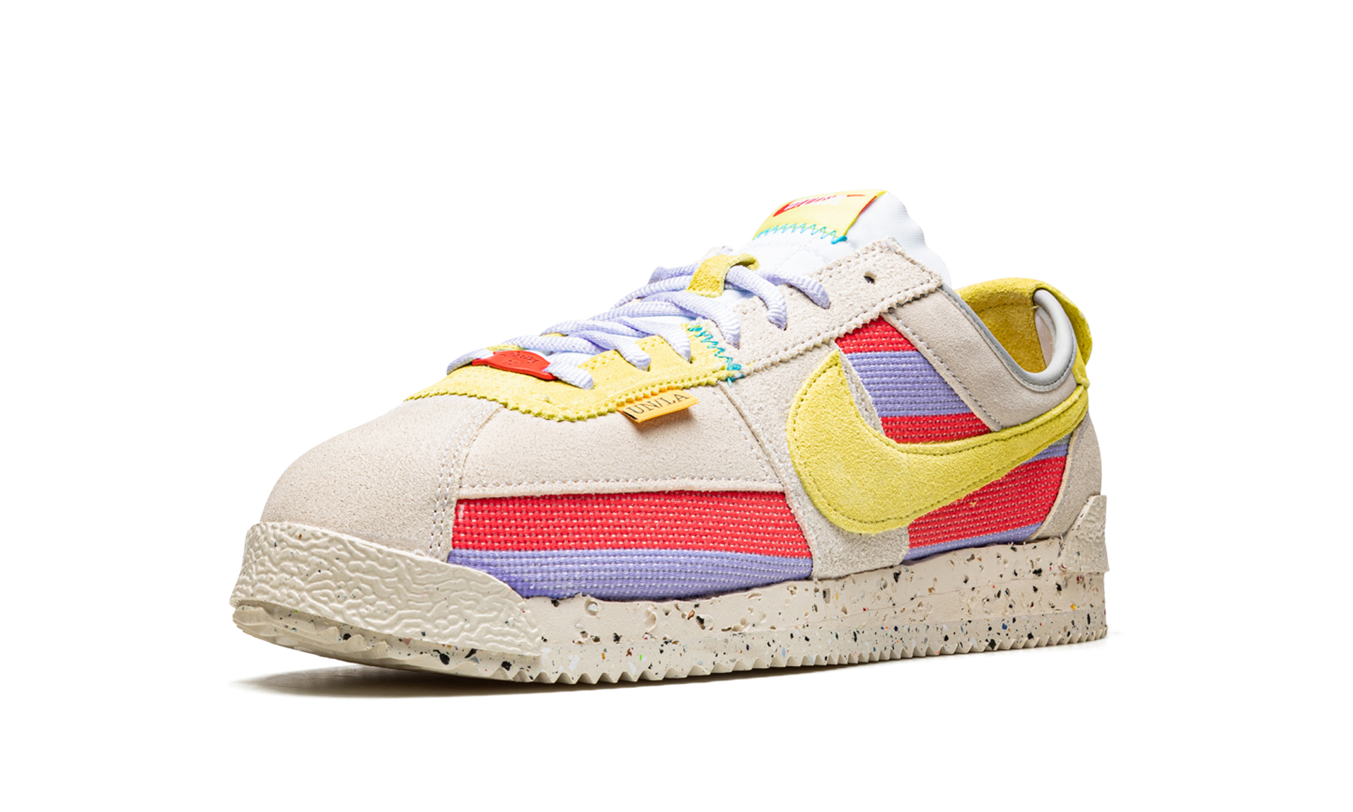 The Union x Nike Cortez “Lemon Frostâ€?is a collaboration by the Los Angeles based clothing and sneaker retailer that celebrates the model's legacy. as well as its caché in the greater LA area. Honoring the Nike Cortez's 50th anniversary in 2022. the Union co-designed “Lemon Frostâ€?updates the model with its signature colors and textures for a look unlike anything ever seen before on the classic shoe. Tan suede overlays contrast the multicolor striped knit base. A Lemon Frost suede Swoosh is found on either side. The bold yellow hue also appears on the heel tab. as well as on the heel overlay with Union's “Frontmanâ€?logo. Additional yellow detailing comes into play on the tongue tag and on the suede overlay on the base of the vamp. The lower portion of the shoe is made from sustainably sourced materials as Nike's recycled Crater Foam and Grind textiles comprise the midsole and outsole. respectively. Release date: June 21. 2022