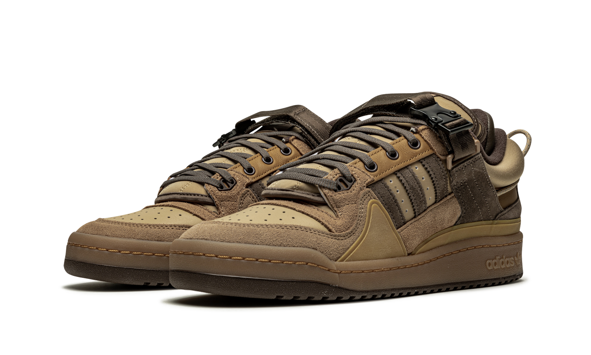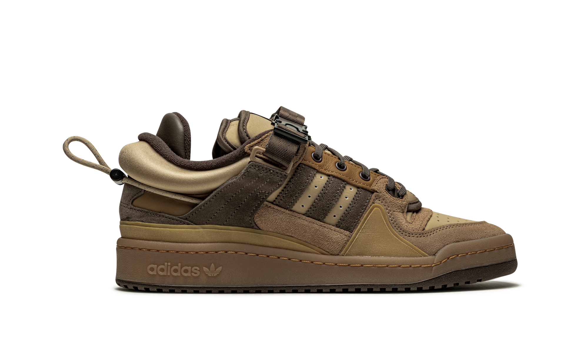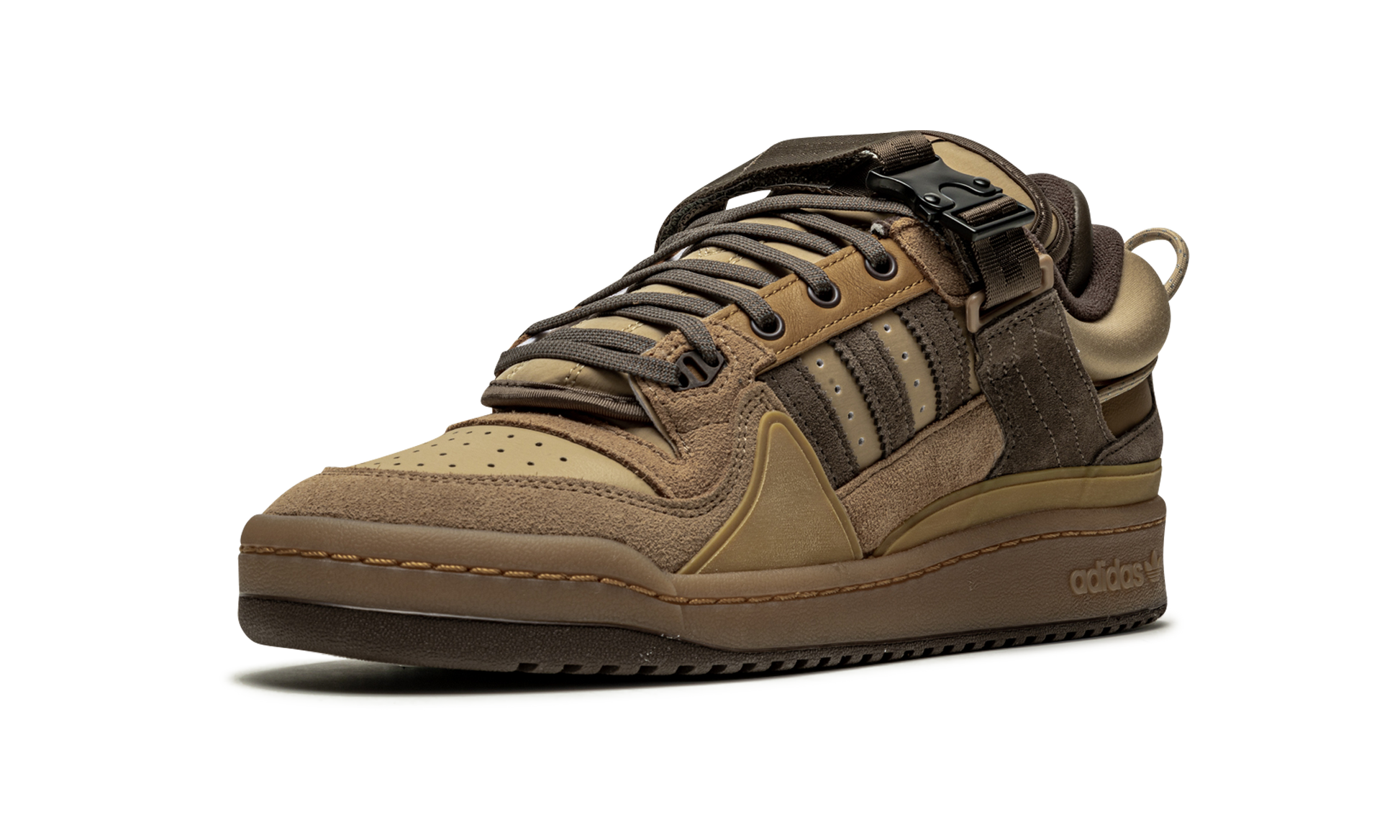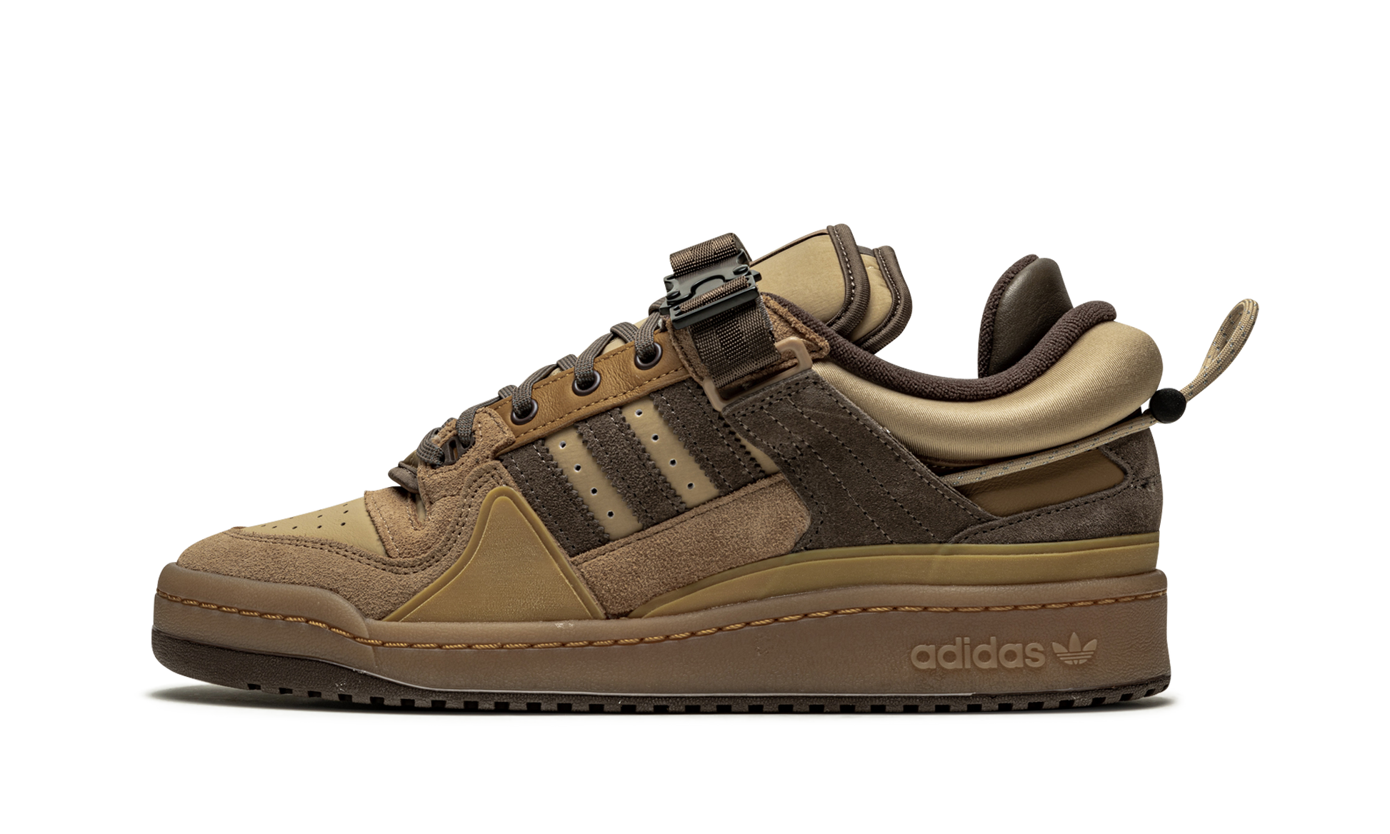 The Bad Bunny x adidas Forum Low Buckle “The First Cafeâ€?is the first-ever collaboration between the Grammy Award winning recording artist and adidas on the retro performance basketball shoe. A March 2021 release. the “The First Cafeâ€?is nicknamed and stylistically inspired by Bad Bunny's appreciation for a morning cup of coffee. A combination of suede and leather panels in various mocha hues adorn the forefoot. toe. collar. and heel. The model's signature Three Stripes detailing is finished off in dark brown suede matched by overlays on the lateral side of the heel. A plush java leather construction forms the base of the shoe. Two unique. overlapping and interchangeable tongues allow the wearer to customize the look. A brown nylon ankle strap with “YO VISTO ASI.â€?which translates to “I dress like thisâ€?from Spanish. is embroidered under the strap. A lace toggle and double heel design on the back of the shoe enhance the upscale vibe of Bad Bunny's debut adidas collaboration. Release date: March 16. 2021.