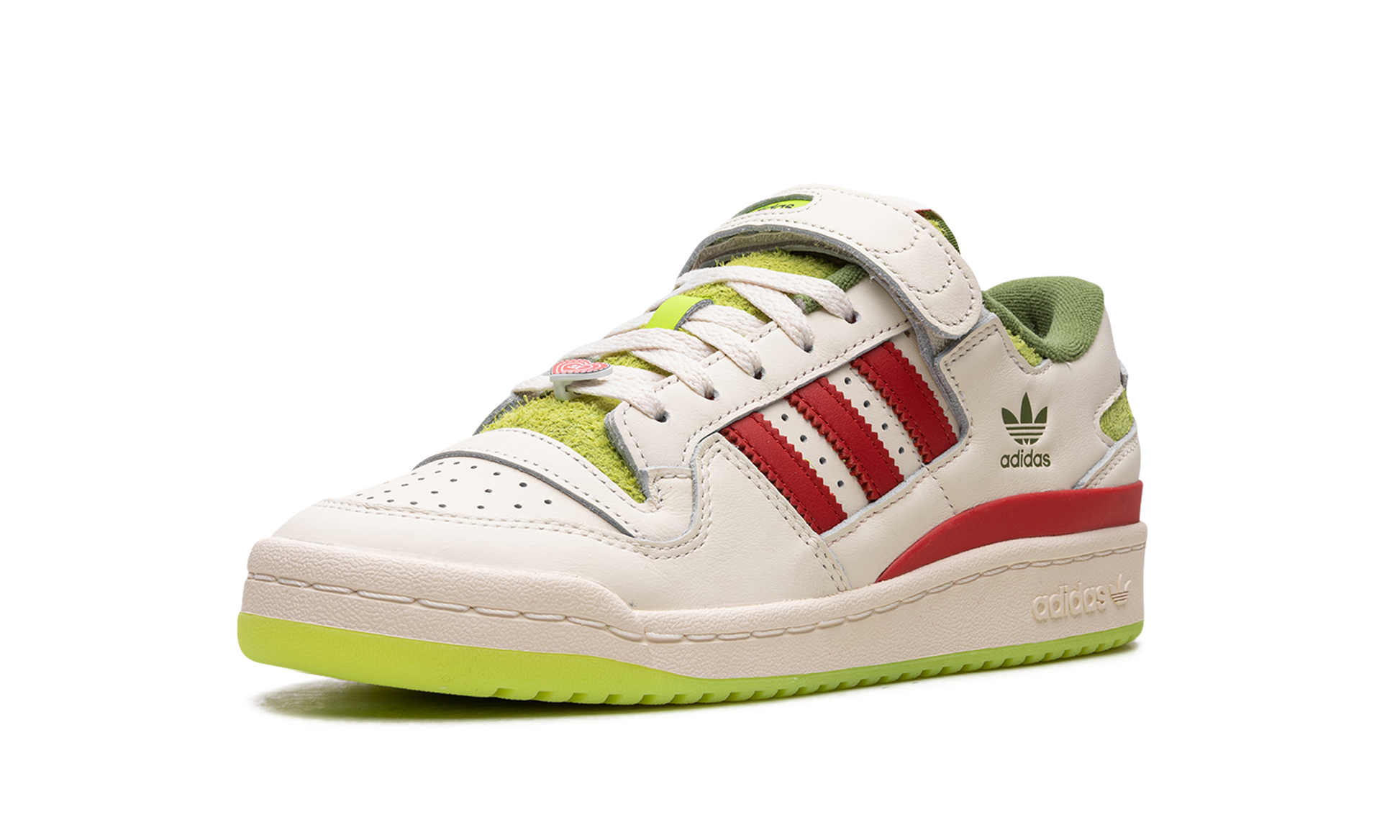 The adidas Forum Low "The Grinch" is a colorway of the retro basketball shoe inspired by the Dr. Seuss character of the same name. From a collection of “Grinchâ€?inspired colorways in celebration of the Christmas season. the Forum Low seen here features details inspired by The Grinch's unmistakable green appearance. Hairy green suede is applied to the tongue and detailing around the collar. The rest of they upper is constructed in off-white leather with red leather Three Stripes on the sides. A green adidas Trefoil logo is seen on the lateral side of the heel. A graphic of The Grinch appears on the tongue tag and a heart dubrae is found on the bottom of the laces.
