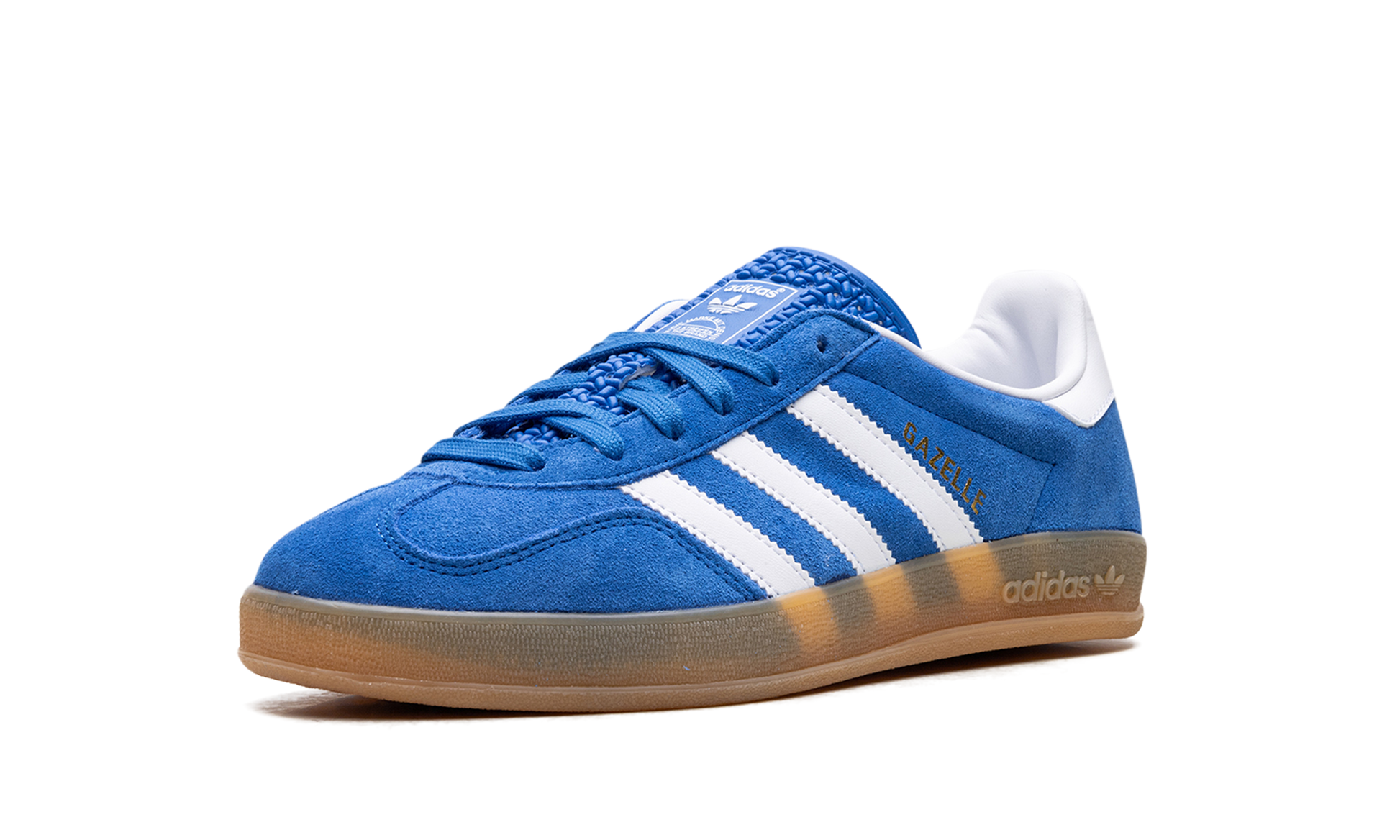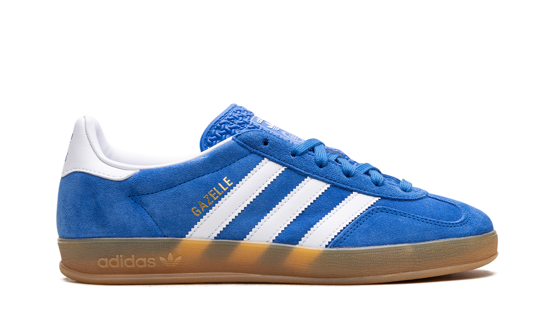 The Adidas Gazelle Indoor "Blue" brings a vibrant update to a classic silhouette. This sneaker features a striking blue suede upper contrasted by crisp white leather three-stripes and a heel tab. It is elevated with a distinctive. translucent gum rubber outsole that gives it a vintage. indoor-sport aesthetic. A timeless design. the Gazelle Indoor combines retro appeal with a modern pop of color. making it a versatile shoe for everyday wear.