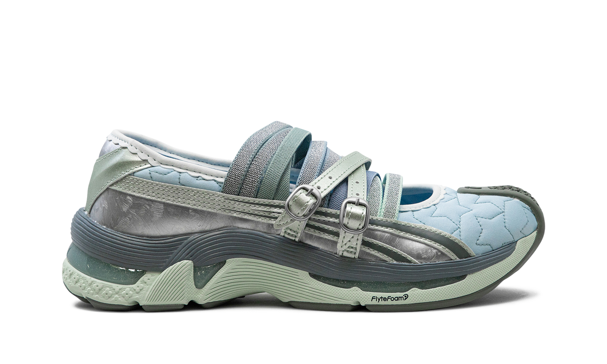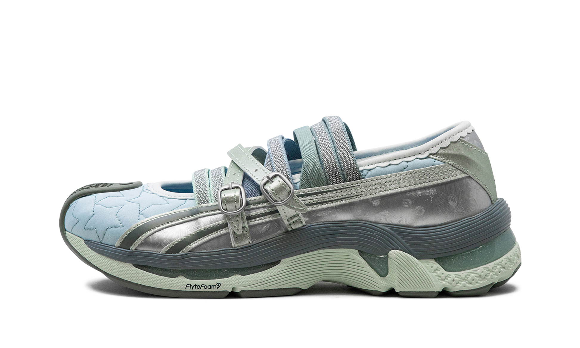 Experience the unique collaboration of Kiko Kostadinov. Heaven by Marc Jacobs. and ASICS with the Women's Gel-Lokros "Teal." This design blends the distinct aesthetics of Kostadinov and Jacobs. featuring an eye-catching star pattern on the Teal toe and a distinctive rubber extension. Glittery strap details add a touch of flair to this standout style.