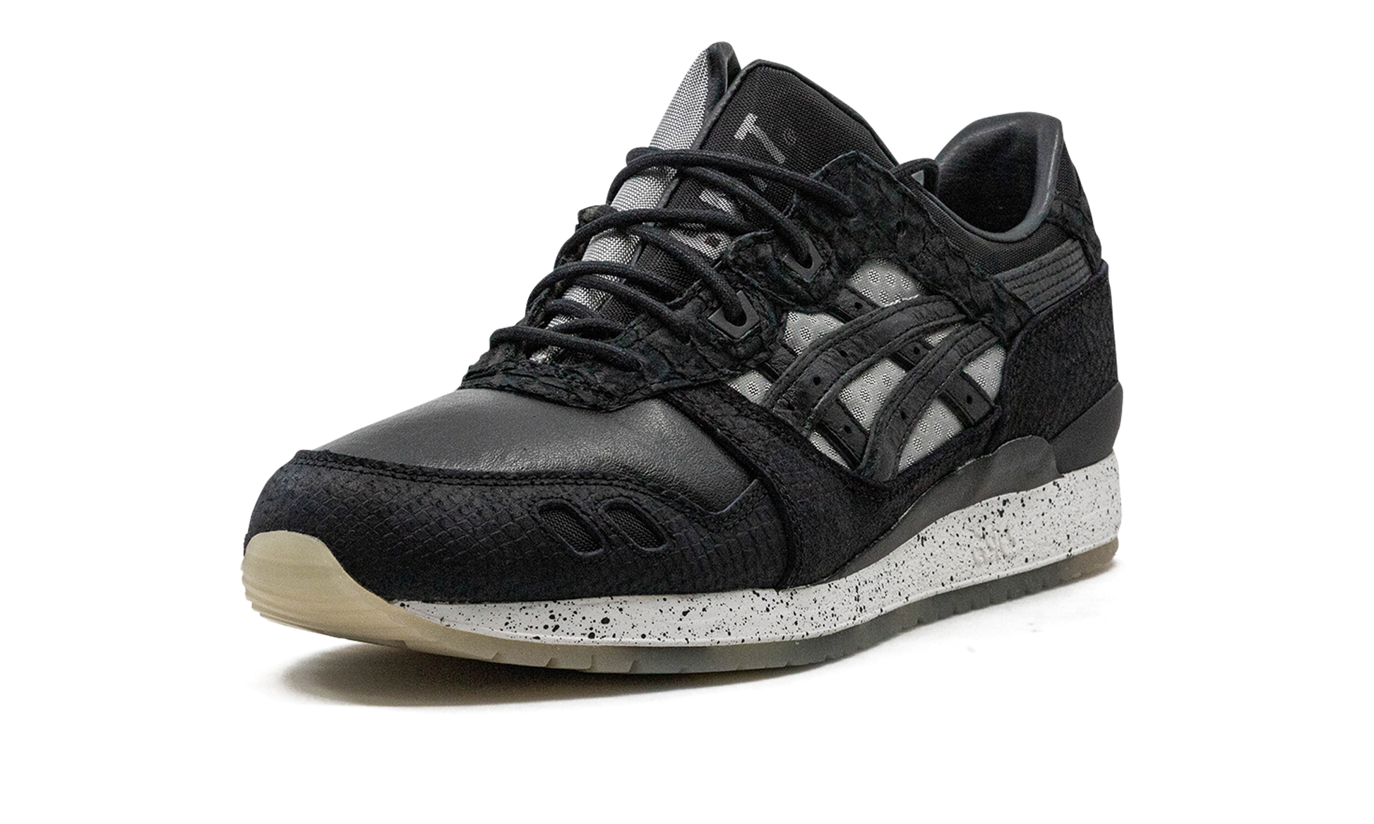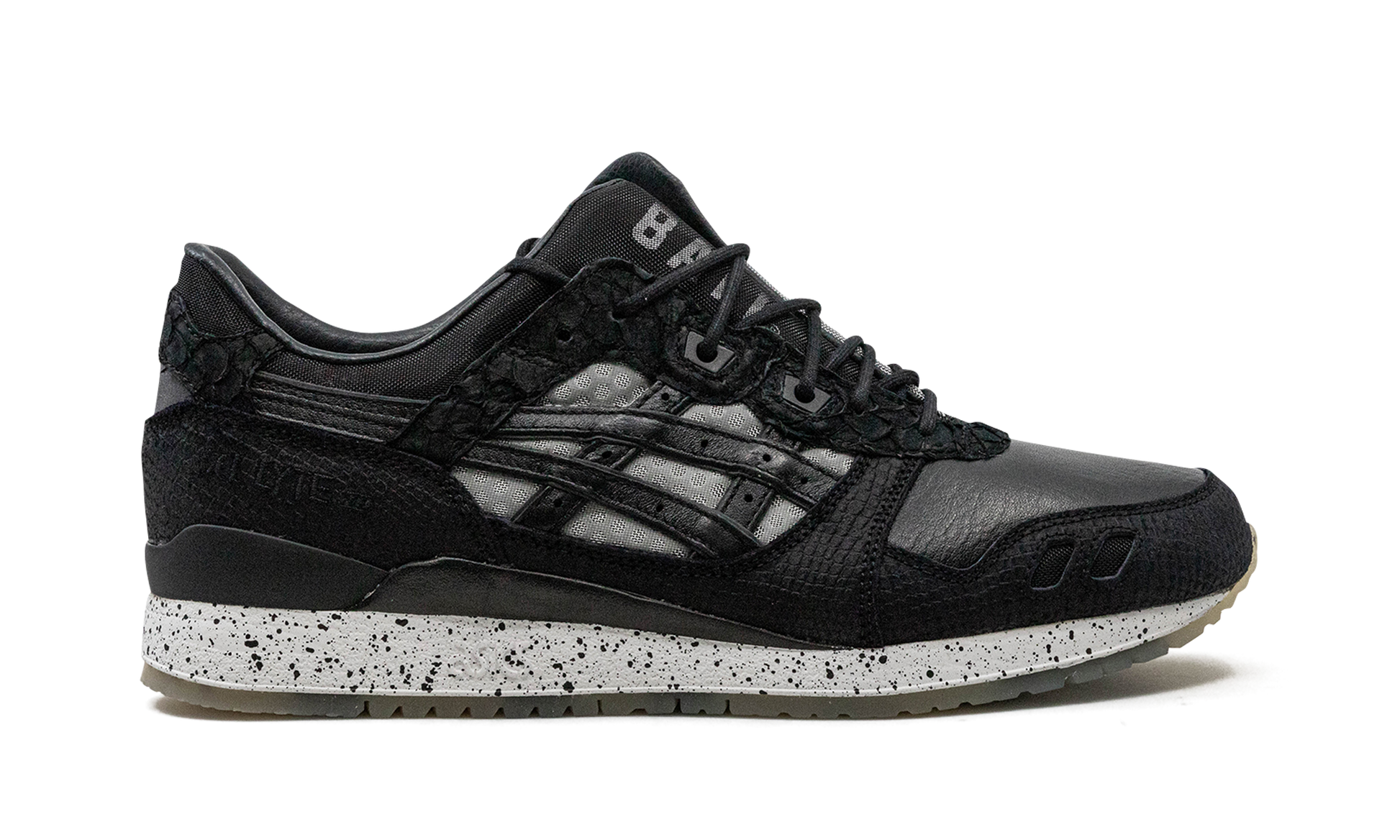 One of the most impressive in a long line of excellent collabs between California sneaker shop BAIT and ASICS. this “Nightmareâ€?colorway of the Gel-Lyte III features an all-black leather upper in both smooth and reptile textures. Further detailing include metal-mesh on the tongue. a speckled midsole. and clear outsole with BAIT and ASICS logos visible underneath.