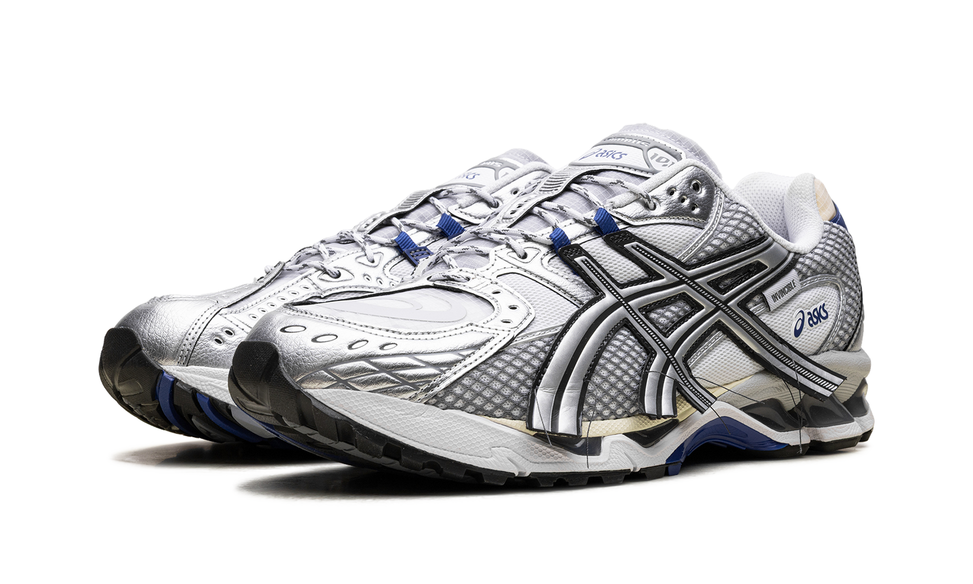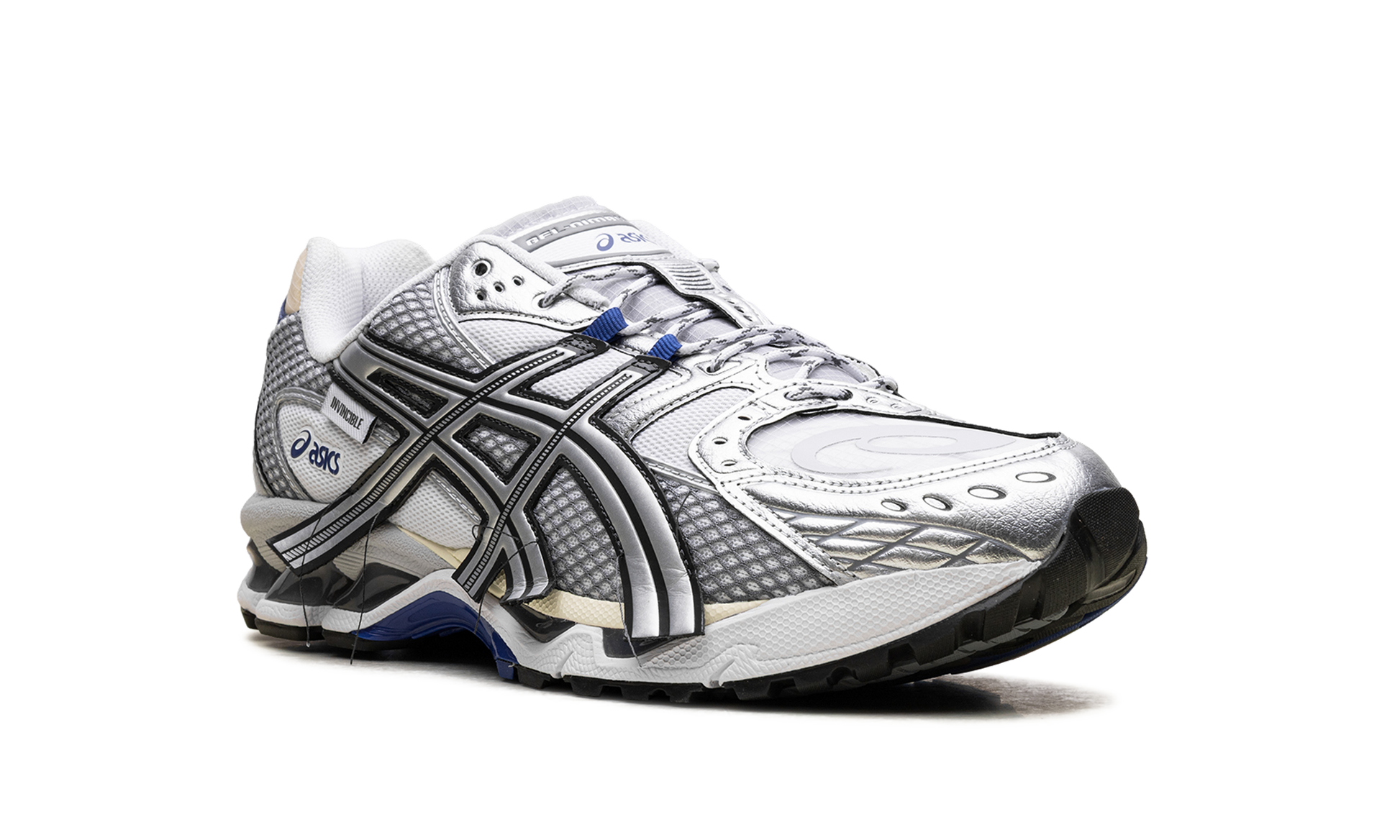 Get ready for the digital age of design with the highly sought-after ASICS GEL-Nimbus 10.1 INVINCIBLE "HTTP 404". This collaboration with INVINCIBLE channels the chaos of a digital error message. featuring a deconstructed upper with exposed threads and a semi-translucent ripstop toe box. Metallic silver overlays and sharp blue accents pop over a pure silver and white base. The signature GELâ„?cushioning and TRUSSTICâ„?system provide the ultimate underfoot comfort. making this a stable and utterly unique collector's piece.