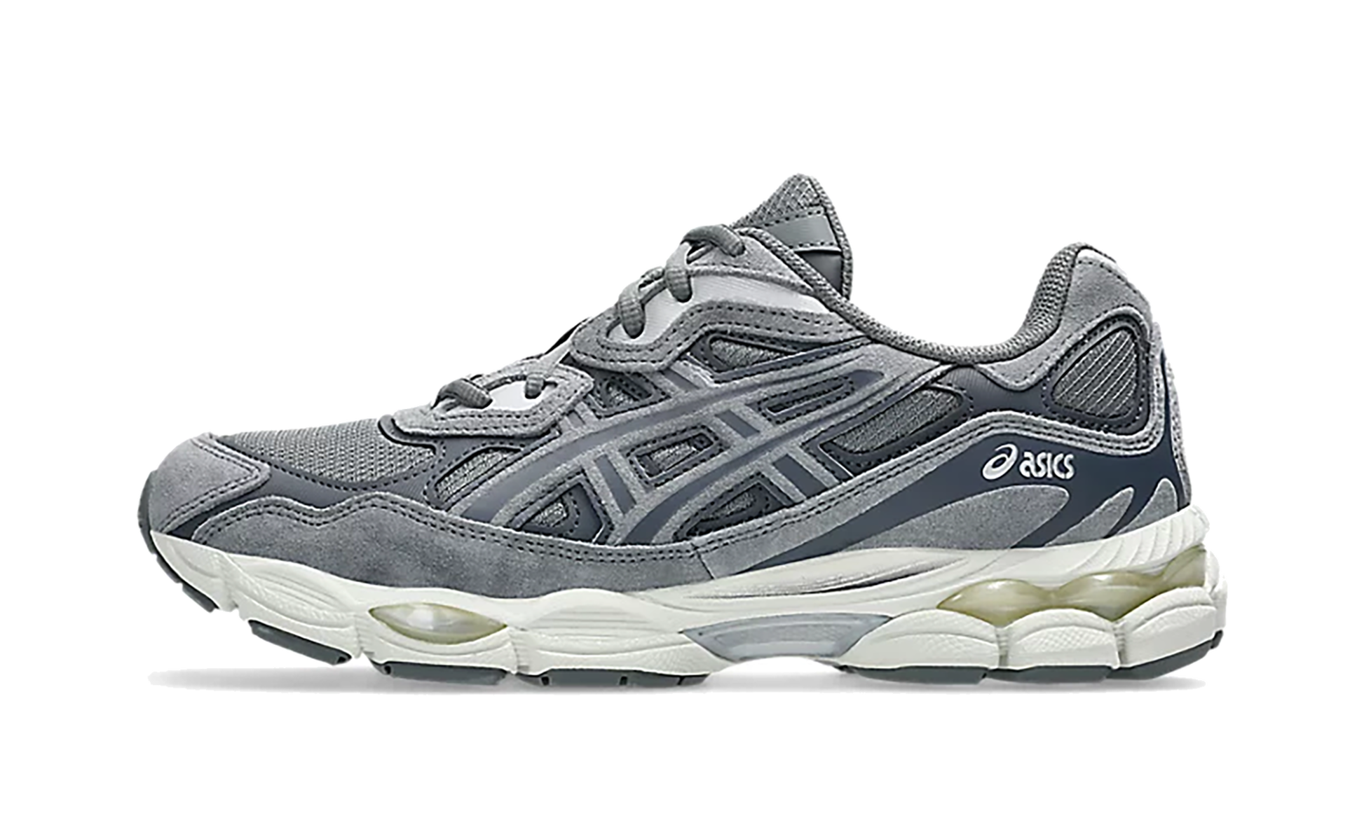 Achieve effortless urban cool with the ASICS GEL-NYC "Steel Grey/Carrier Grey" sneaker! This seamless fusion of past and present technology draws the upper's inspiration from the early 2000s GEL-NIMBUS® 3 and GEL-MC PLUSâ„?V. The understated Steel Grey and Carrier Grey palette highlights the complex layering of breathable mesh and premium suede overlays. The midsole incorporates GEL-CUMULUS® 16 tooling with GEL technology inserts for cushioned. retro-tech comfort perfect for all your city adventures.