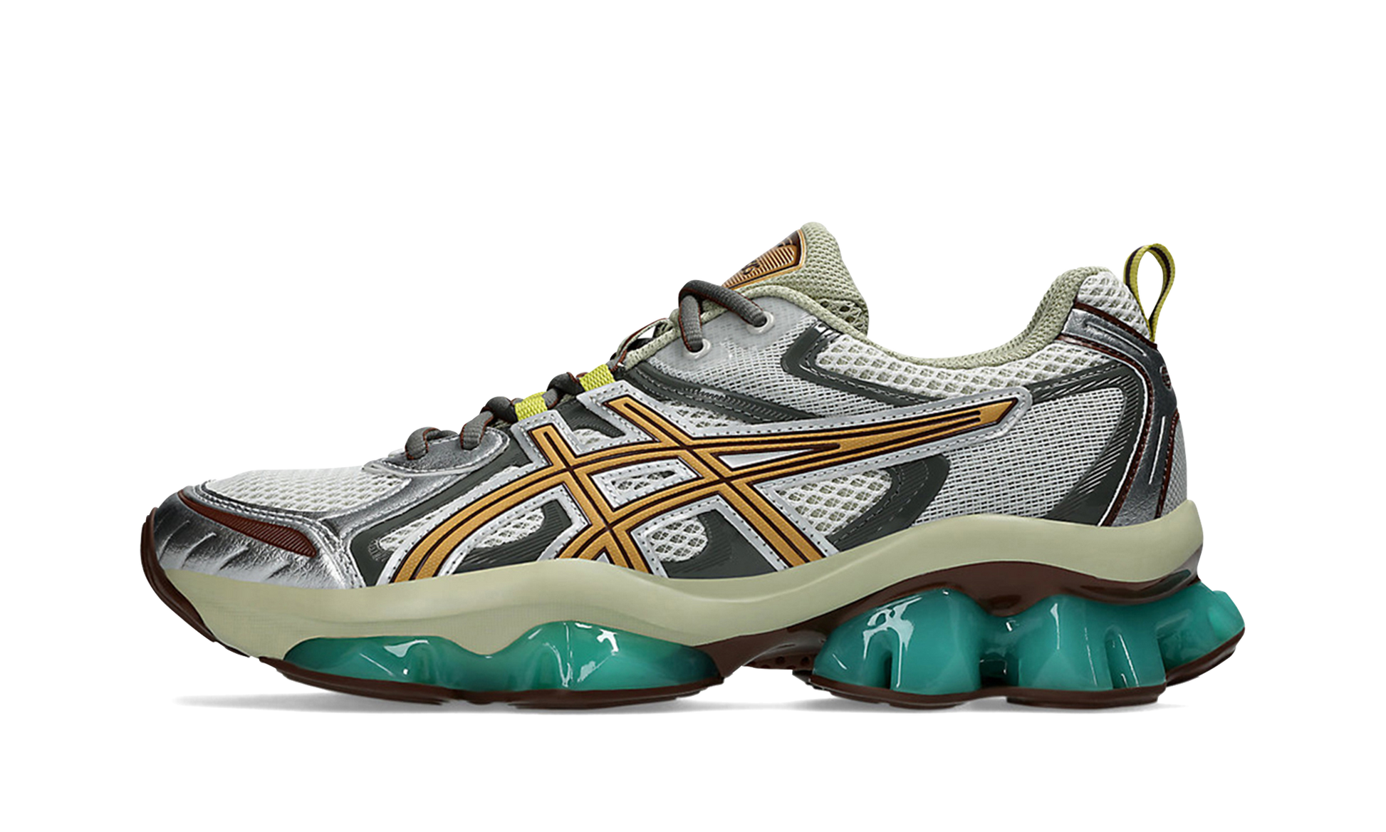 A futuristic vision in a versatile colorway. the ASICS GEL-Quantum Kinetic 'White/Khaki' blends experimental engineering with everyday functionality. Its layered mesh and synthetic upper draws inspiration from iconic ASICS running series. including the GEL-KINSEI. The clean white base is grounded by subtle khaki accents. making for a sleek aesthetic built for urban exploration. Experience next-level comfort with FF BLAST cushioning and the innovative Scutoid GEL technology. which utilizes a 3D geometry for optimized shock absorption in daily scenarios.