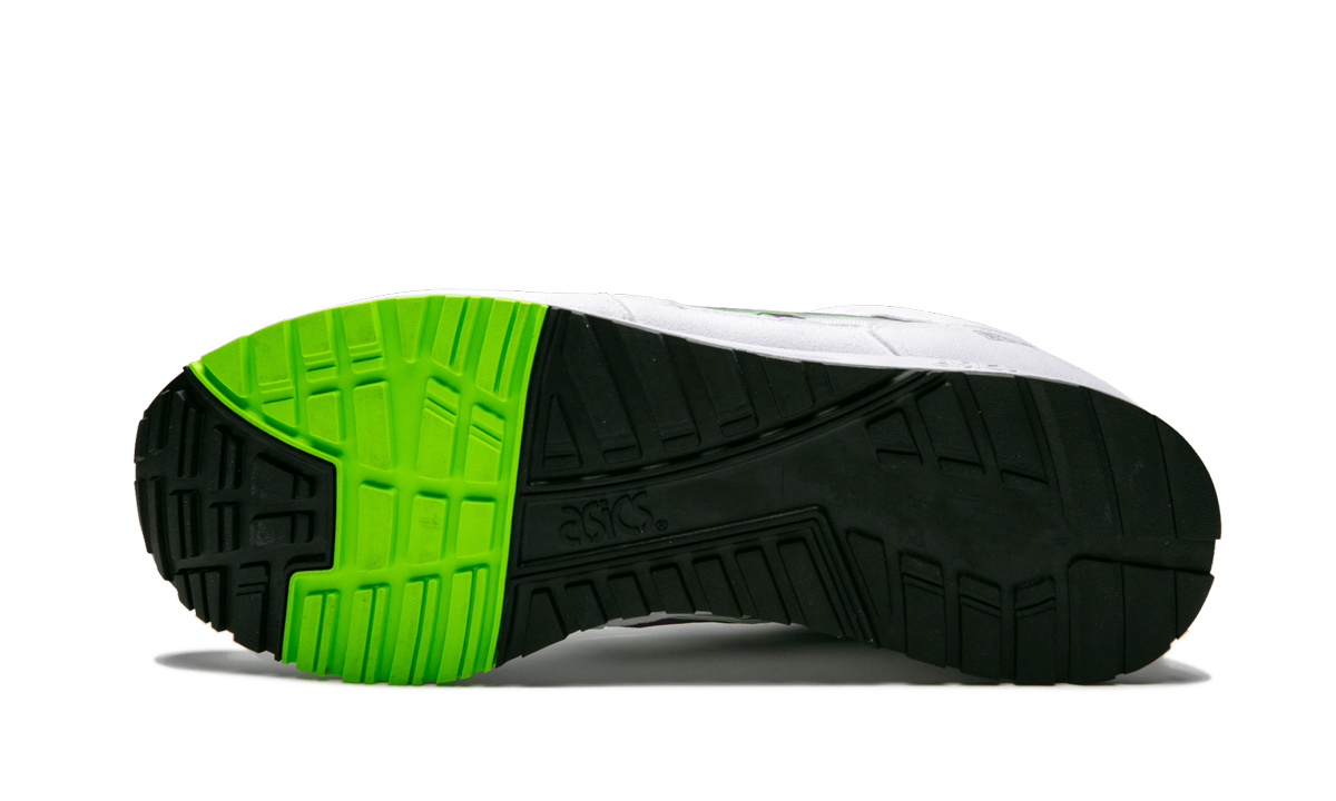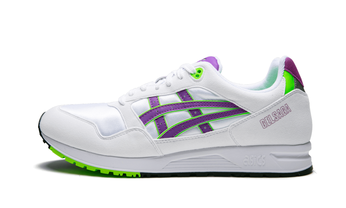 The Asics Gel Saga. an Asics original running sneaker that dates back to 1990. makes its return. The low-top Asics runner features a white suede upper with textile underlays and purple and green highlights on the striping. The neon colors also take shape on the tongue and heel. The Asics Gel Saga is finished with a white midsole and black and neon green outsole. The word “Gel Sagaâ€?makes itself known in hollowed-out block letters on the sneaker's heel counter.