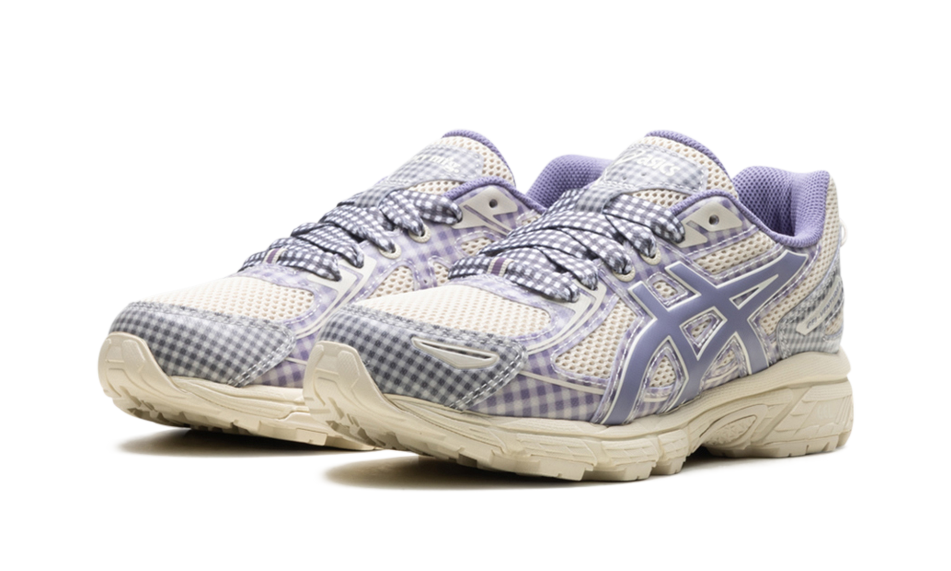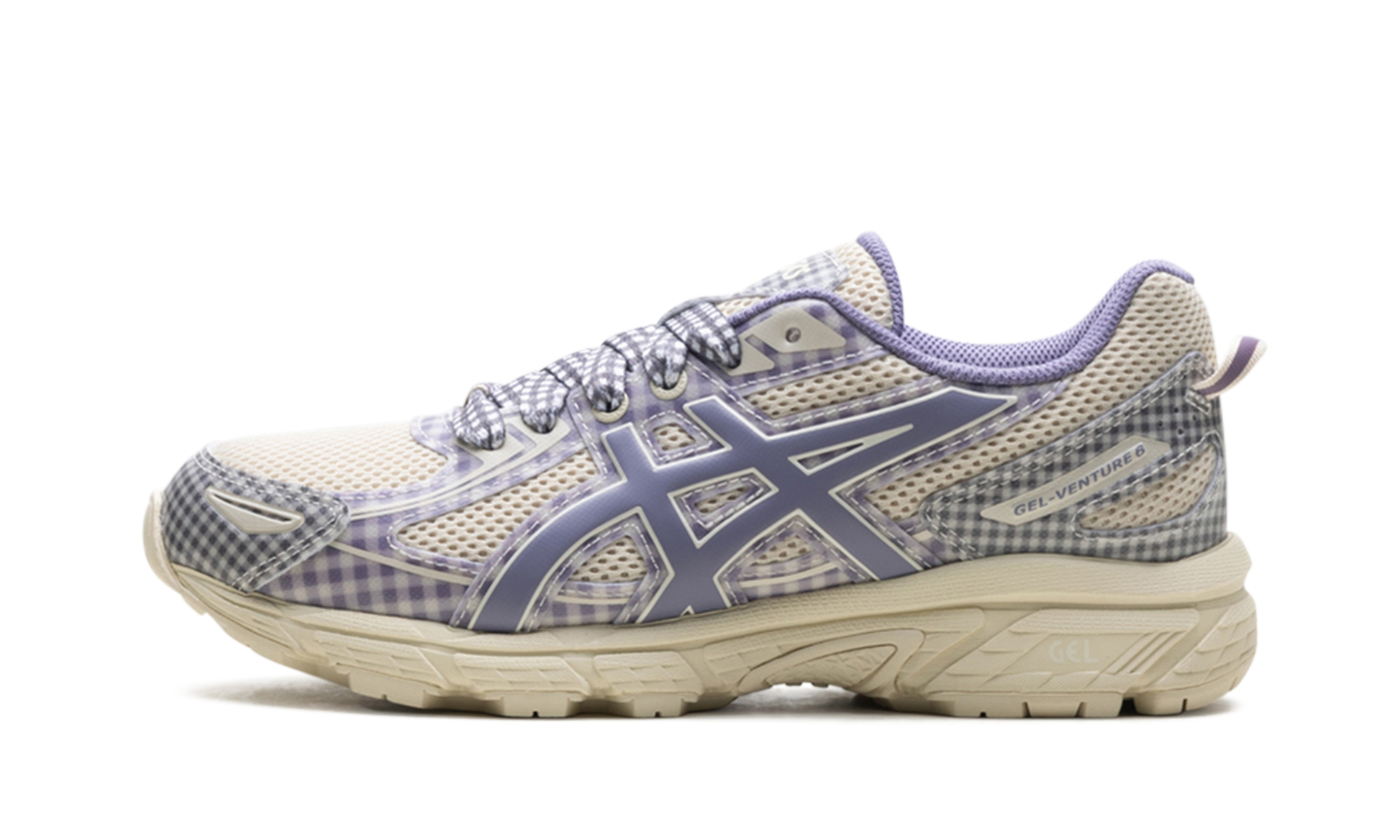 Blending ethical design with trail functionality. the ASICS GEL-Venture 6 Story mfg. "Vanilla Violet Quartz" is perfect for the mindful explorer. This collaboration reworks the classic trail shoe with breathable mesh and whimsical gingham-check fabric overlays in soft vanilla and lilac tones. The model features rearfoot GELâ„?technology for superb shock absorption and a trail-specific outsole for confidence across city streets or rugged terrain. It champions a "slow-made." sustainable aesthetic.