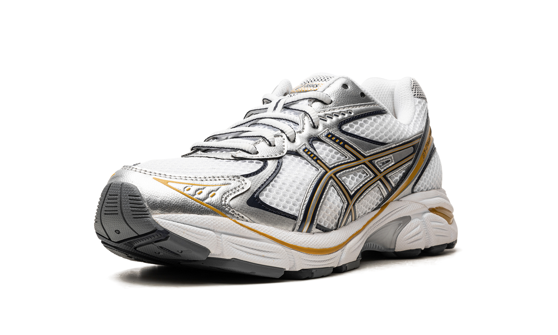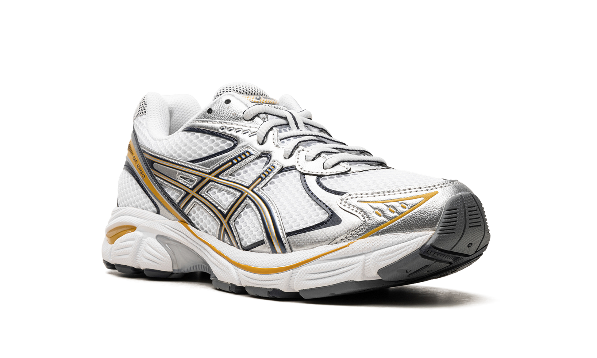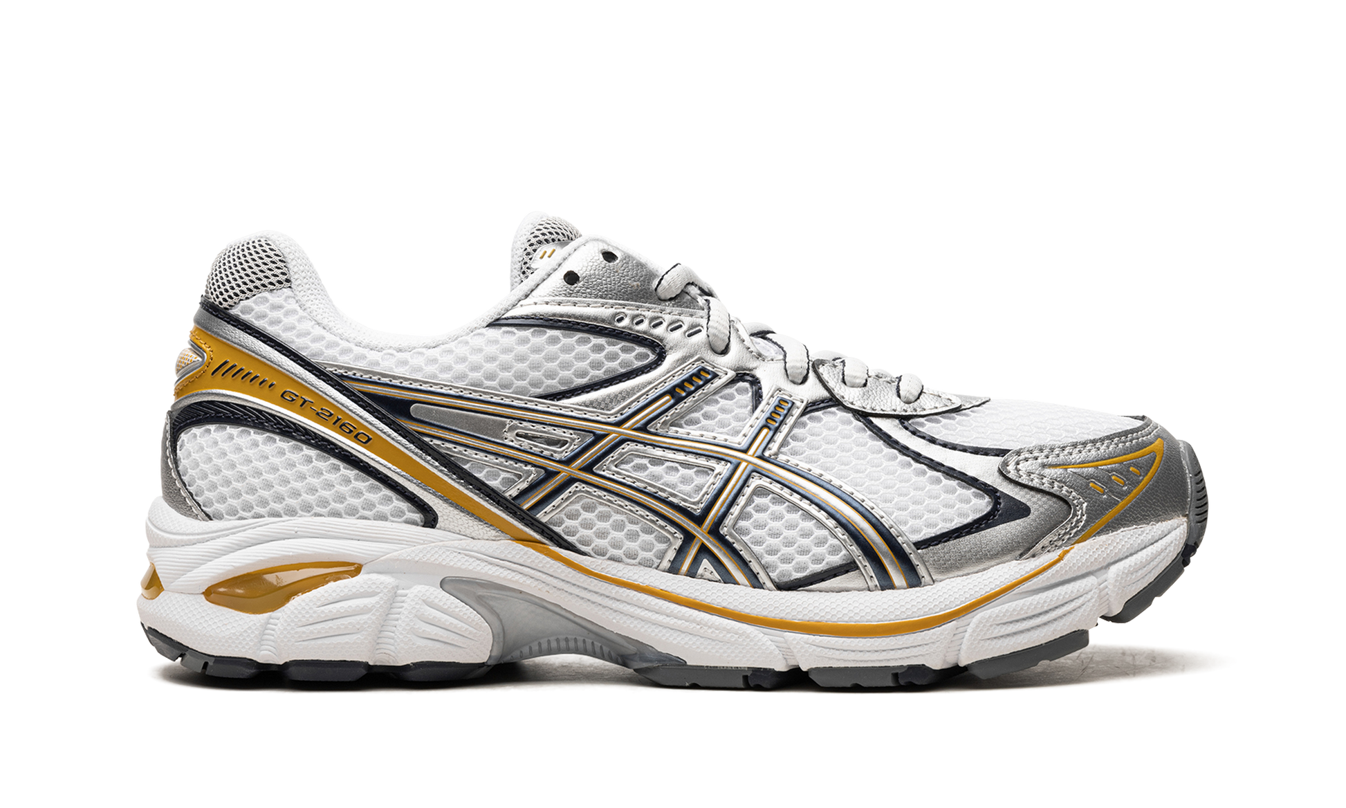 The ASICS GT-2160 “White/Pure Silver/Goldâ€?is a versatile colorway of the retro running shoe with gold accents. Inspired by the early 2000s running shoe aesthetic. the ASICS GT-2160 is a casual shoe that's both futuristic and comfortable. The shoe's upper features a white open mesh construction and metallic silver overlays with gold accents. ASICS's Gel cushioning technology is embedded in the heel of the midsole for all-day comfort.