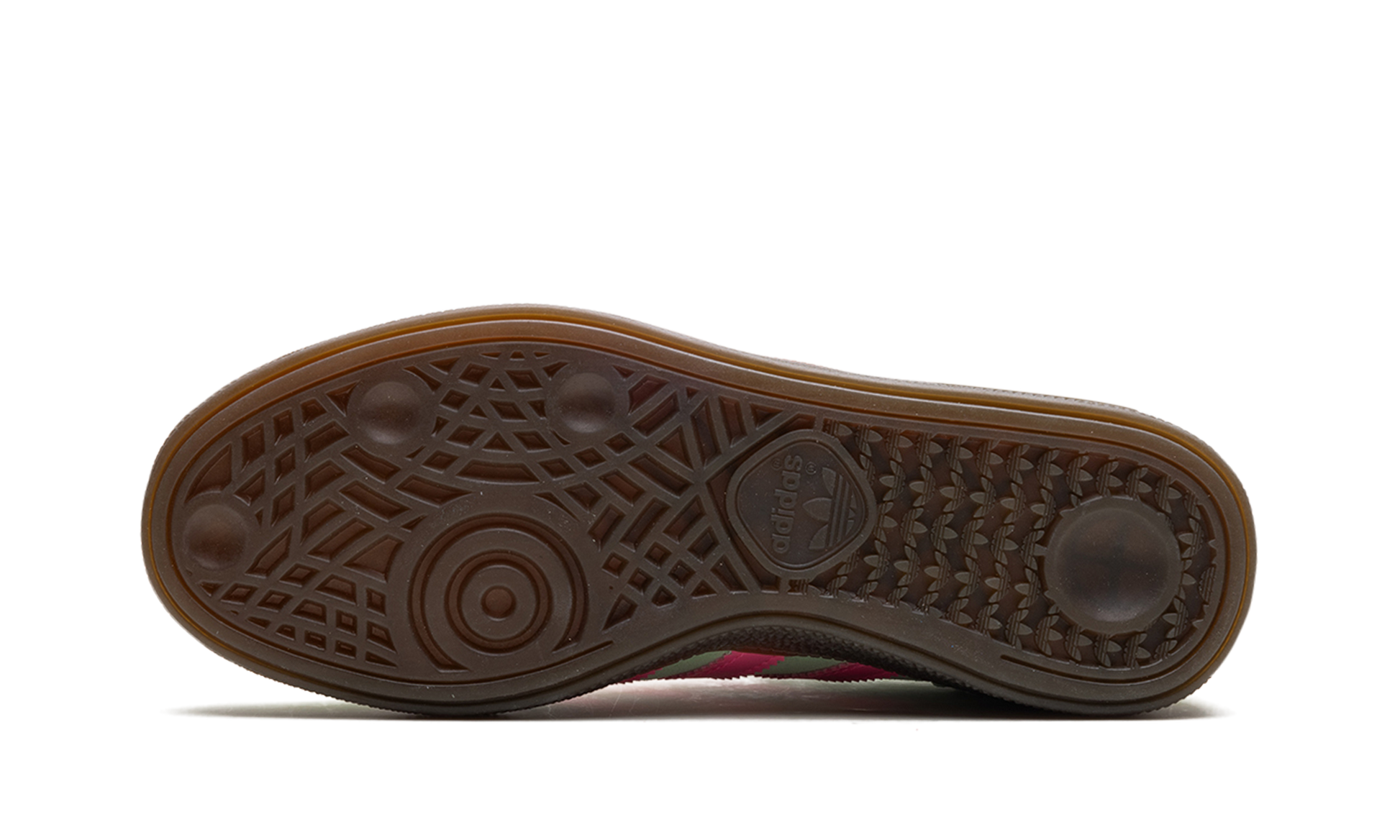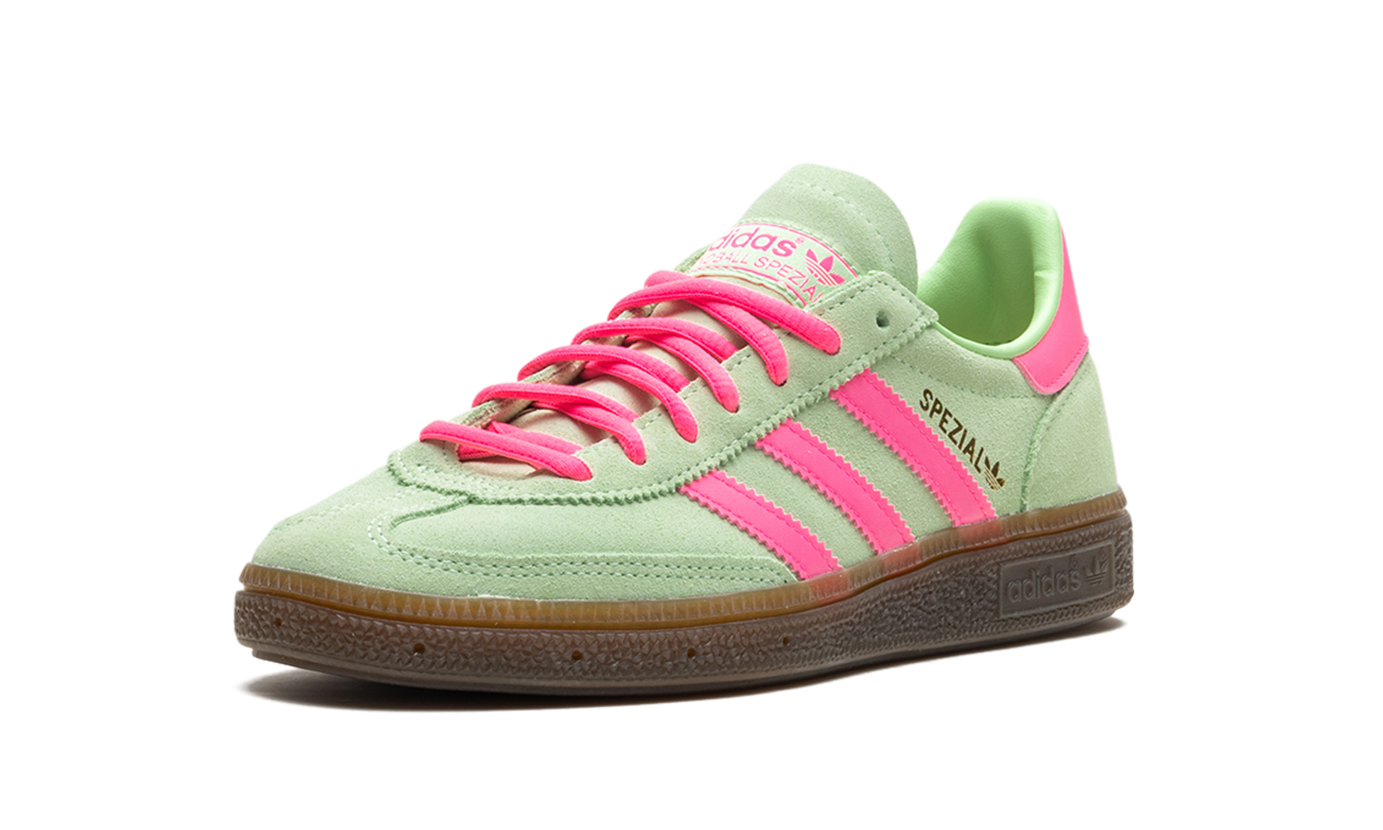 The adidas Handball Spezial “Semi Green Sparkâ€?is a head-turning colorway of the retro shoe by the popular footwear brand. The adidas Handball Spezial is a popular. casual sneaker with a versatile silhouette. On this colorway. the shoe features a Semi Green Spark suede upper with Lucid Pink leather Three Stripes on the sides. More Lucid Pink accenting can be found on the leather heel tab. laces. and on the “adidasâ€?branding printed on the tongue. The shoe's design is rounded into form with a dark gum rubber sole.