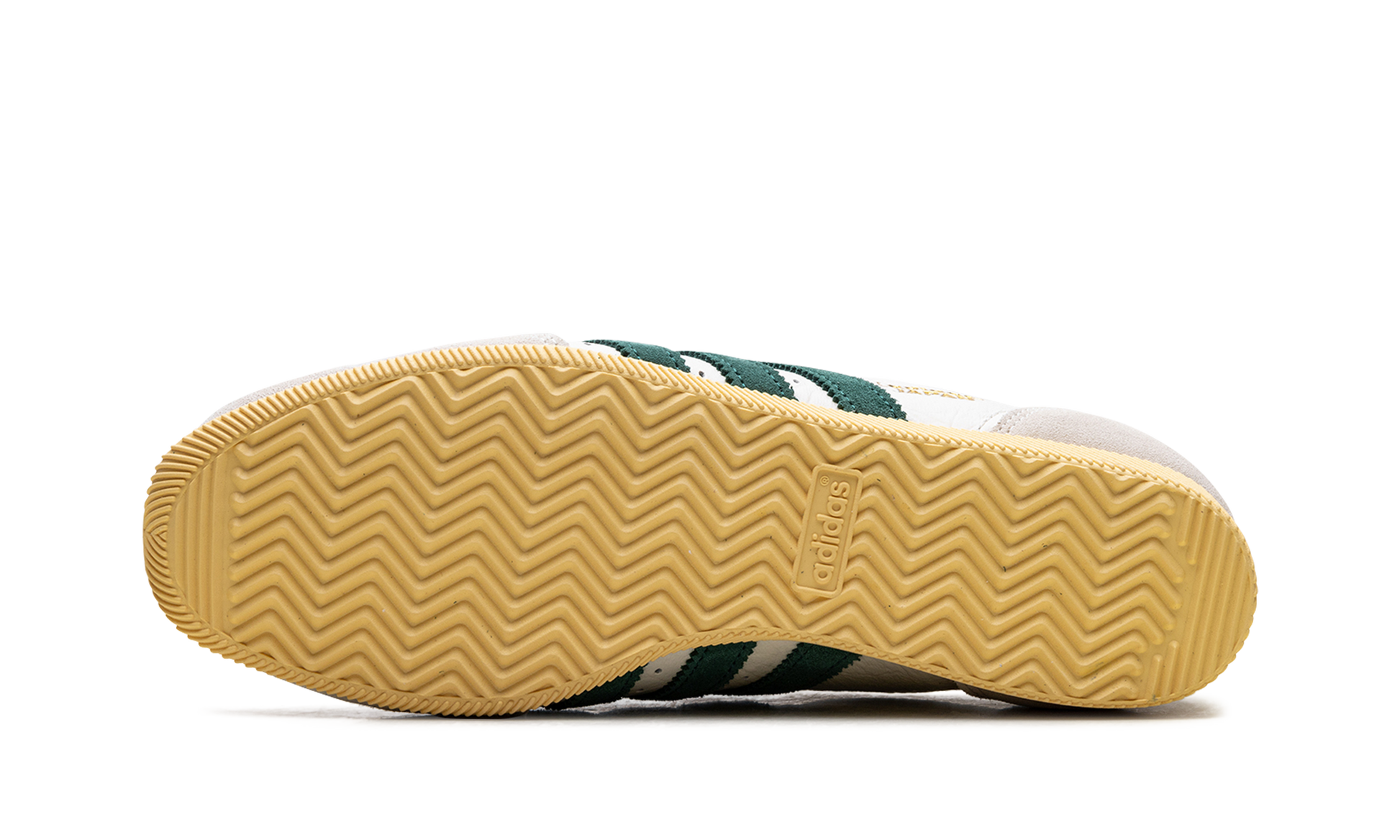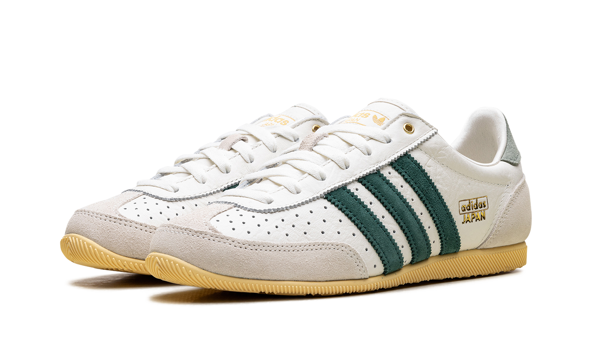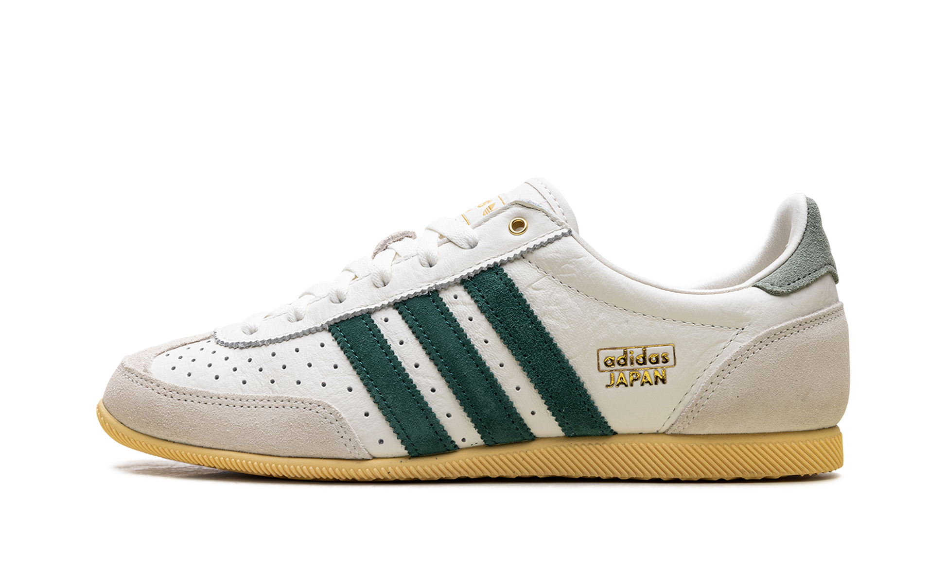 Relive a piece of athletic history with the Adidas Japan Wmns "Off White Collegiate Green" sneaker. A faithful reissue of a 1964 trainer. this shoe keeps the iconic slim. low-profile design that launched in Japan. The vintage look is perfected with a tumbled perforated leather upper in Off White. accented by the Collegiate Green serrated 3-Stripes. Classic details like the double-stitched T-toe and a durable rubber outsole offer a clean. premium. and versatile style for your everyday rotation.