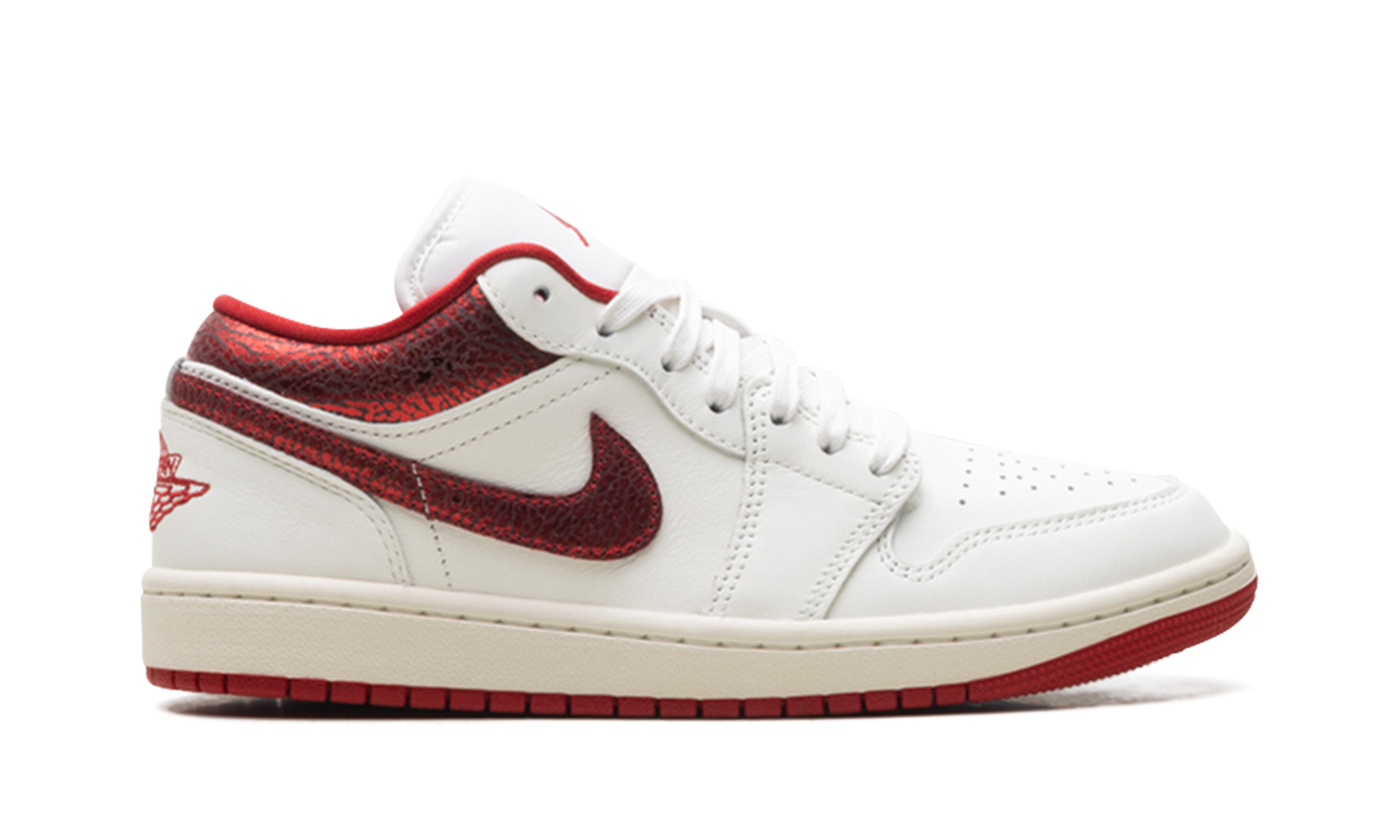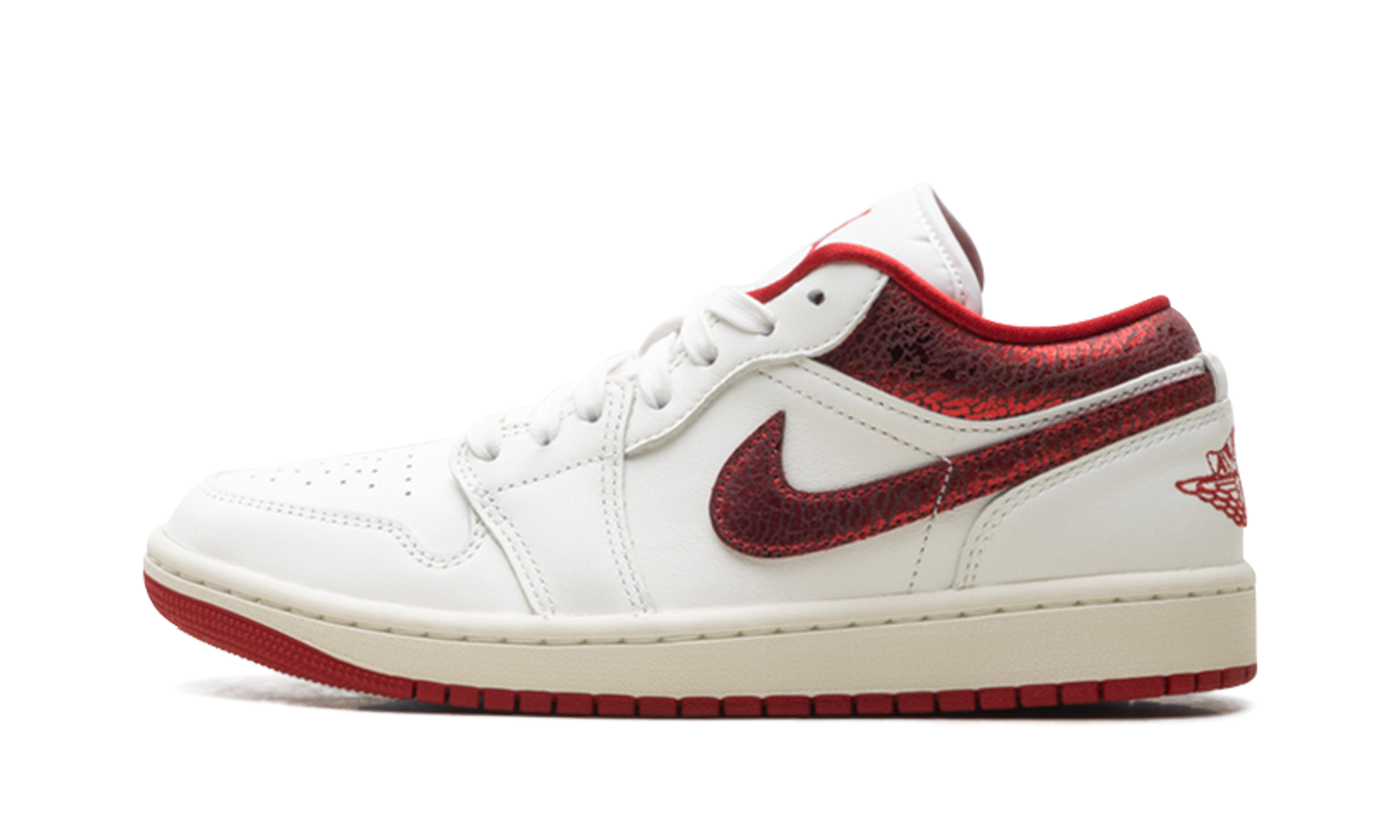 Ignite your style with the Air Jordan 1 Low WMNS "Ruby." This women's-exclusive sneaker celebrates the classic low-top silhouette with a luxurious finish. drawing inspiration from the brilliance of its namesake gemstone. It features a crisp Sail leather base with Varsity Red cracked metallic leather overlays that shimmer like a ruby. An embroidered Wings logo and encapsulated Air-Sole unit deliver a comfortable fit and a truly stunning. legendary aesthetic.