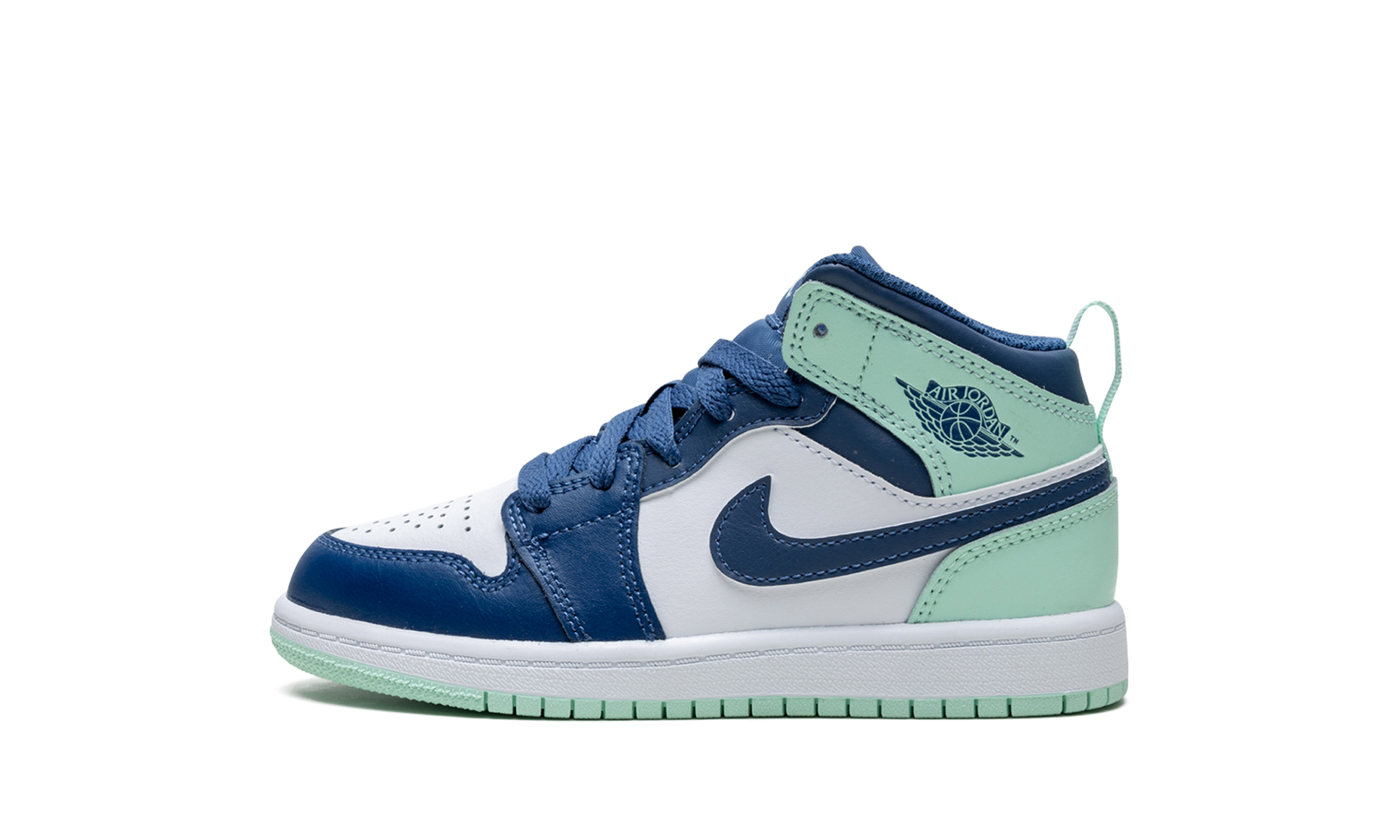 The Jordan 1 Mid PS “Blue Mintâ€?is the preschool sizing of Michael Jordan's first signature shoe in a colorway that combines refreshing blue and mint green hues. The Jordan 1 Mid in “Blue Mintâ€?is complete with a white leather base with Mystic Navy leather overlays on the toe cap. forefoot. and eyelets. The same shade of blue is also found on the leather Swoosh and on the “Wingsâ€?logo on the collar. Both the collar and heel panels are arranged in Mint Foam leather. As is the nylon pull tab on the heel that assists with on/off wearability.