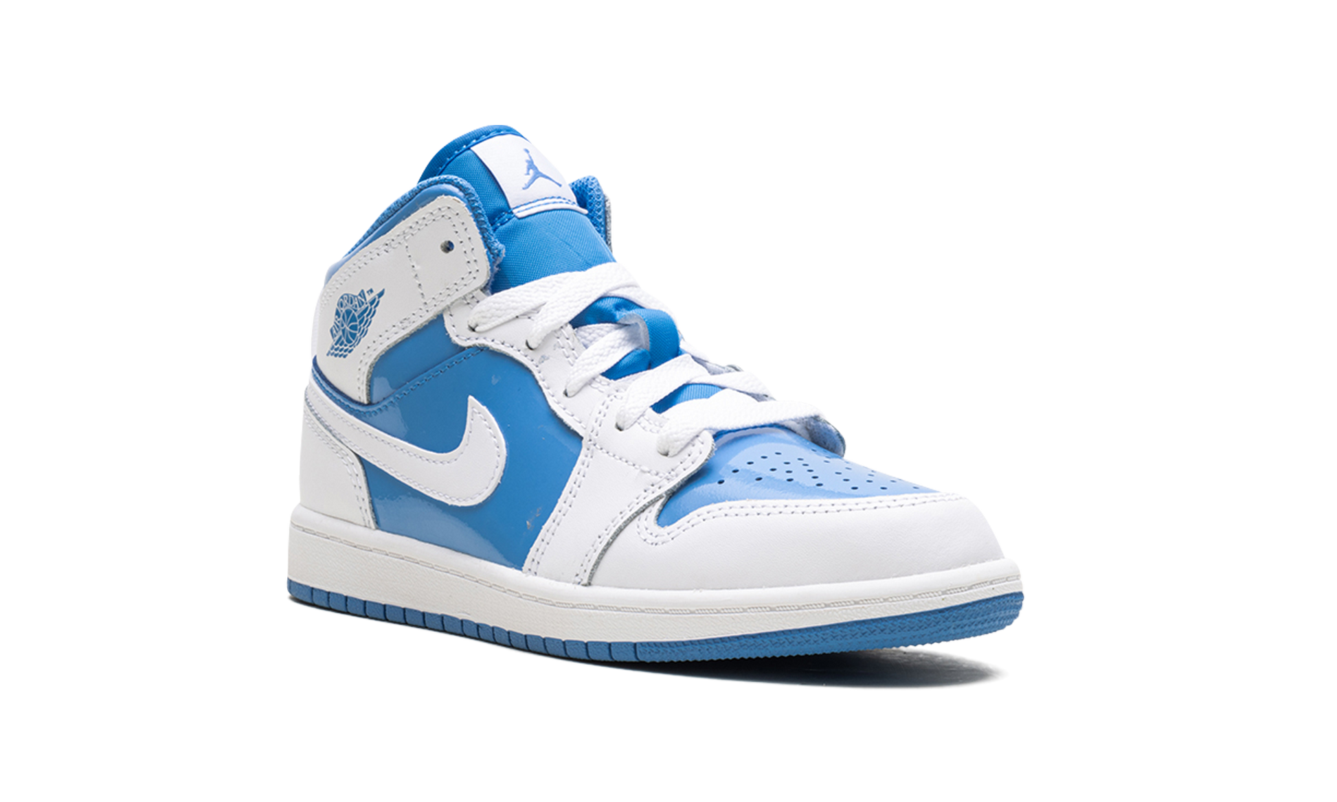 Get your little one flying high in the Jordan 1 Mid PS "Legend Blue." This Preschool-sized shoe showcases Michael Jordan's iconic UNC-inspired colorway. featuring crisp white and vibrant Legend Blue accents on the patent leather overlays. The mid-top silhouette offers a supportive fit. while the Air-Sole unit delivers lightweight cushioning. This stylish sneaker ensures your child is repping Jordan's legendary beginnings with every comfortable step.