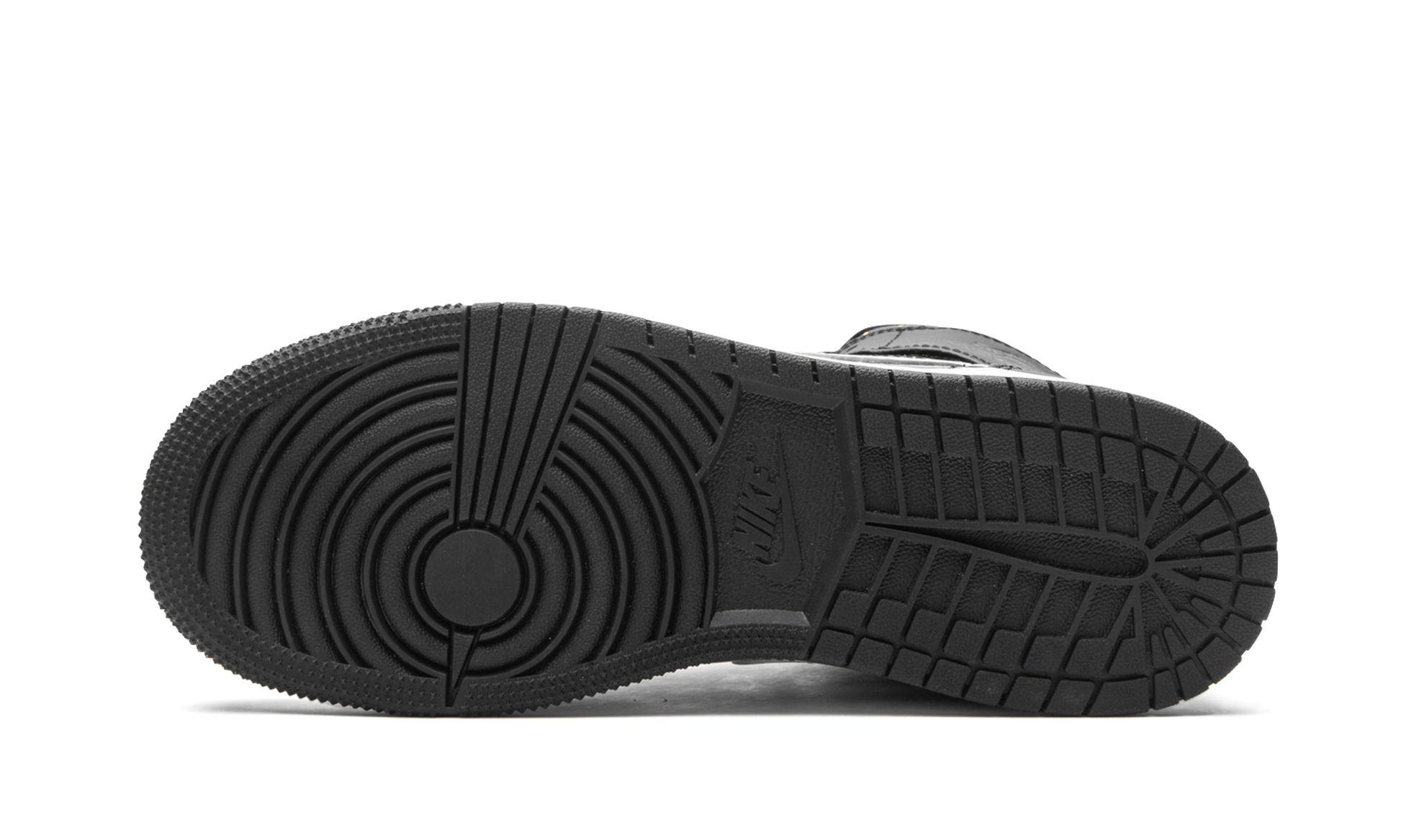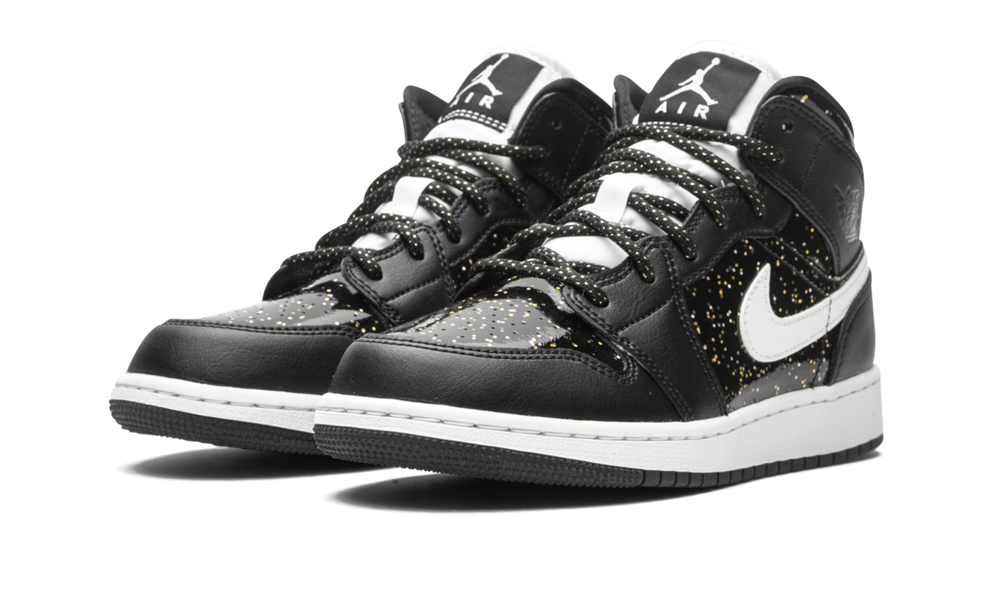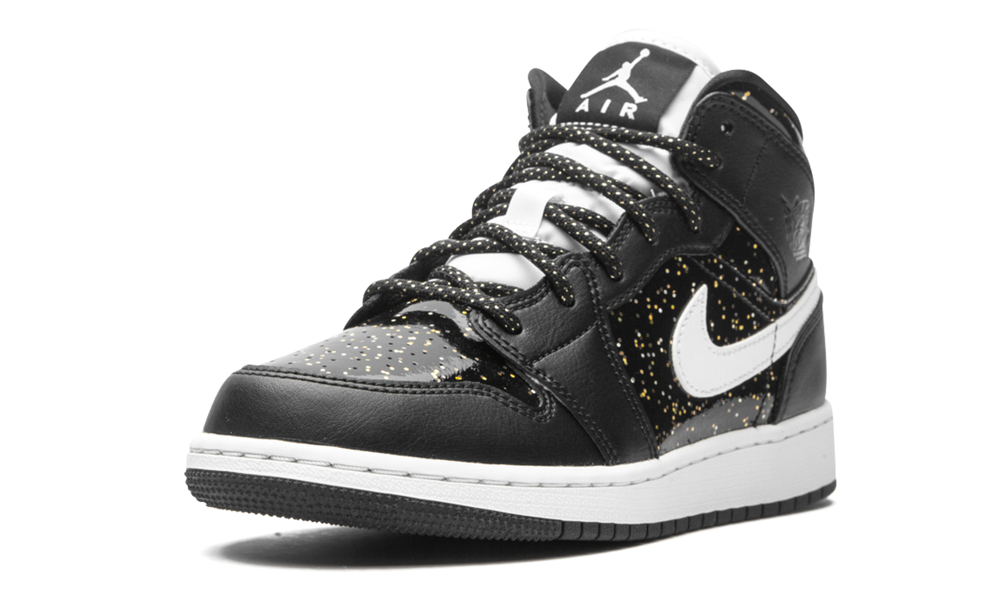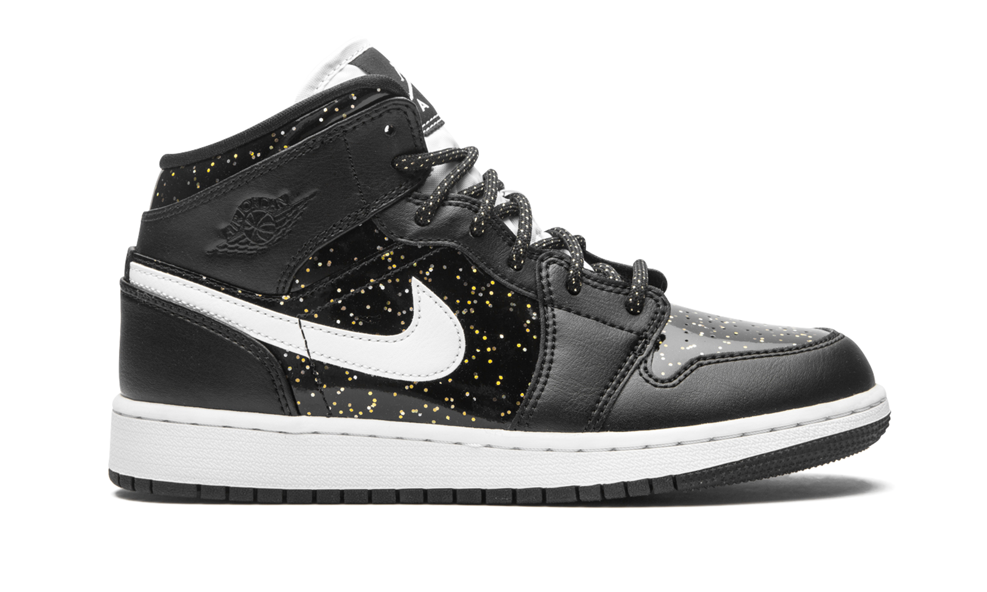 The Air Jordan 1 Mid SE GS “Black Glitterâ€?is a kids-exclusive colorway of Michael Jordan's first signature shoe in a unique and flashy look. The design of the “Black Glitterâ€?looks like something one could find looking through a telescope pointed to the sky at night. Smooth black patent leather with the previously mentioned speckled glitter motif appears on the perforated toe. mid-panel. and collar for a starry effect. The same outer space-like design is used on the rope laces. as well. Tonal tumbled leather overlays on the forefoot. eyelets. collar. and heel balance the look of the “Black Glitter.â€?A white leather Swoosh is located on the mid-panel and an embossed “Wingsâ€?logo appears on the collar. A black tongue tag with white Jumpman branding is stitched onto the white nylon tongue to complete the look.