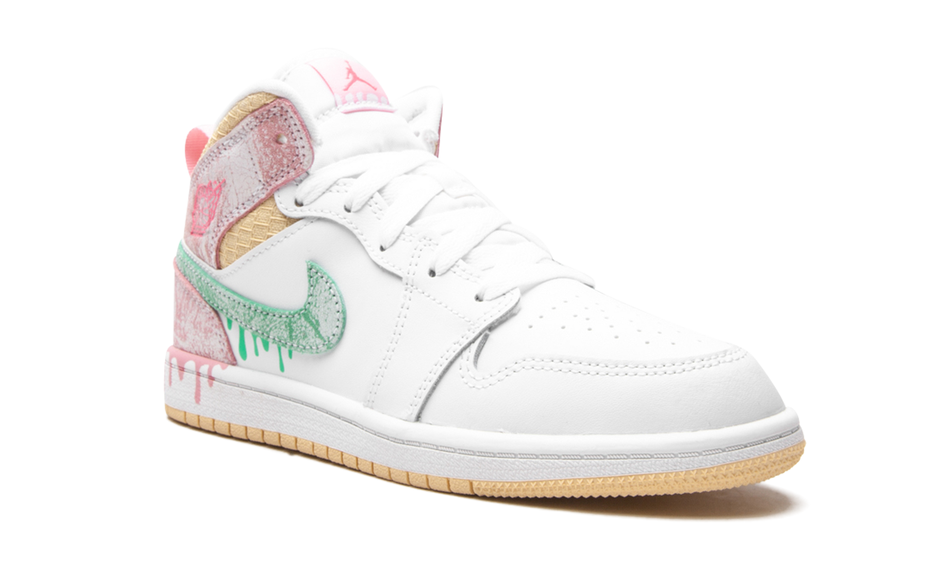 The Jordan 1 Mid PS “Ice Creamâ€?is a preschool version of Michael Jordan's first signature shoe in a summertime inspired colorway. As its name suggests. the design of the “Ice Creamâ€?features drippy green-and-pink paint on the Swoosh and collar. respectively. that looks like ice cream melting from an ice cream cone. Jordan Brand goes as far as to place a golden honeycomb design on the collar for the full effect. An embroidered pink “Wingsâ€?logo resides on the collar and a pink nylon pull tab appears on the heel. The base of the shoe is finished off in white leather. A pink Jumpman logo dots the branding tag on the top of the white nylon tongue. Jordan Brand finishes off the “Ice Creamâ€?with a white midsole and contrasting tan outsole.