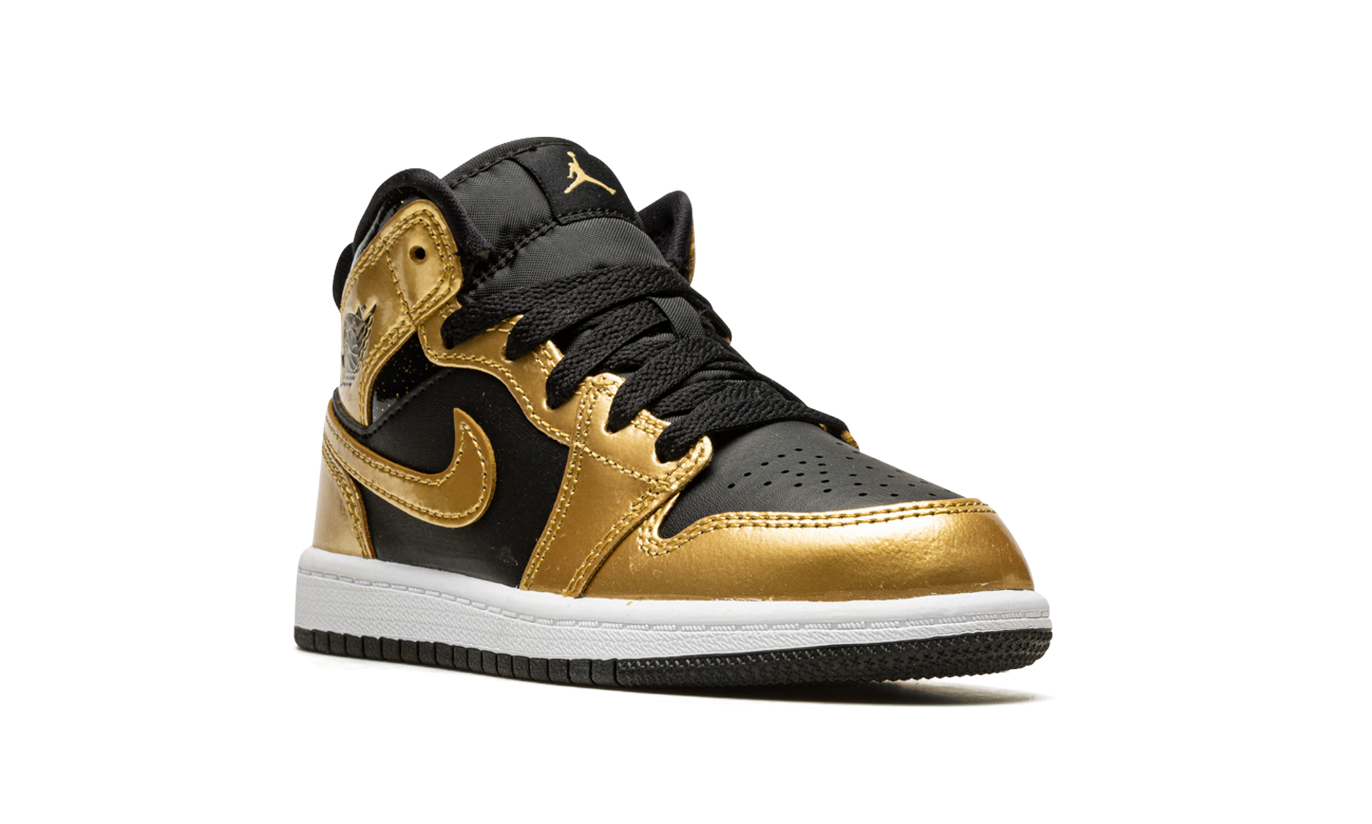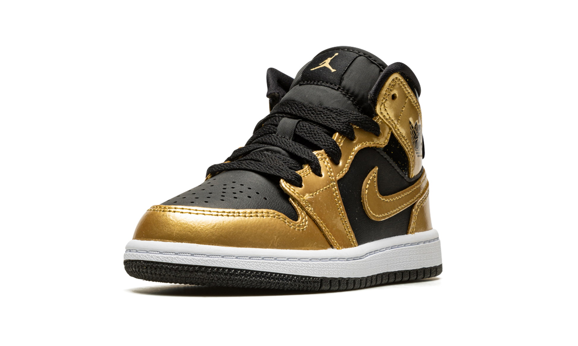The Air Jordan 1 Mid PS “Metallic Goldâ€?is the preschool sizing of the popular lifestyle shoe in a can't-miss colorway with gold accenting. The “Metallic Goldâ€?Jordan 1 Mid features a black leather base with Metallic Gold leather overlays on the toe. forefoot. collar. heel. and on the leather Swoosh found on both sides. A black “Wingsâ€?logo appears on the collar overlay while a gold Jumpman is found on the black nylon tongue tag on the black nylon tongue. The white rubber midsole and black rubber outsole complete the look. Release date: October 6. 2022