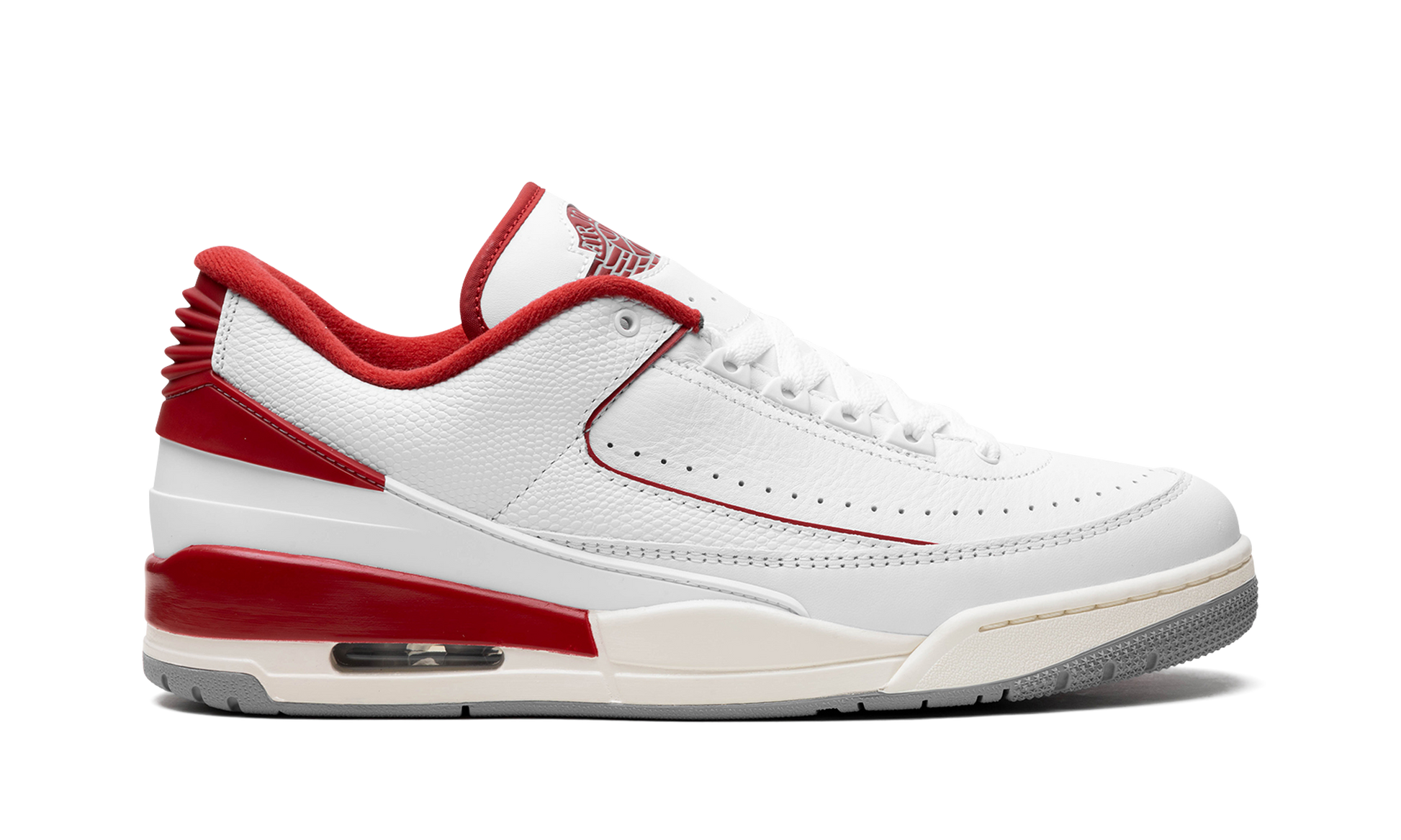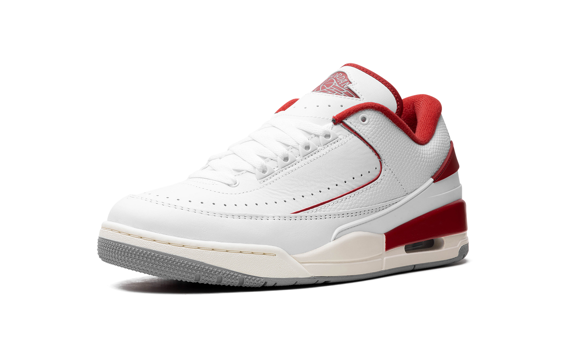 The Jordan 2/3 GS “Varsity Redâ€?is the youth sizing of the Chicago Bulls-inspired colorway of the hybrid sneaker that combines elements of the Air Jordan 2 and Air Jordan 3. The Jordan 2/3 fuses details from the Jordan 2 and Jordan 3. including the sole unit from the Jordan 3 and and the upper construction of the Jordan 2 Low. among other features. On this colorway. the shoe has a white leather construction with contrasting Varsity Red accents on the “Wingsâ€?logo on the tongue. on the inner lining. on the heel counter. and mudguard. Perforations around the toe provide ventilation. The Jordan 3-inspired midsole has a slightly aged look and features an Air unit in the heel.