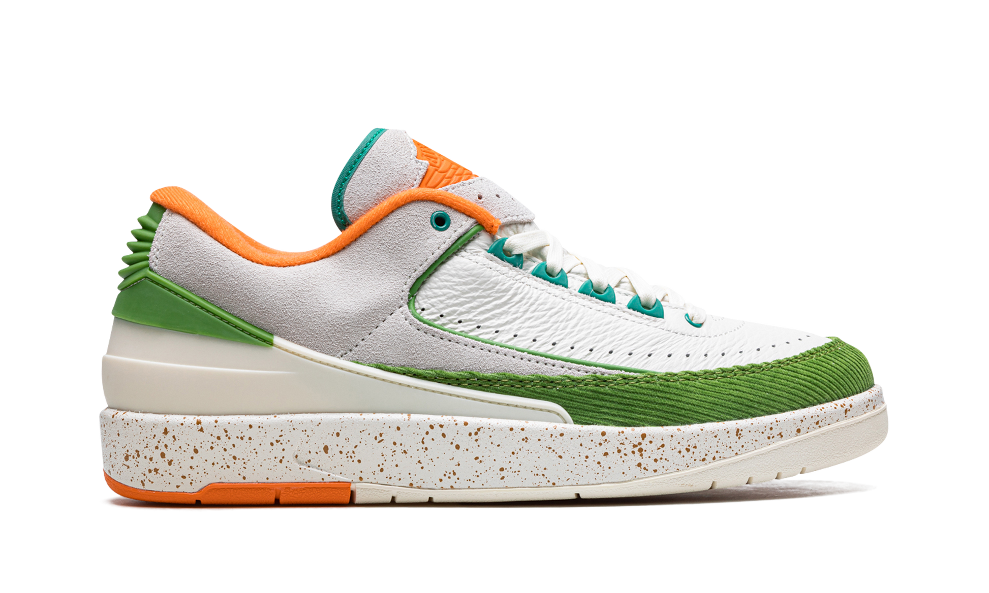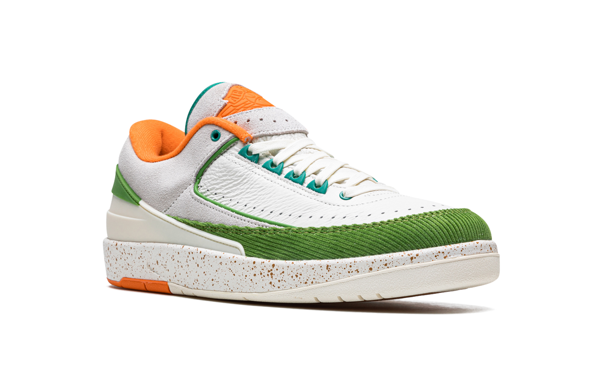 The Titan x Women's Air Jordan 2 Low is a collaboration by the Manila-based boutique and Jordan Brand on a women's-exclusive colorway of the retro basketball shoe. Titan's spin on the Jordan 2 Low gives the shoe a decidedly tropical look with warm hues across its design. Chlorophyll detailing appears on the corduroy overlay on the toe and on the plastic heel counter. Safety Orange detailing comes into play on the interior. on the “Wingsâ€?branding on the tongue. and on the outsole. As for the rest of the shoe's appearance. the upper features a white leather base with contrasting grey suede on the sides.