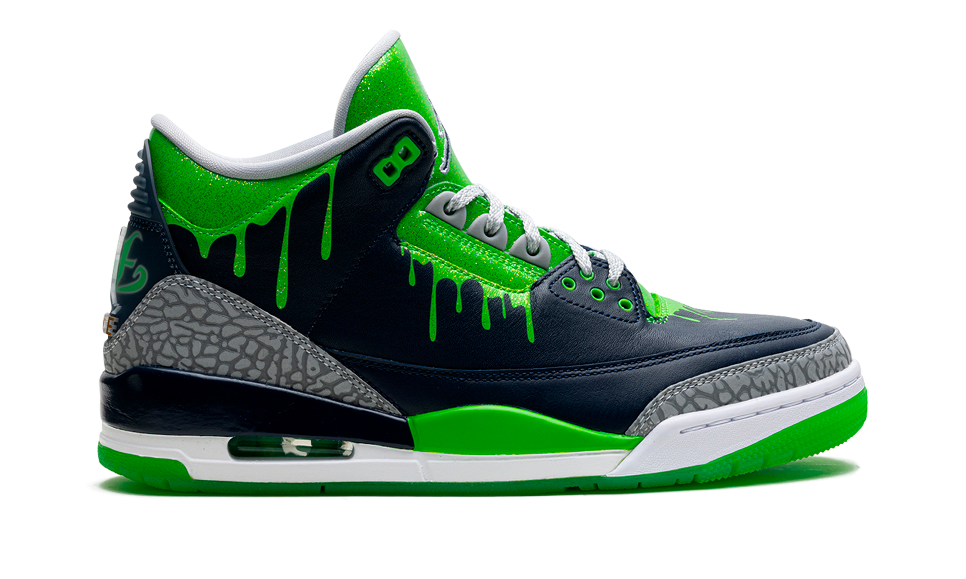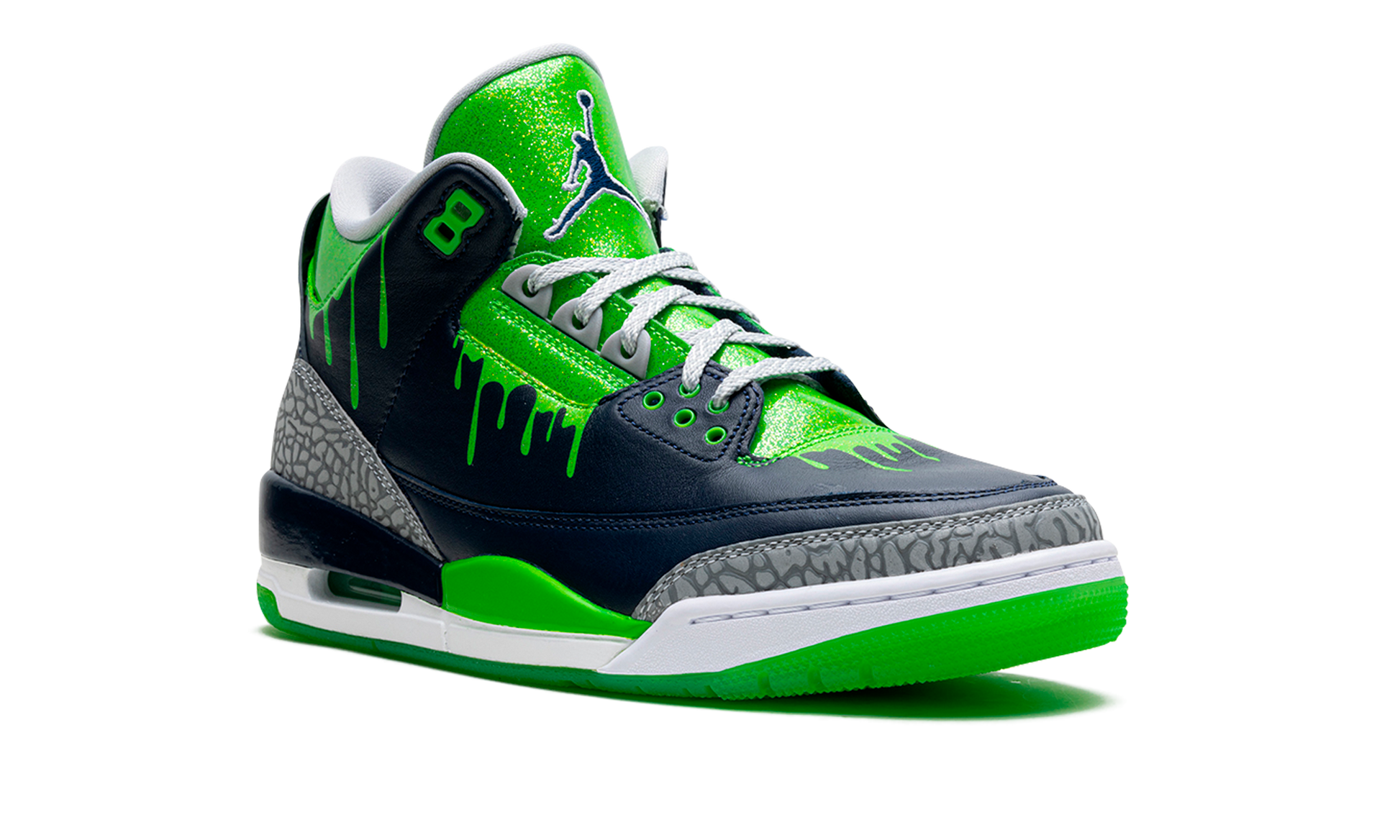 The Doernbecher x Air Jordan 3 “Hugoâ€?is a special colorway released as part of Nike's Doernbecher Freestyle collection with Doernbecher Children's Hospital in 2023. The Jordan 3 “Doernbecherâ€?is designed by Hugo Covarrubias Molina. and is inspired by his favorite football team. the NFL's Seattle Seahawks. The team's colors are found on the design. giving the sneaker an eye-catching appearance. Specifically. the upper features a dark navy leather base and grey elephant print overlays. A unique drip pattern in a neon green hue with sparkles appears throughout the design. Hugo's own signature branding can be found on the translucent heel counter. along with a Jumpman and Hugo's nickname. “Juice.â€?Other details include glow-in-the-dark laces. and a green-tinted translucent outsole with the phrase “It's OK to be different.â€?A gold-plated hangtag completes the look. Release date: December 2. 2023