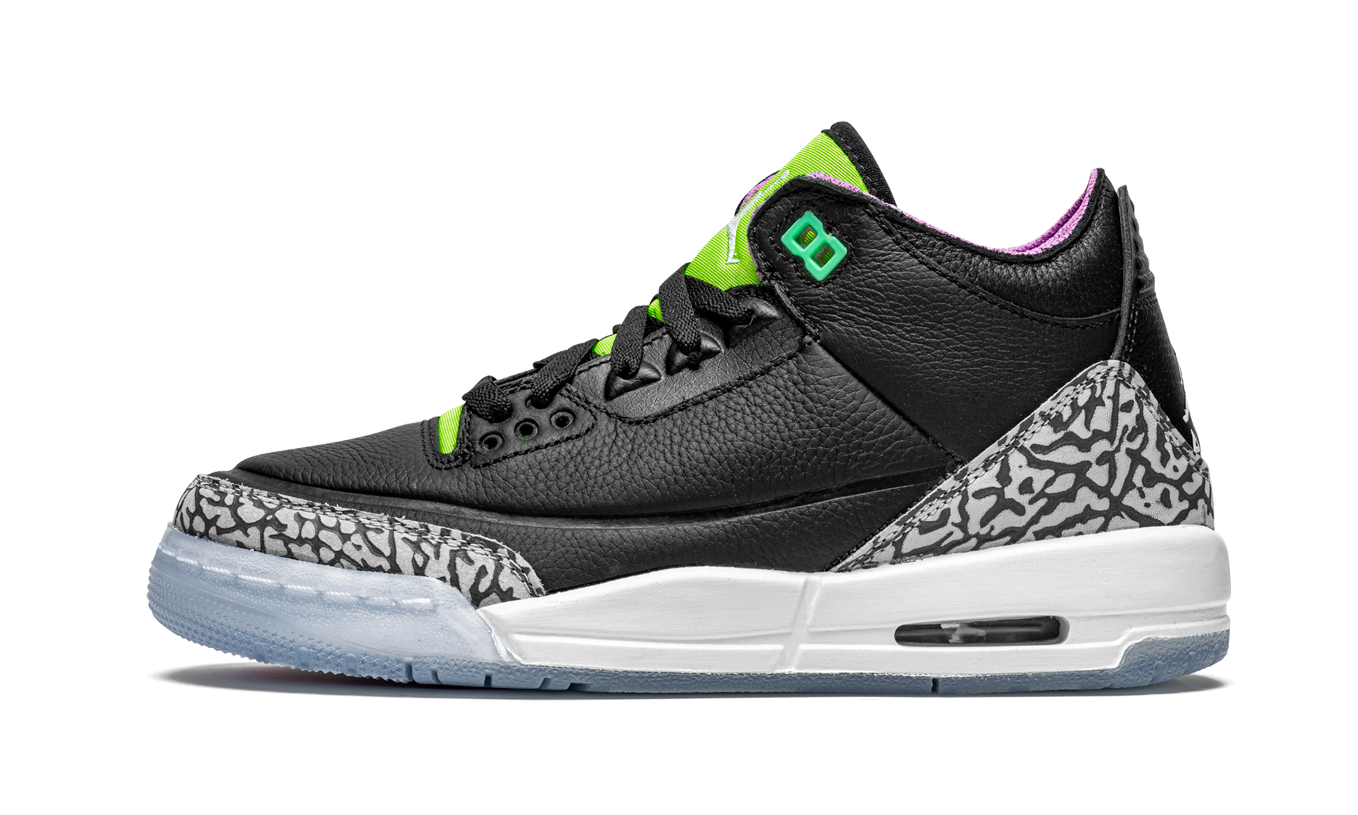 The Air Jordan 3 GS “Electric Greenâ€?is a youth exclusive colorway released in May 2021 of Michael Jordan's third signature shoe. A potent look that could easily hold its weight as an adult sizing option. the “Electric Greenâ€?combines neon-colored accents with a black tumbled leather upper. Jordan Brand embroidered a white Jumpman on the Electric Green tongue and dressed the inner collar in Violet Shock. The model's original elephant print appears on both the toe and the heel. A Jumpman logo can be found on the back of the shoe and a small visible Air unit appears in the heel of the white midsole. An icy blue translucent outsole completes the look. Release date: May 13. 2021.