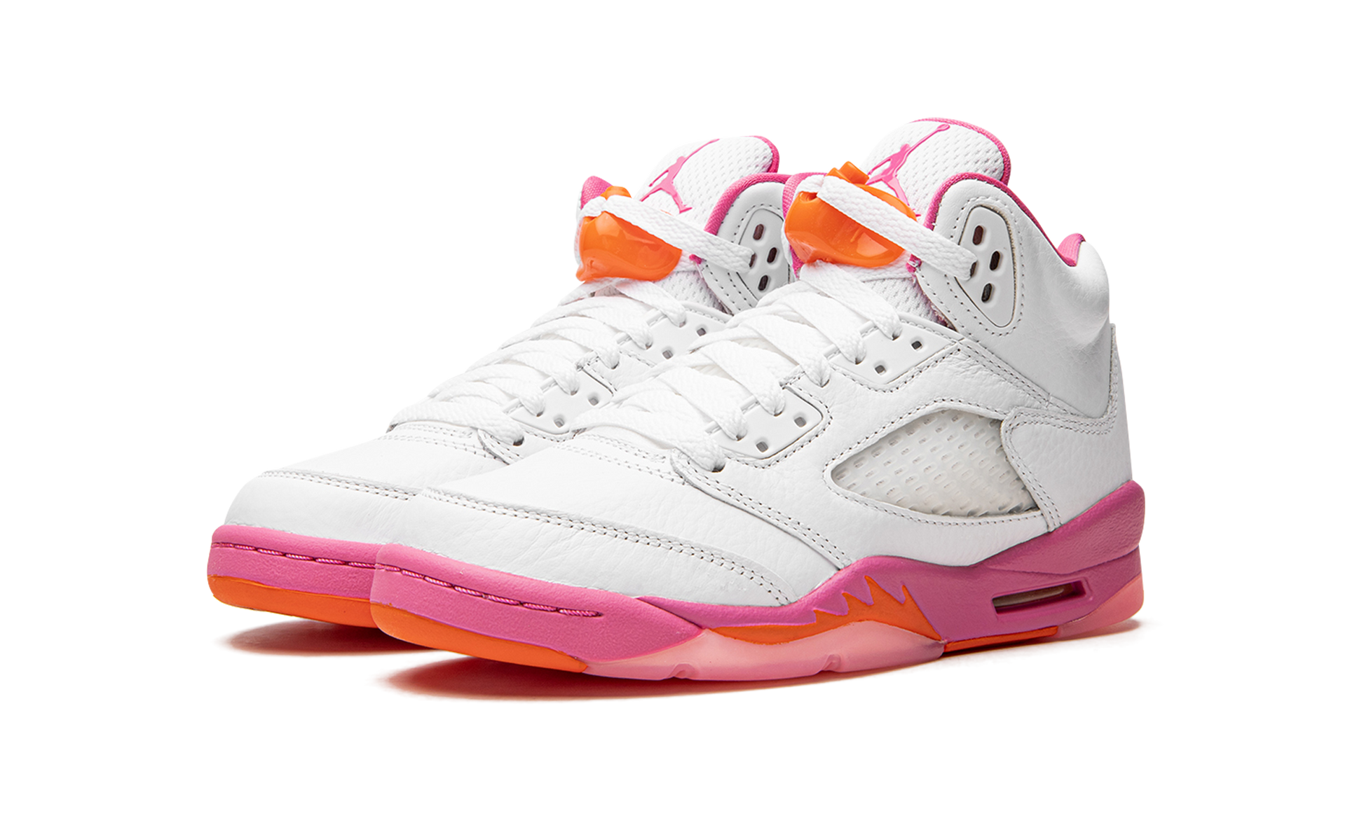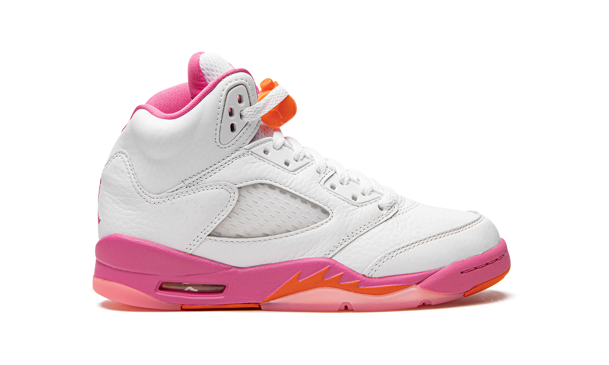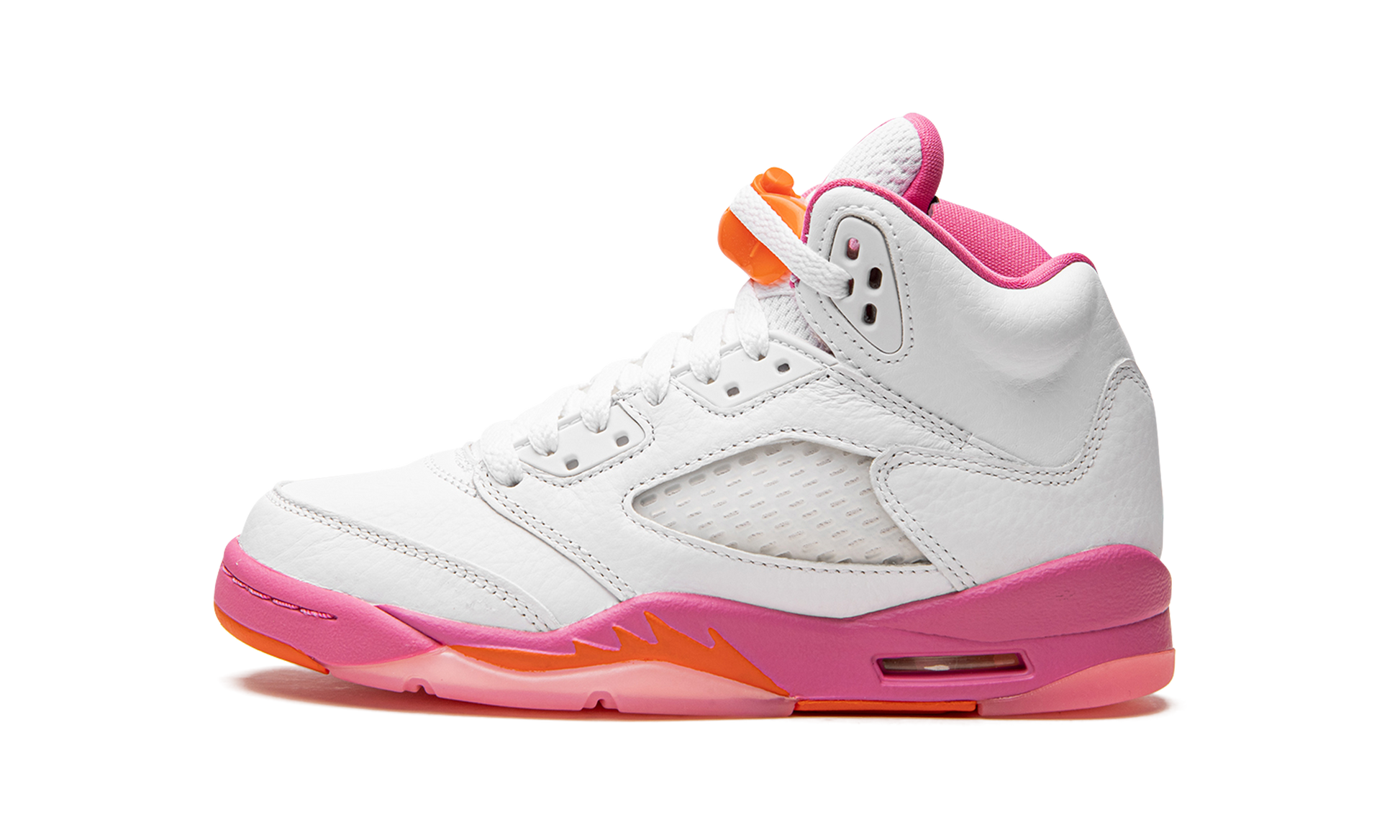 The Air Jordan 5 GS “Pinksicleâ€?is the youth sizing of Michael Jordan's fifth signature shoe in a casual colorway with a spring and summer vibe. The “Pinksicleâ€?brings a laidback look to the vintage basketball shoe. The shoe's upper is constructed in white leather. Translucent netting appears on the mid-panel and on the tongue. A Pinksicle-colored Jumpman is embroidered on the back of the shoe and on the tongue. An orange lace lock breaks up the design's neutral-based appearance. Orange shark tooth detailing appears on the pink midsole. Release date: July 1. 2022