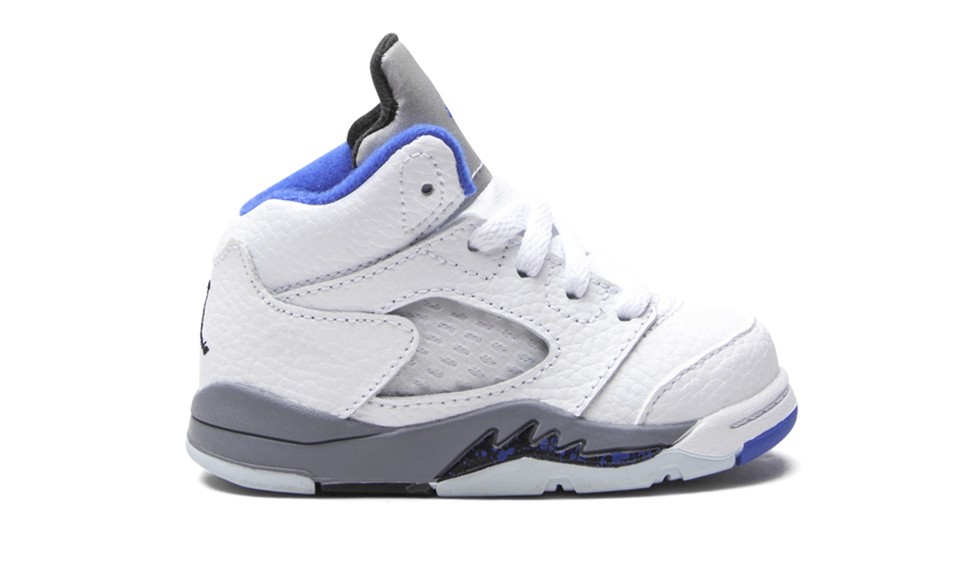 The Jordan 5 TD “Stealth 2.0â€?is the toddler sizing of the popular non-original colorway of Michael Jordan's fifth signature shoe that was originally released in 2006. Brought back with a few modifications in March 2021. the “Stealth 2.0â€?is similar to the original design in that both versions feature a white leather upper with translucent netting on the tongue and mid-panel. The “Stealth 2.0â€?displays a black embroidered Jumpman on the heel. differing from the blue Jumpman on the original '06 release. Both colorways feature a grey midsole. but the new “Stealth 2.0â€?includes black “shark toothâ€?detailing speckled with blue. The original “Stealthâ€?has a solid blue shark tooth pattern on the midsole. Release date: March 27. 2021.