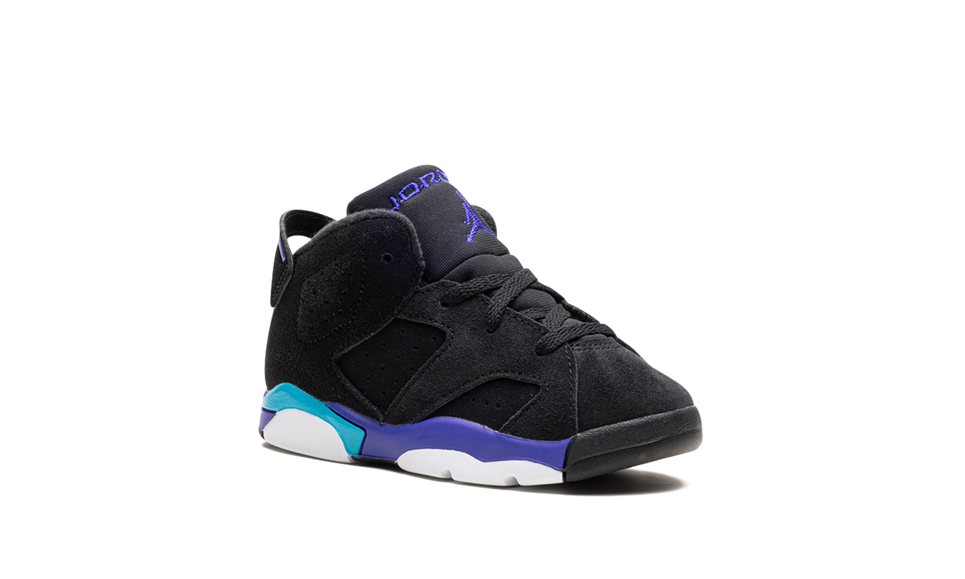 The Air Jordan 6 TD "Aqua" is the toddler sizing of the retro basketball shoe in a classic Air Jordan colorway. The shoe in question is the Air Jordan 8 “Aqua.â€?an original colorway of the model that was worn by Michael Jordan during the 1993 NBA All-Star Game. Jordan Brand transfers the Jordan 8 “Aqua'sâ€?color scheme onto the Jordan 6 by featuring the shoe's Bright Concord and Aquatone accents on the midsole. As for the rest of the shoe. the upper is constructed in black synthetic nubuck. A Bright Concord Jumpman is embroidered on the tongue while a teal Jumpman is seen on the purple lace toggle. On the back. a black spoiler with Aqua accents completes the look. Release date: October 7. 2023