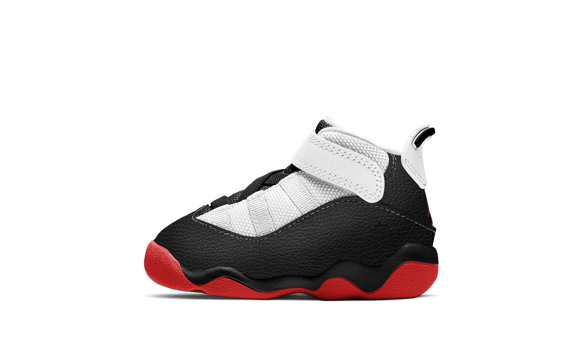 Get your little one court-ready in the iconic Jordan 6 Rings TD "He Got Game." This toddler shoe pays homage to the six championship sneakers Michael Jordan wore. The legendary black. white. and True Red color scheme adds instant. legendary style to any outfit. Designed with a convenient strap and soft. supportive construction. these miniature kicks provide easy on-and-off access and all-day comfort for your future superstar. It's the perfect blend of Jordan history and toddler-friendly wearability.