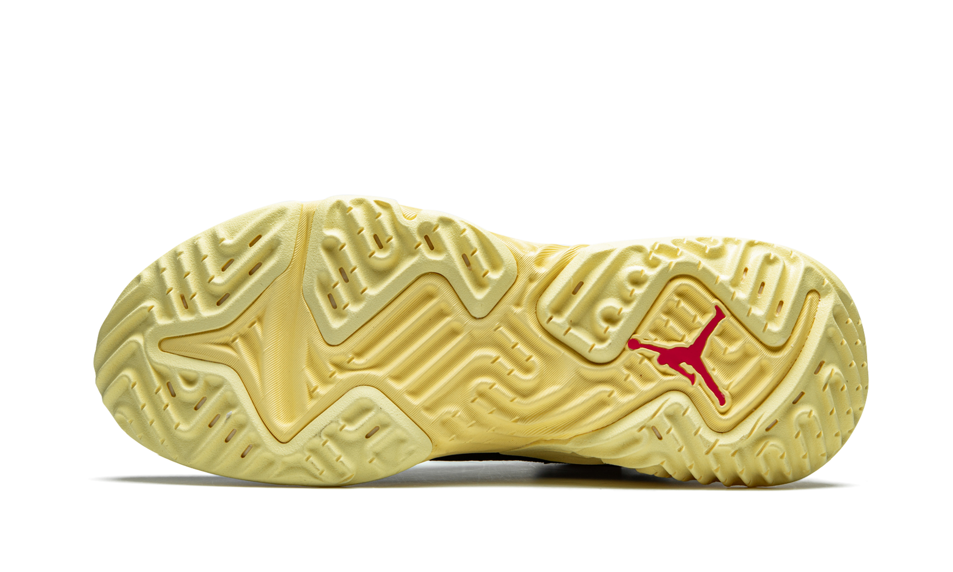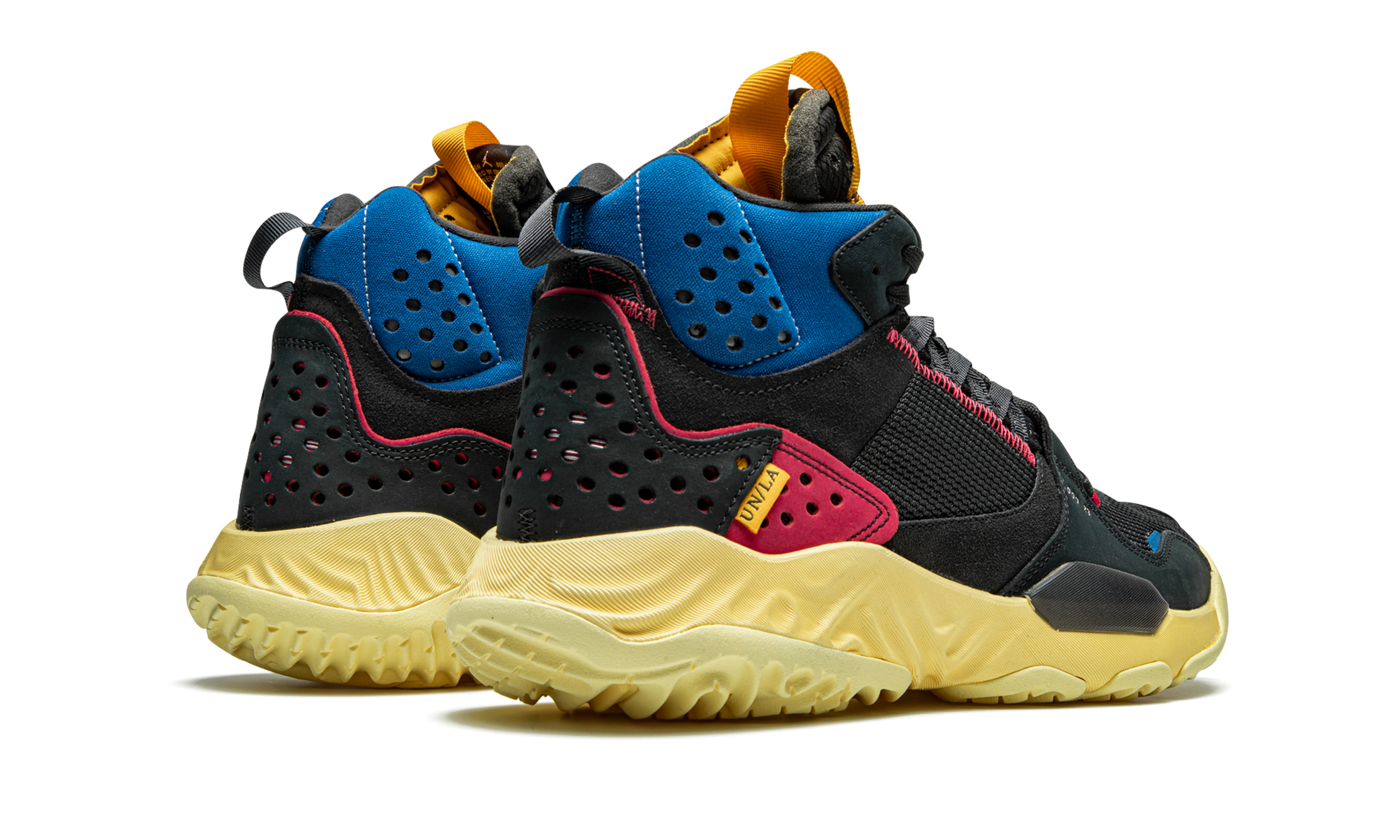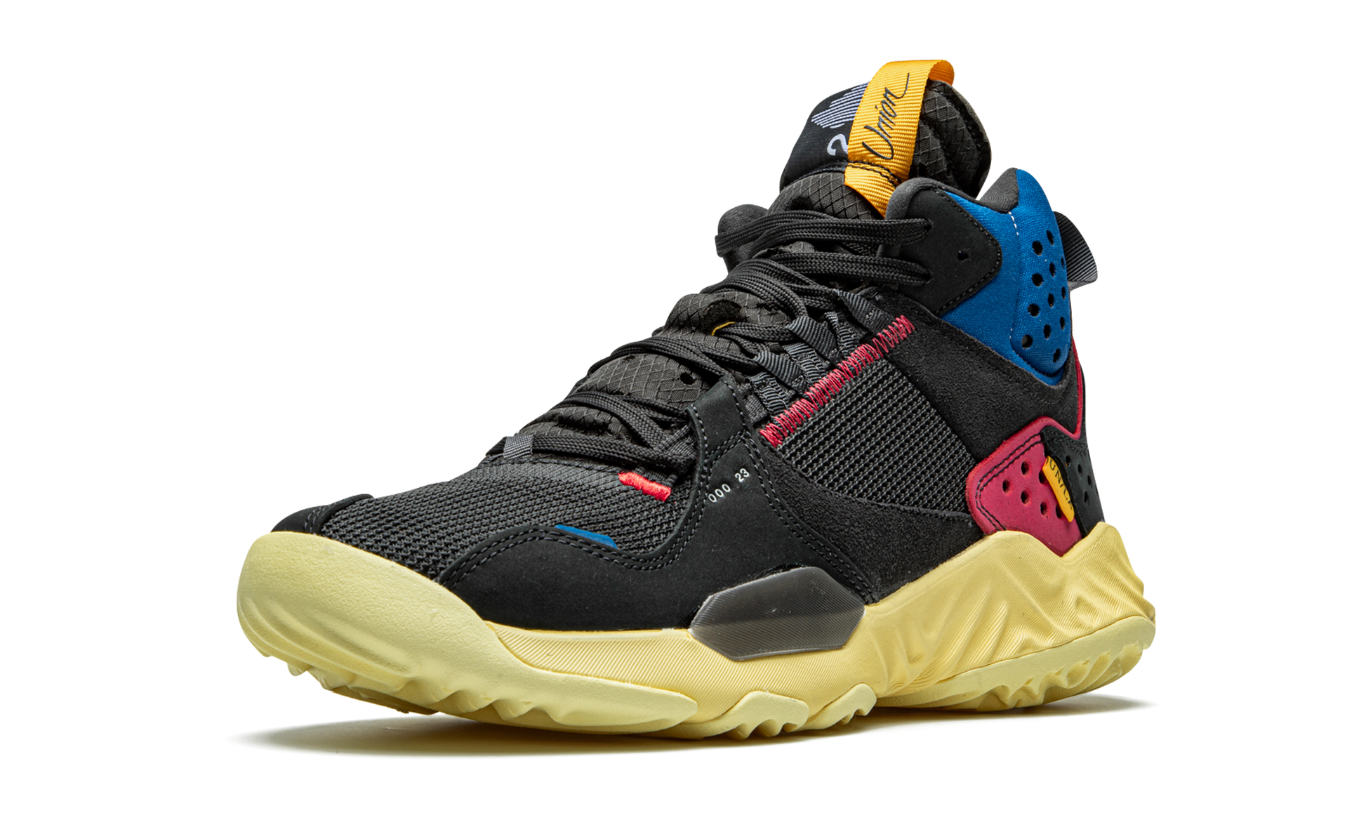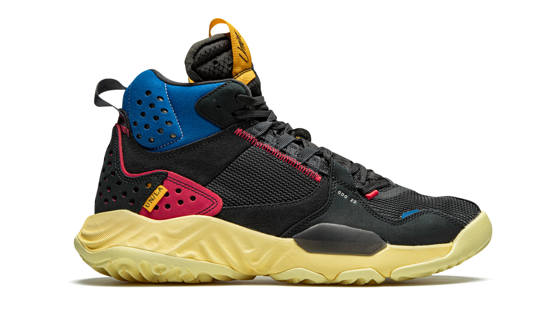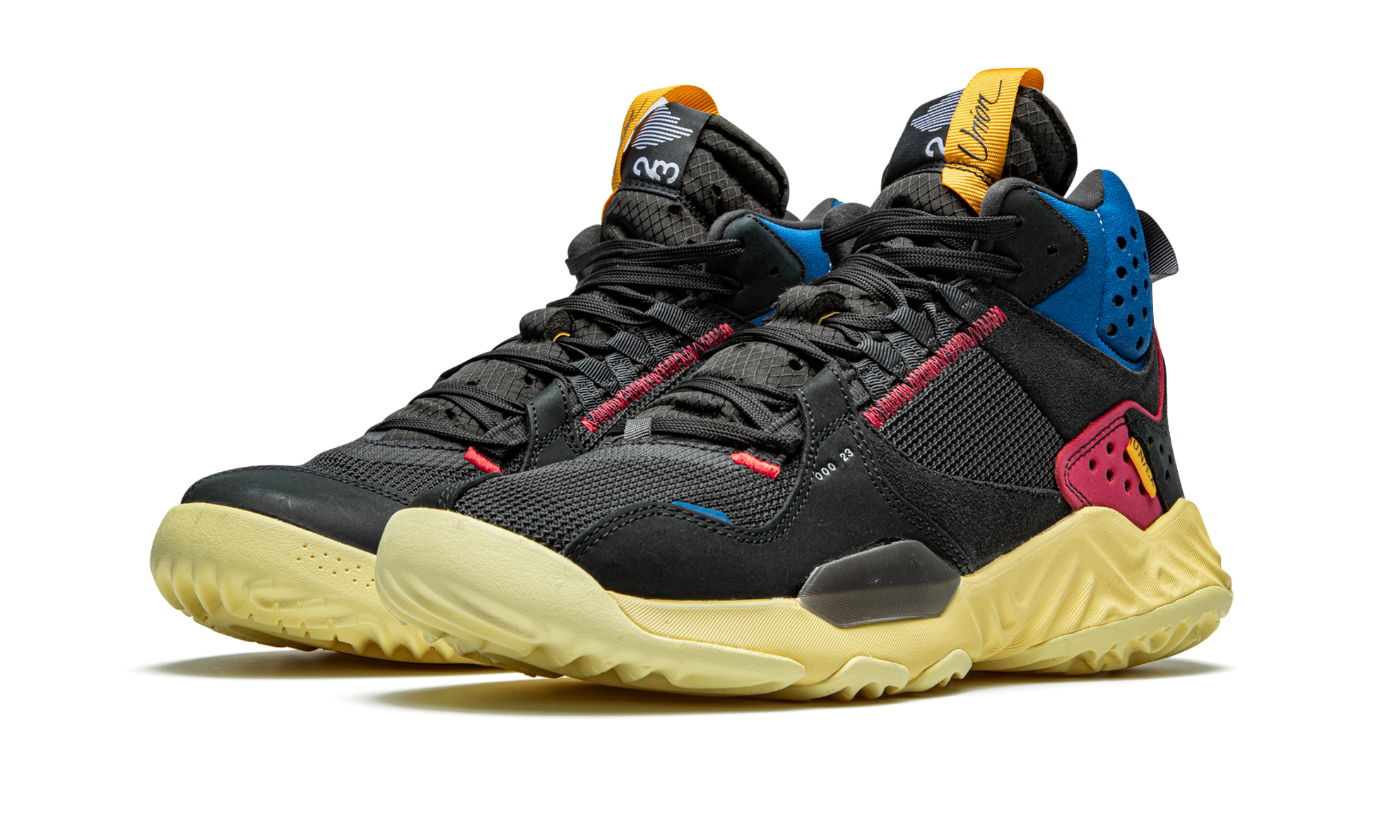 The Union x Jordan Delta Mid SP “Off Noirâ€?is one of several models and colorways included in the high-profile collaboration between the Los Angeles fashion boutique and Jordan Brand. A rare silhouette. the Jordan Delta Mid is finished off in the “Off Noirâ€?design that also appears on Union's rendition of the Air Jordan 4 from the same “Sophomore Album Collection.â€?Like that shoe. the mid-top seen here features a mixture of materials and colors. Panels of Off Noir suede appear on the mid-panel and collar. Black mesh detailing dots either side of the upper. as well as the toe. Exposed red contrast stitching is located beneath the eyelets. Additional red detailing appears on the perforated overlay on the quarter panel. Union incorporates blue perforated suede on the collar and adds an orange “Unionâ€?nylon tag to the tongue. The yellow ribbed midsole brings a vintage inspired element to the look of the shoe. a design feature that many of Union's Jordan collaborations have displayed since 2018. Release date: September 30. 2020.
