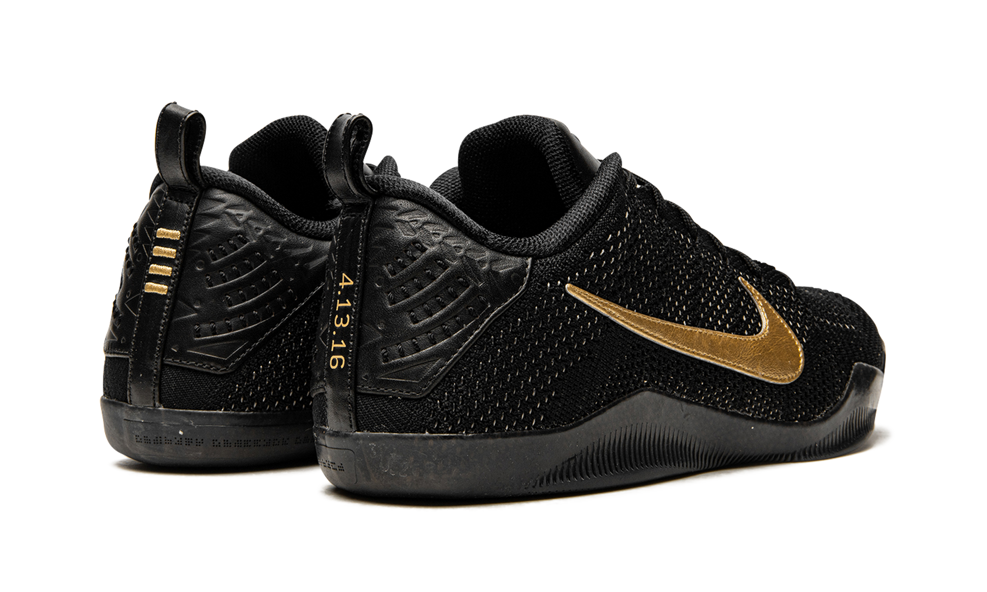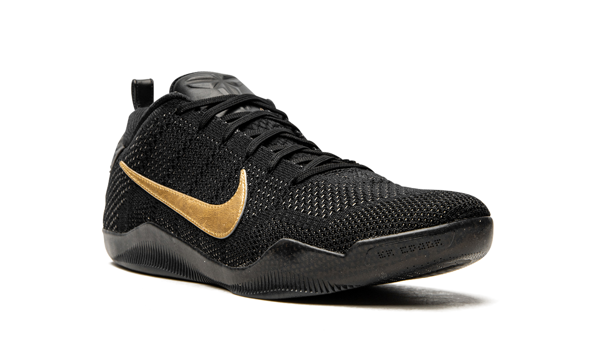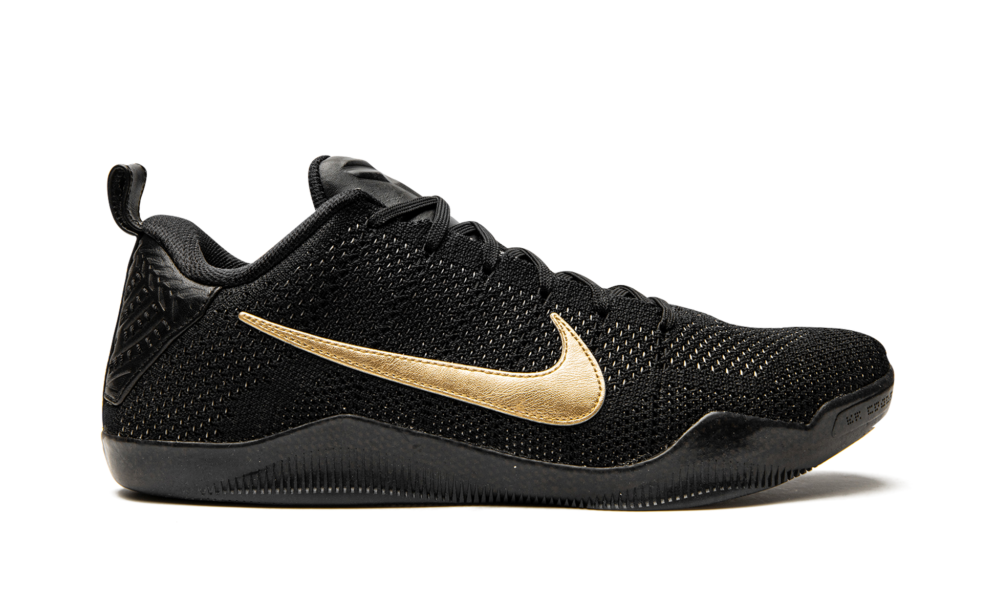 This special limited edition of the Nike Kobe 11 was included in Nike's “Fade to Blackâ€?collection of Kobe Bryant signature sneakers commemorating his final season. Beginning with a cream white color for the Nike Kobe 1. each Kobe model within the collection slowly transitioned to grey and then black. As the Kobe 11 was his final signature model at the time. it's the one that received a pure black look.The entire upper and sole are black. while metallic gold Swooshes and details on the heels add the perfect touch.