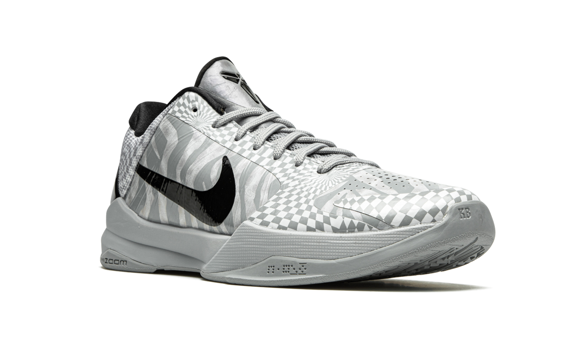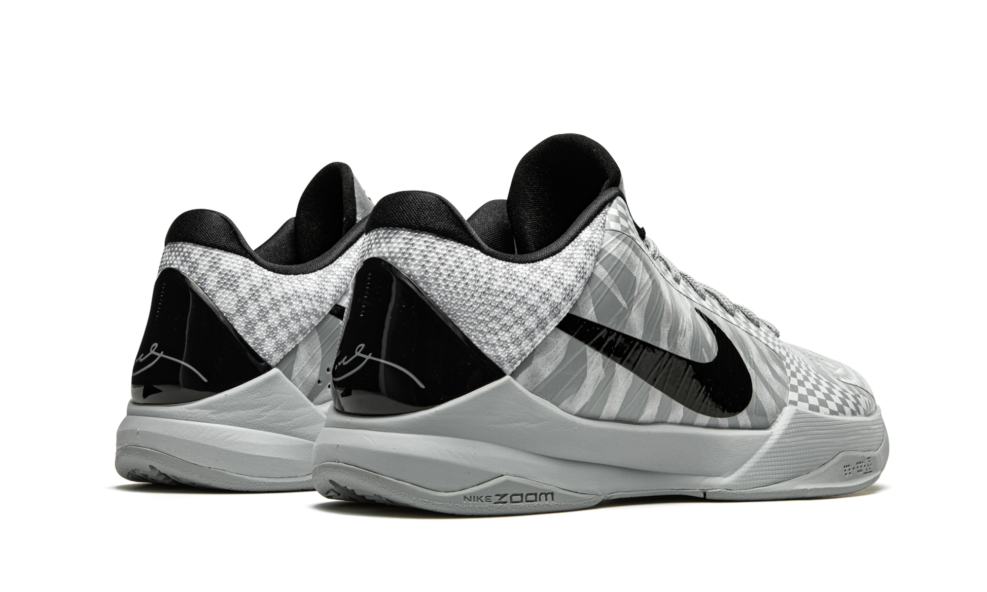 The Nike Kobe 5 Protro “DeMar DeRozan PEâ€?is the player exclusive colorway of Kobe Bryant's signature shoe made for the San Antonio Spurs' shooting guard. This releases is one of several player exclusive Nike Kobe 5 Protro designs released by Nike Basketball in Fall 2020. A multidirectional checkerboard pattern in Wolf Grey and black appears on the forefoot. toe. and eyelets. A zebra-like pattern in the same color scheme can be found on the mid-panel. A black Swoosh can be found on either side. Additional design elements include grey mesh around the collar and heel. a black heel cup with Bryant's signature. and black Mamba detailing on the tongue. Nike's Zoom Air cushioning technology is embedded within the forefoot and heel and provides top level comfort. Release date: September 18. 2020.