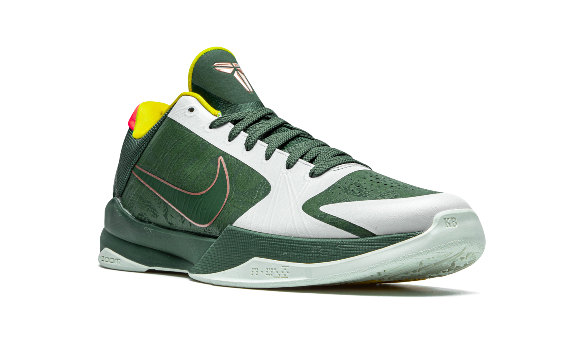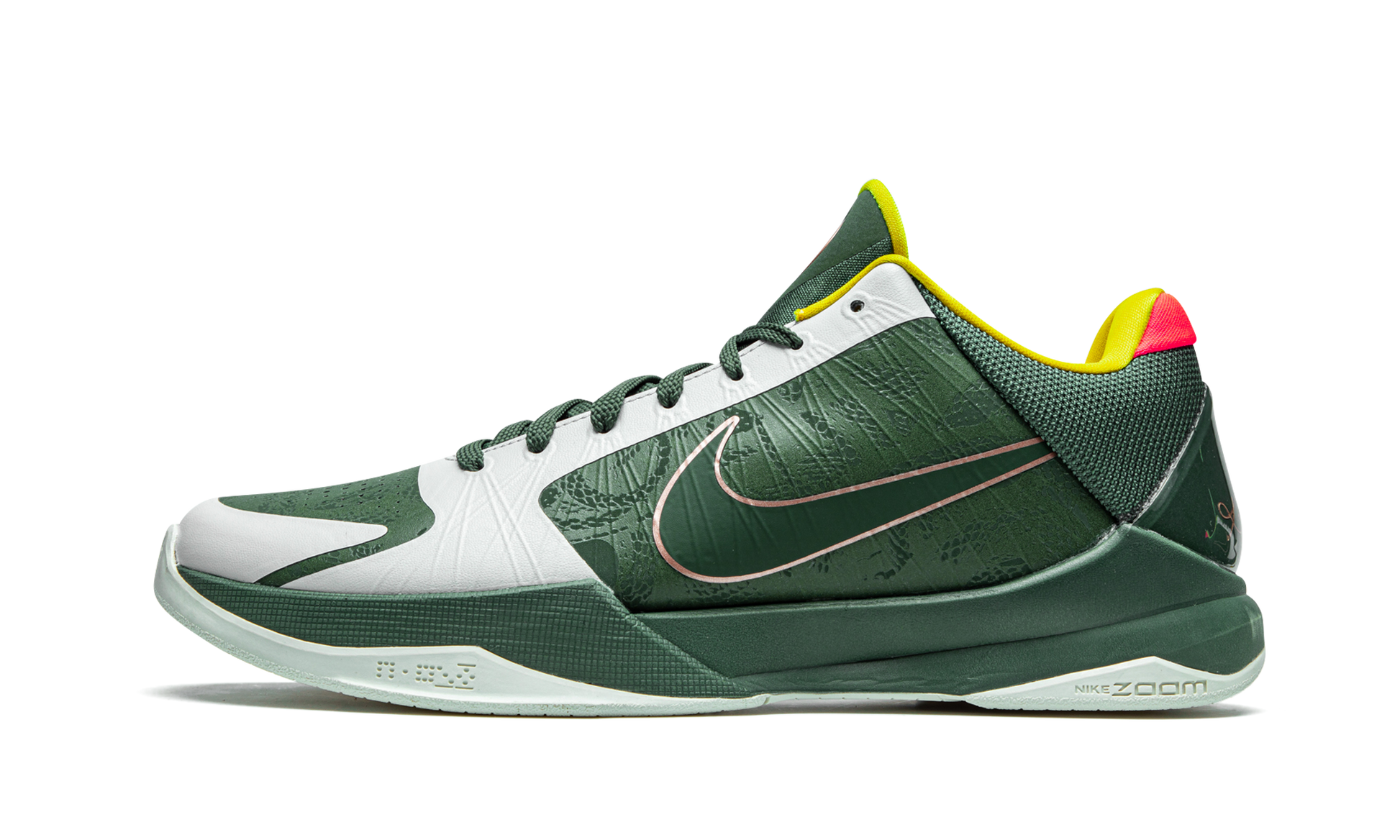 The Nike Kobe 5 Protro “EYBLâ€?is a unique colorway of Kobe Bryant's fifth signature shoe with Nike Basketball that is inspired by Greek mythology. A Summer 2020 release that coincided with Mamba Week. the “EYBLâ€?design summons the energy of the mythical Medusa. who was known to stun her opponents unexpectedly. The upper of the shoe features Forest Green leather in a snakeskin like pattern on the perforated toe and mid-panel. Contrasting light grey overlays on the forefoot. toe. and eyelets break up the appearance. Tonal green mesh detailing is located on the padded ankle collar. A shiny green synthetic heel cup with Bryant's signature in bronze adds to the appealing look of this colorway. Other details include hits of yellow and red on the liner and heel tab. respectively. Nike's “EYBLâ€?insignia appears on the green nylon tongue. A bronze Swoosh outline dots either side of the upper. Zoom Air cushioning technology is inside of the sole and provides the wearer with ample amounts of comfort whether on or off the court. Release date: August 29. 2020.