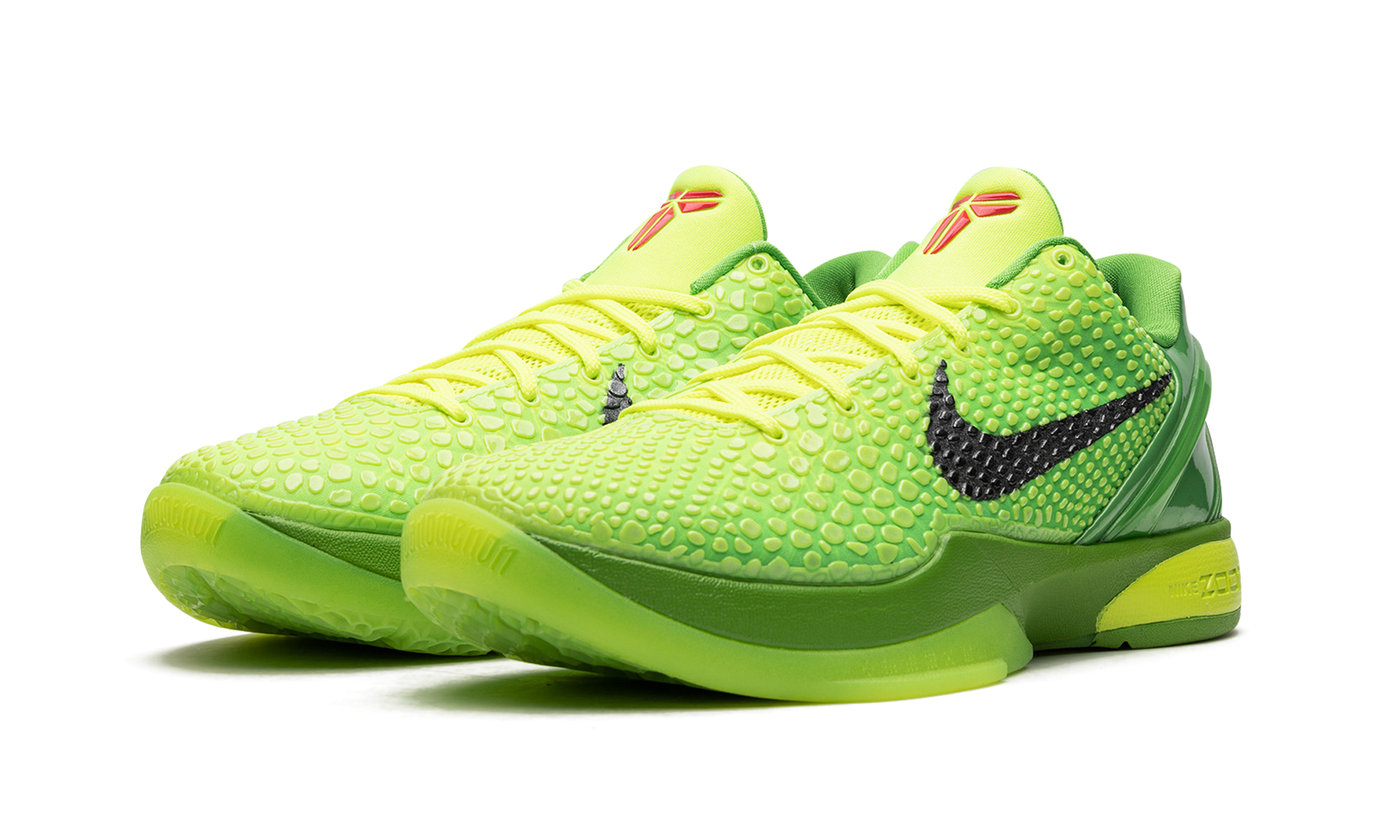 The Nike Kobe 6 “Grinch - Storyteller Collectionâ€?is a special collector's edition of the popular colorway from Kobe Bryant's signature shoe collection with Nike. Originally debuted by Bryant on December 25. 2010 during the Los Angeles Lakers vs. Miami Heat showdown. the Nike Kobe 6 “Grinchâ€?was brought back by Nike a decade later as the model's first retro re-release. The updated version of the design modeled after the grumpy Dr. Seuss character features the same scaly snake-inspired electric green upper as the OG “Grinchâ€?colorway. Other details include a molded heel for stability. black Swoosh detailing on either side. and Bryant's “Sheathâ€?logo in red on the green nylon tongue. Per the original spec. Nike places its performance Zoom Air cushioning technology in the midsole for unparalleled comfort on or off court. The “Storyteller Collectionâ€?comes with special packaging and set of books.