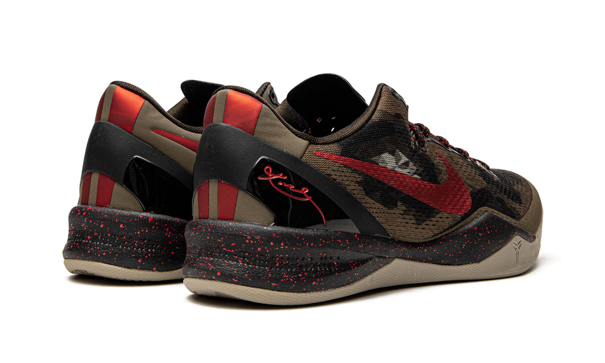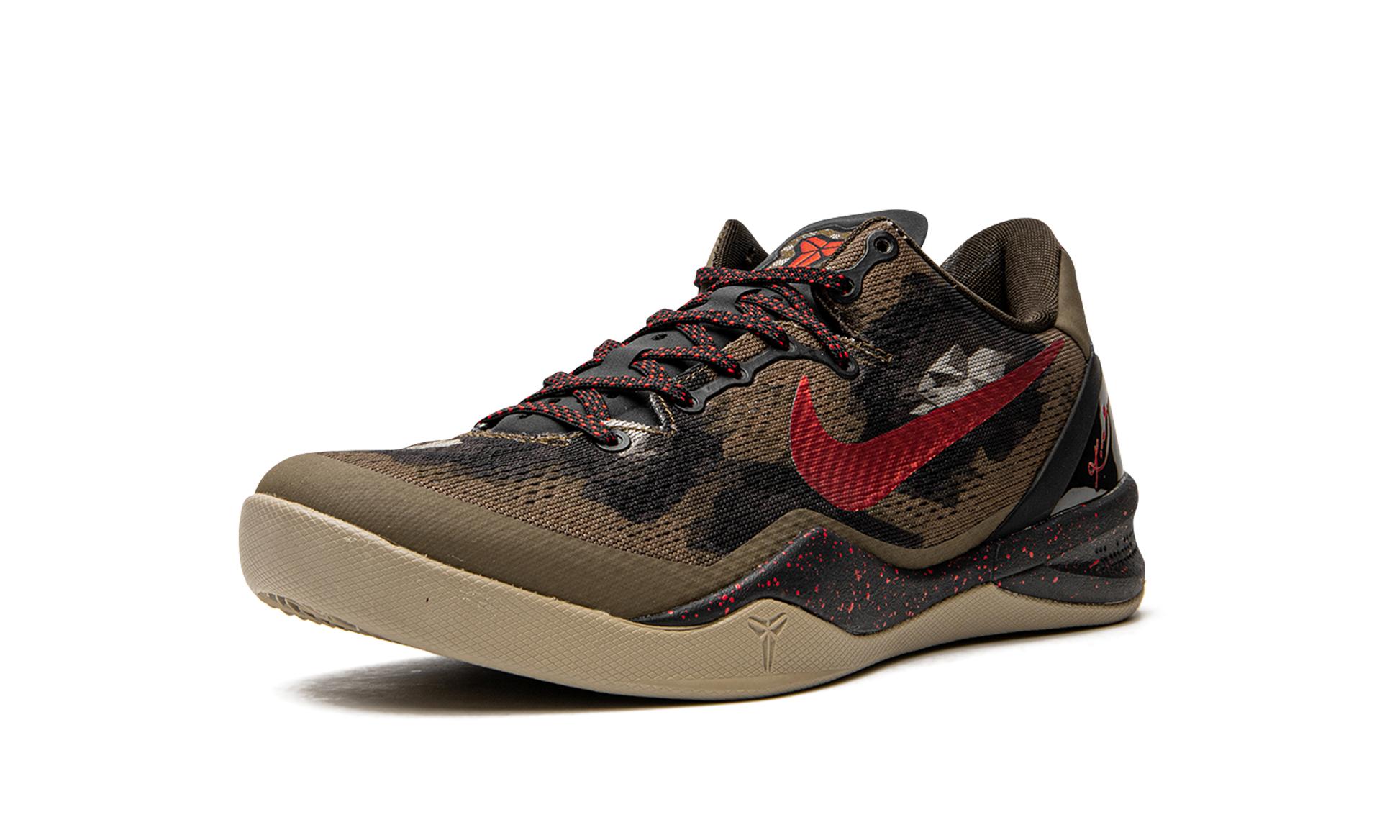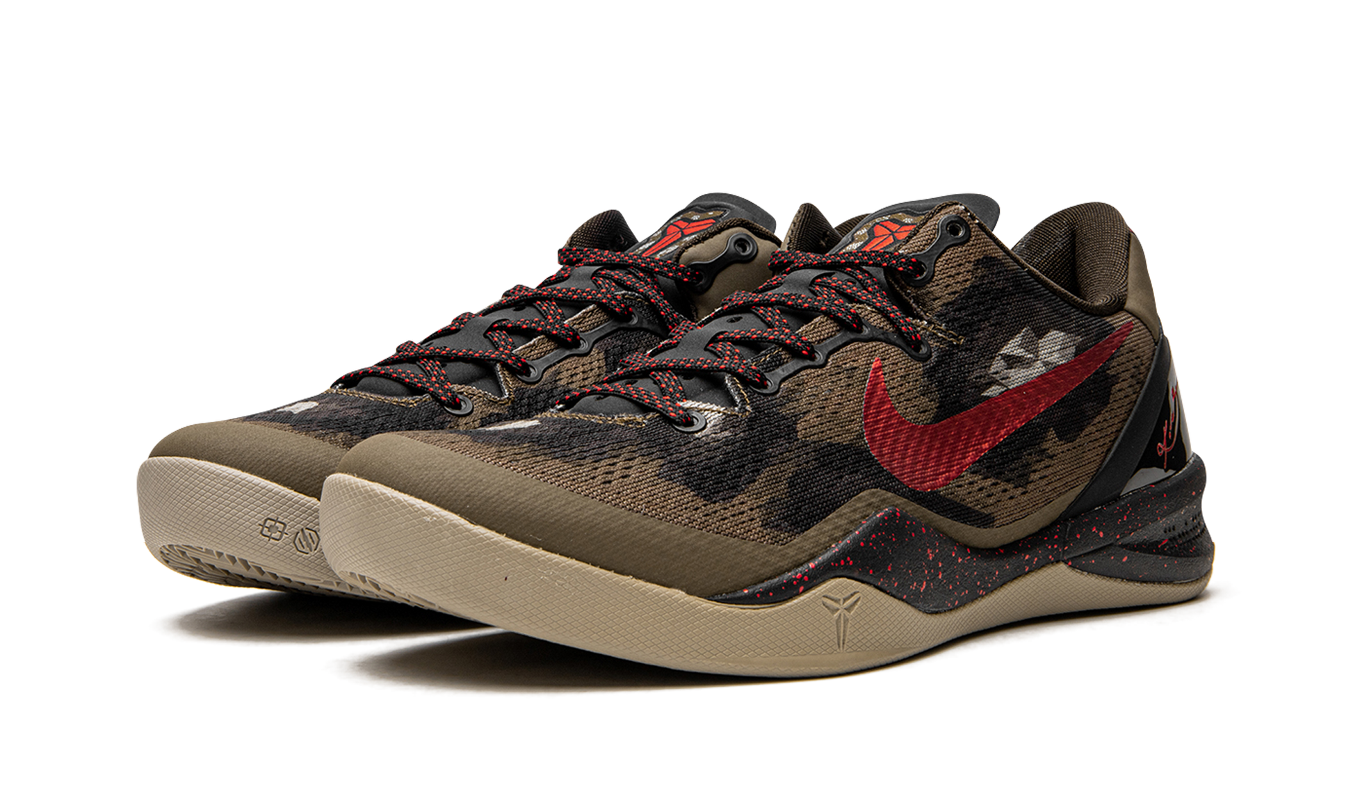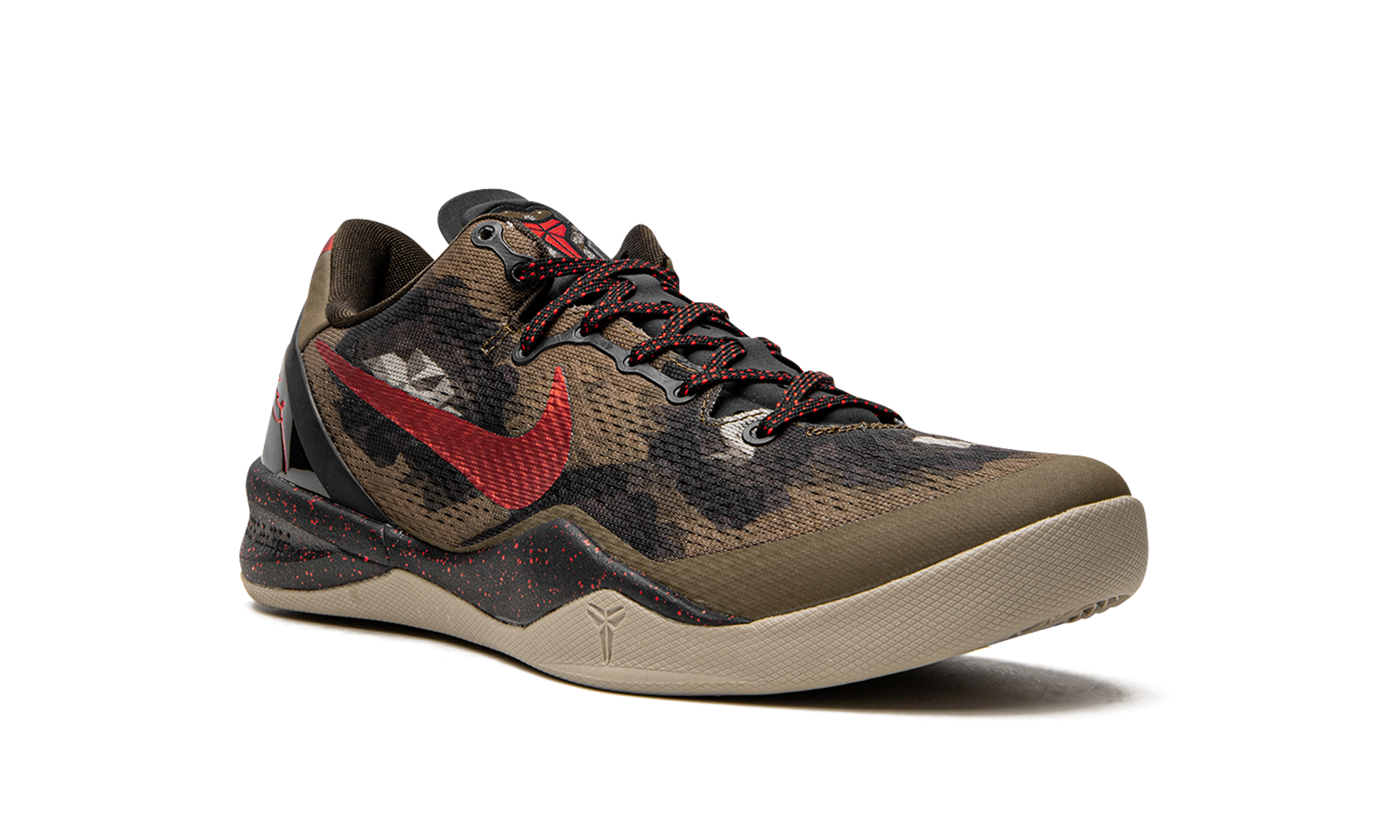 The high-performance Nike Kobe 8 is featured in a “Pythonâ€?colorway. with a snakeskin-like graphic upper in olive green. black. and red.