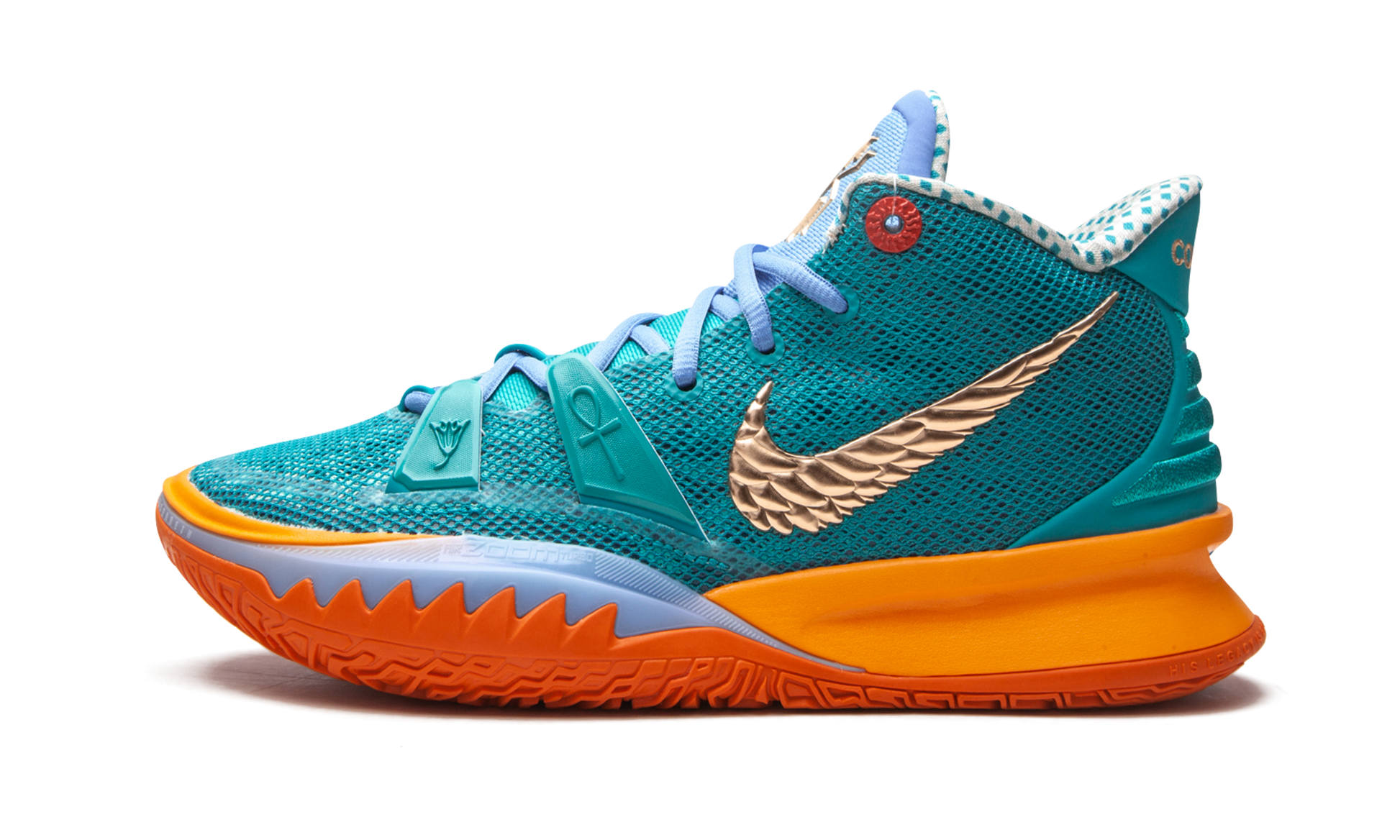 The Concepts x Nike Kyrie 7 “Horusâ€?is a special edition collaboration between the Boston based sneaker boutique and Nike Basketball on Kyrie Irving's seventh signature shoe in a colorway inspired by the ancient Egyptian god. A May 2021 release. the “Horusâ€?channels the energy of previous Concepts x Nike Kyrie collaborations. notably the Egyptian-themed Nike Kyrie 5 and 6. The upper features an attention-grabbing teal mesh construction. An “Eye of the Raâ€?design appears on the medial side and a gold Swoosh appears on the lateral side of the shoe. Gold “Conceptsâ€?embroidery is stitched onto the heel. Dual “Kyrie Irvingâ€?and “Conceptsâ€?branding can be found on the light blue mesh tongue of the left and right shoe. respectively. An icy blue semi-translucent panel appears on the lateral side of the forefoot of the orange foam midsole. Release date: May 19. 2021.