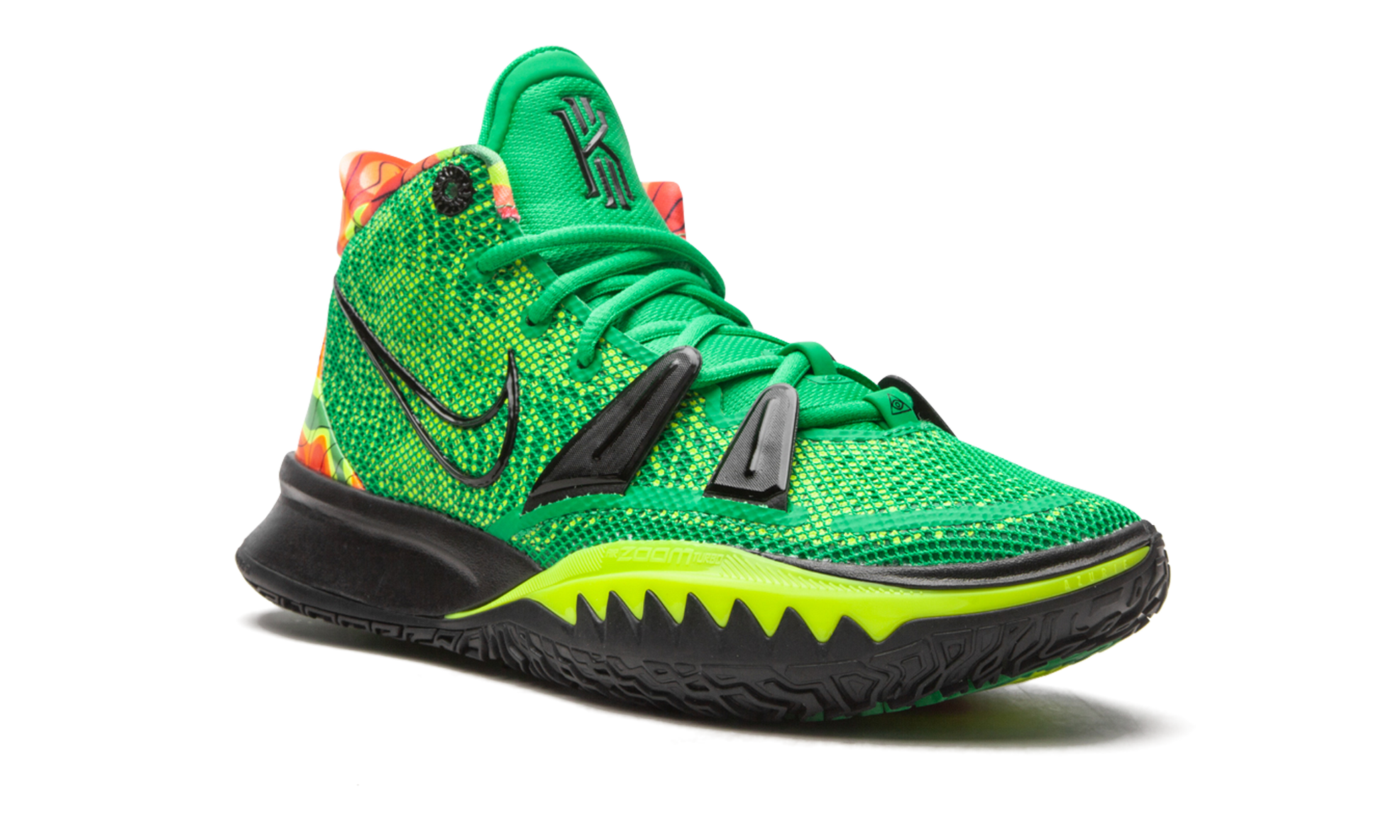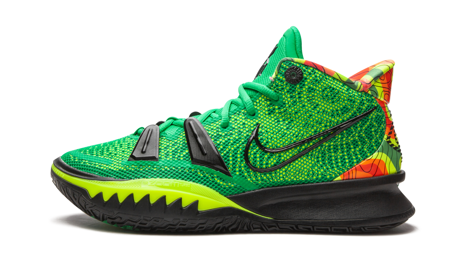 The Nike Kyrie 7 “Weathermanâ€?is a April 2021 colorway of Kyrie Irving's seventh signature shoe that draws inspiration from the popular design that first appeared on Kevin Durant's Nike KD 4. Originally released in 2011. the Nike KD 4 “Weathermanâ€?saluted Durant's childhood love of meteorology. Here. the “Weathermanâ€?appears on Durant's good friend Kyrie Irving's signature basketball shoe as a continuation of the colorway's legacy. The upper features a green and yellow mesh construction with a multicolor heat map pattern on the heel. A black outline Swoosh graces both sides and black synthetic lace holders on the forefoot support the lacing system. Kyrie's signature logo with Nike can be found on the green mesh tongue. Overall. although the two “Weathermanâ€?colorways aren't identical. the modern Nike Kyrie 7 edition absolutely stands up to the OG style that first appeared on the Nike KD 4. Release date: April 8. 2021.