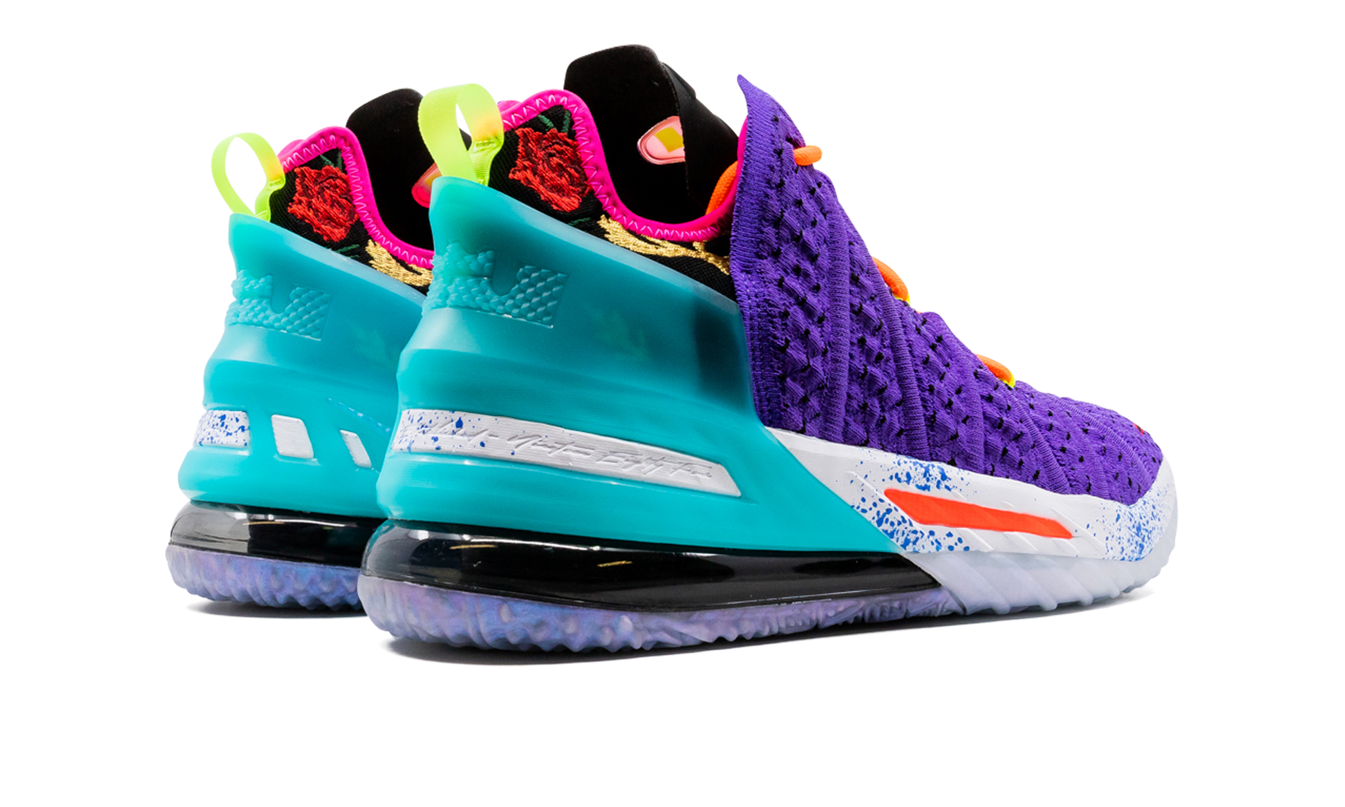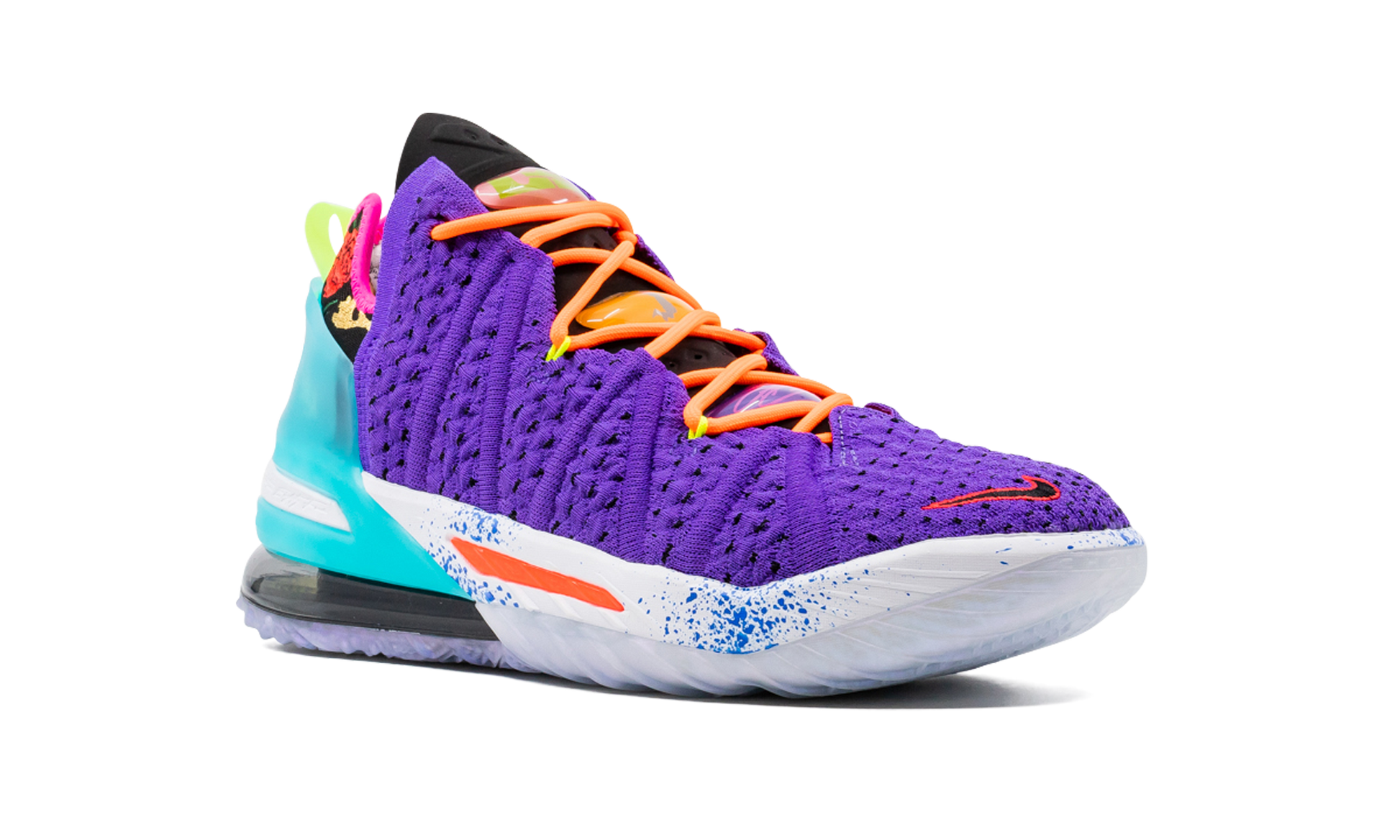 The Nike LeBron 18 “Best 10-18â€?is a “What Theâ€?inspired makeup of LeBron James's eighteenth signature shoe with Nike Basketball that was released in Spring 2021. As stated in its nickname. the “Best 10-18â€?edition of the Nike LeBron 18 combines some of the most popular colorways of the models found within the range of the Nike LeBron 10 through the LeBron 18. The upper features a predominantly eye-catching Psychic Purple woven construction with equally vibrant accenting overlays on the tongue and collar. An orange-outlined black Swoosh is embroidered on the toe and a floral motif appears on the sock-like knit collar. LeBron's signature “crownâ€?branding appears on the semi-translucent teal-colored molded heel counter. A smoky semi-translucent Air unit appears in the heel of the blue speckled white foam midsole.