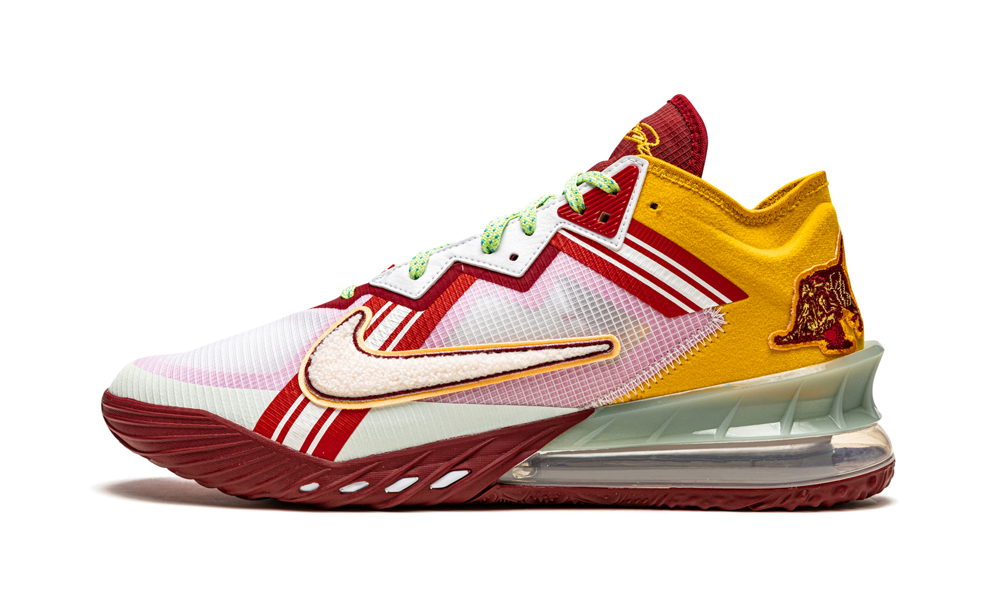 The Mimi Plange x Nike LeBron 18 Low “Higher Learningâ€?is a collaboration between the fashion designer and Nike Basketball on the low-top edition of LeBron James's eighteenth signature shoe. Part of a full scale clothing and footwear collection between Plange and Nike. the “Higher Learningâ€?colorway looks to none other than a varsity jacket for design inspiration. References to the classic outerwear piece come into play on various points on the shoe. The Sail chenille Swoosh and chenille tiger patch on the heel mimic the look of detailing found on the academic staple. A split translucent white mesh and yellow suede construction forms the base of the shoe. LeBron's signature appears in yellow embroidered script on the crimson mesh tongue. Contrasting neon green-and-white speckled laces break up the look. A large clear Air bubble in the heel of the midsole completes the design. Release date: June 2. 2021